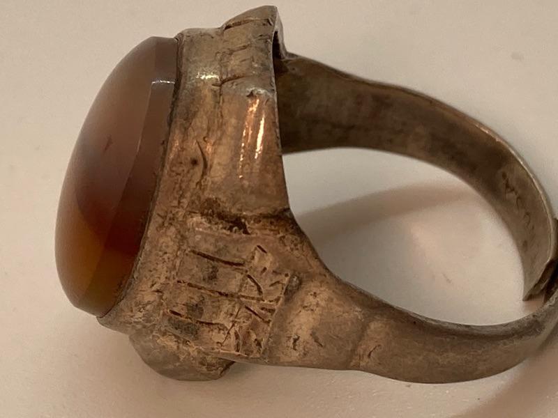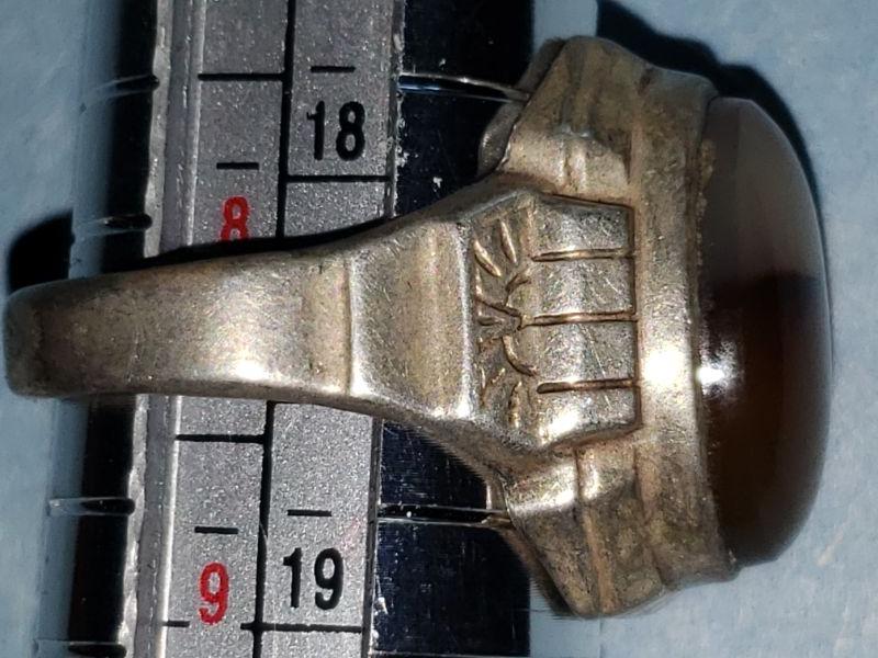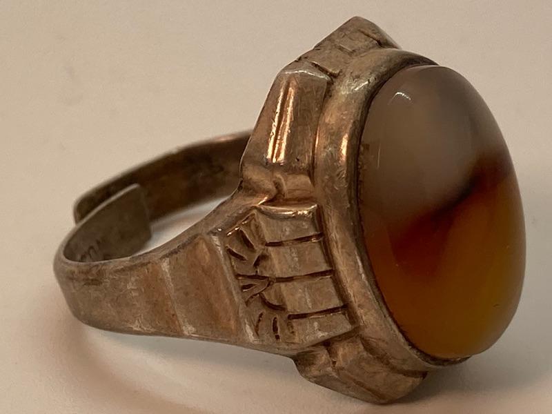 Adjustable, approx. Size 8. Two Tone Vintage Agate Ring stamped Sterling.