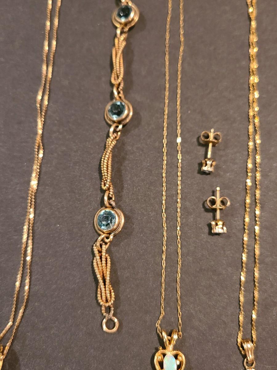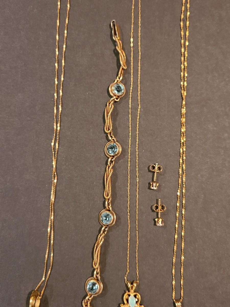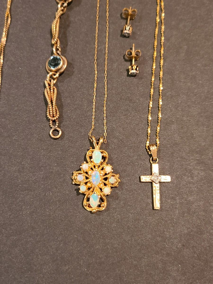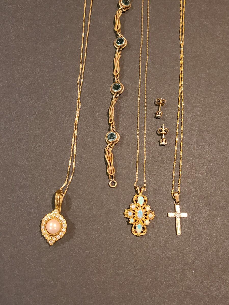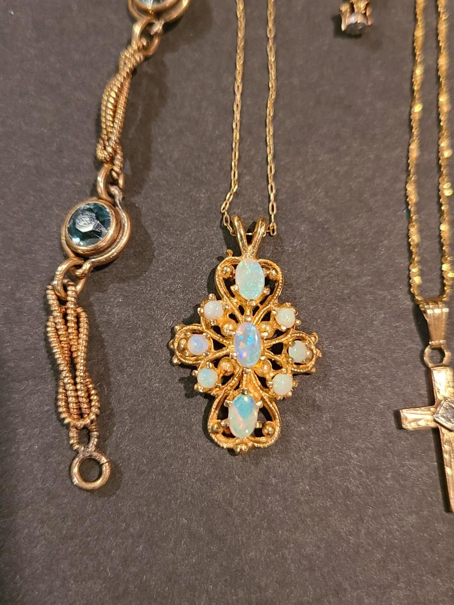 14kt thin delicate gold chains, with unmarked pendants. One is a gorgeous opal pendant with no markings. The vintage bracelet is 1/20 gold filled. The earrings are very small diamond chips. The weight is for everything except the earrings and pendant. Please see all pictures for the content and condition of the items. Lovely lot of delicate jewelry pieces.
