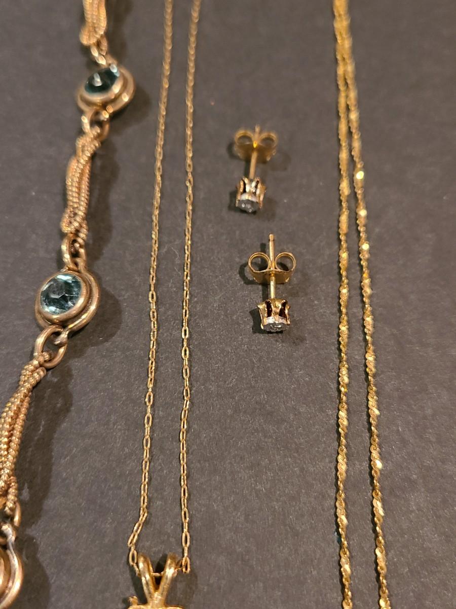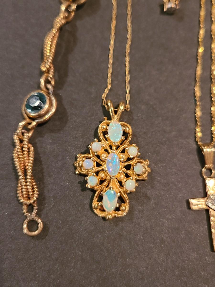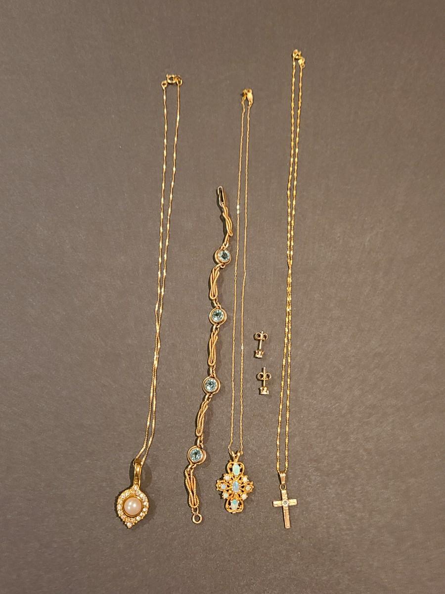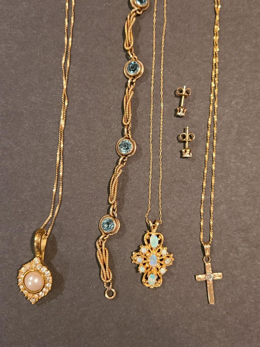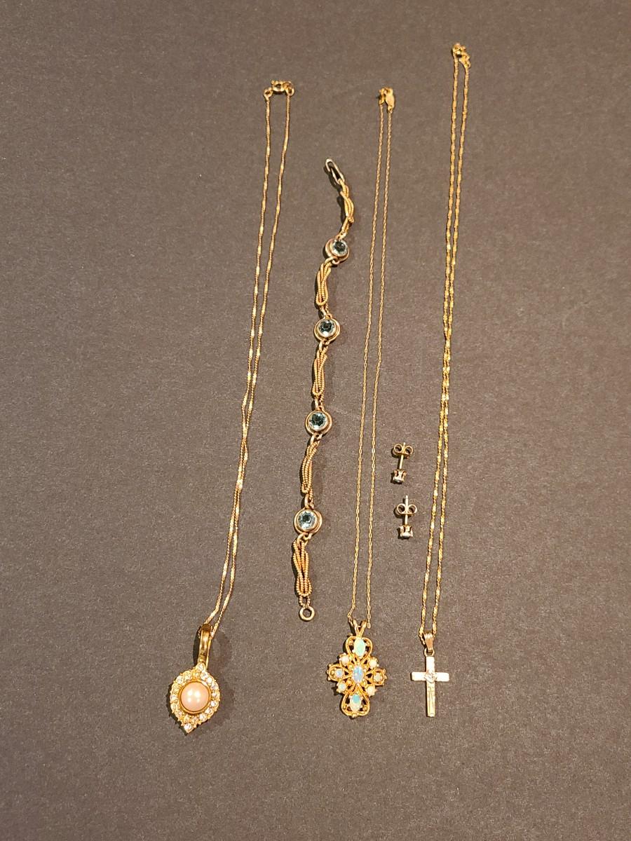14kt thin delicate gold chains, with unmarked pendants. One is a gorgeous opal pendant with no markings. The vintage bracelet is 1/20 gold filled. The earrings are very small diamond chips. The weight is for everything except the earrings and pendant. Please see all pictures for the content and condition of the items. Lovely lot of delicate jewelry pieces.
