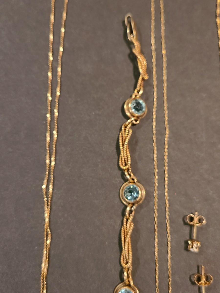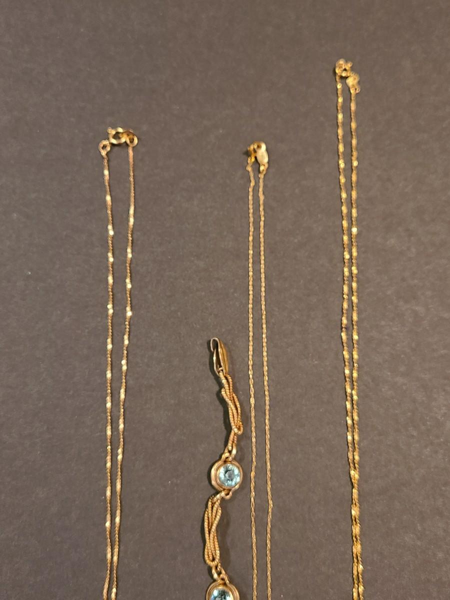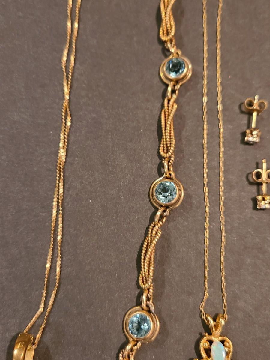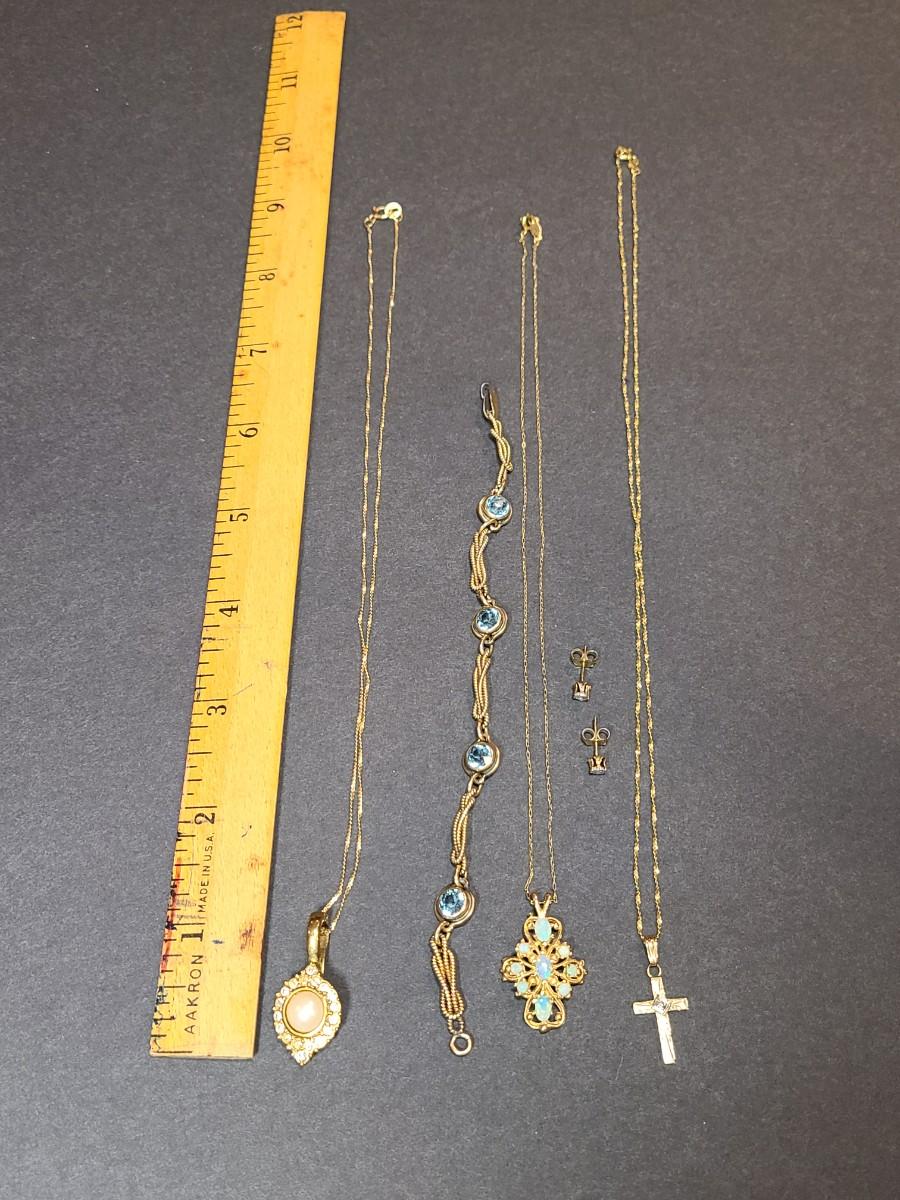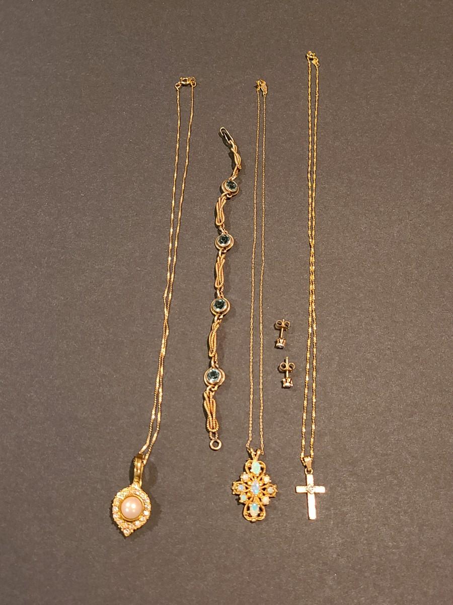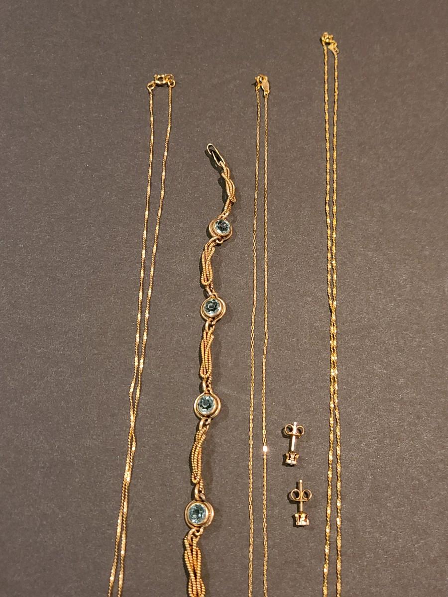 14kt thin delicate gold chains, with unmarked pendants. One is a gorgeous opal pendant with no markings. The vintage bracelet is 1/20 gold filled. The earrings are very small diamond chips. The weight is for everything except the earrings and pendant. Please see all pictures for the content and condition of the items. Lovely lot of delicate jewelry pieces.