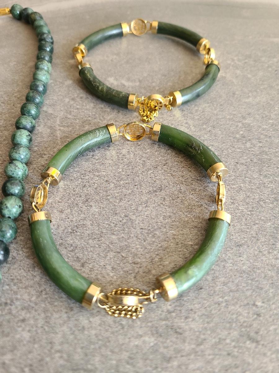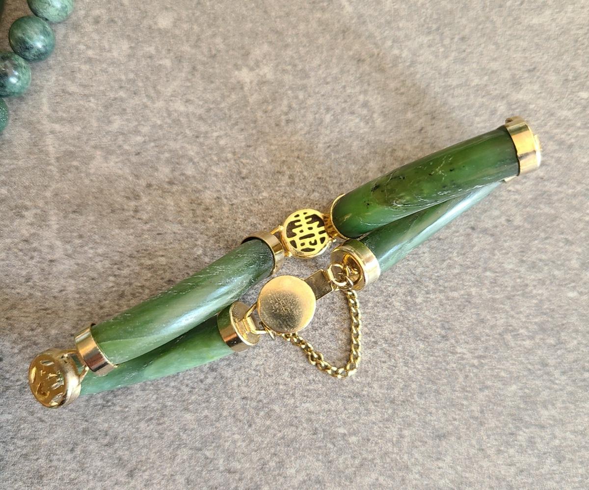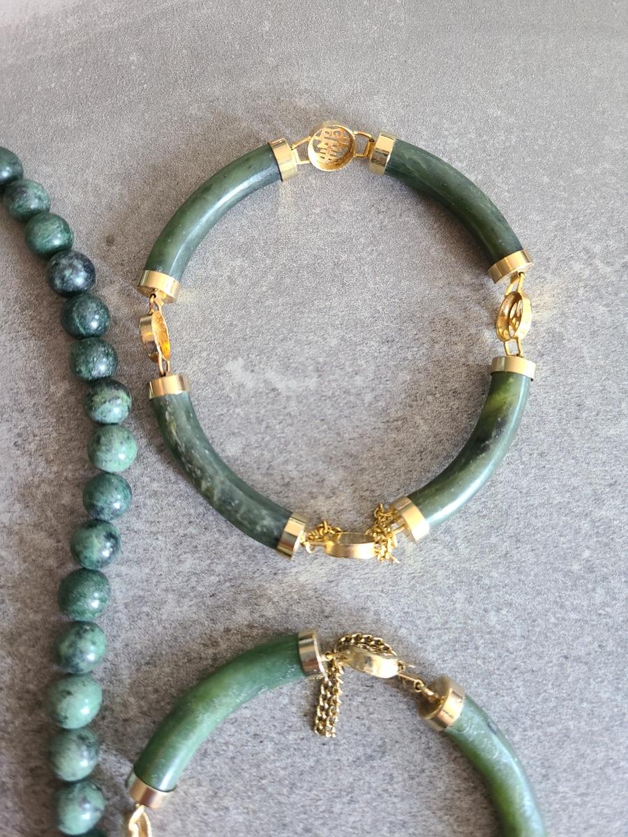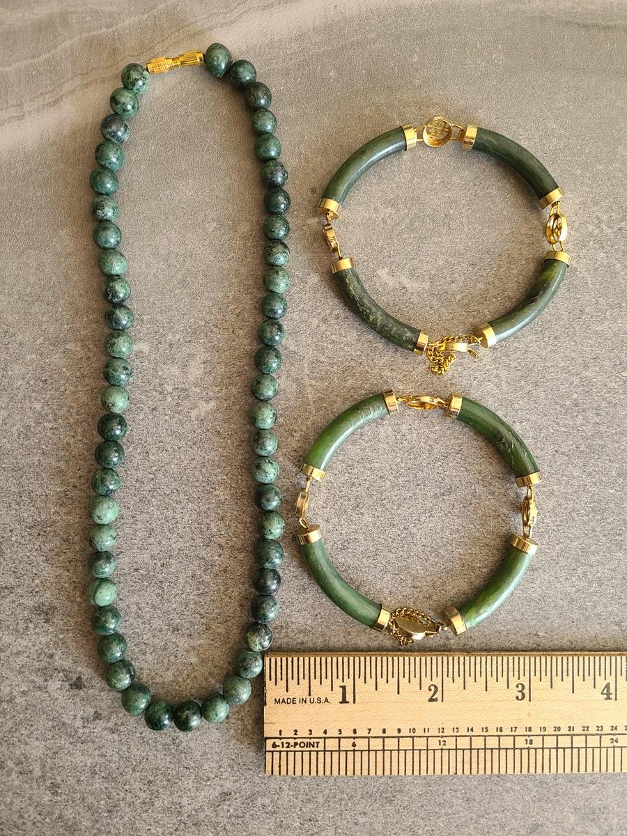 These vintage pieces look to be dark jade or natural stone, and the gold is gold toned, with no marks. Great vintage look! Please see all pictures as they are the best representation of the items. The pictures show condition, measurements if taken, and what is included in the lot. Due to the large amount that we photograph and the time frame, we are not always able to take measurements. All items unless noted, are pre-owned and have been used. If you purchased furniture, you must bring help. We do not allow one person to carry large furniture out on their own. Bring help, tools and a truck for the safety of our client’s homes, and your personal safety. Company policy. Thank you.