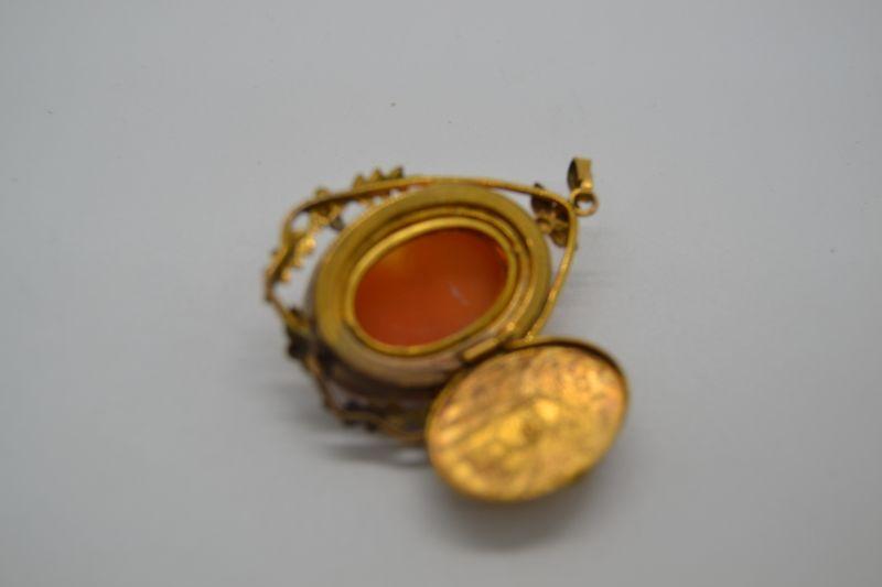 The vintage cameo with secret compartment is 12k gold fill . You are bidding on the item(s) pictured. Good luck and happy bidding!