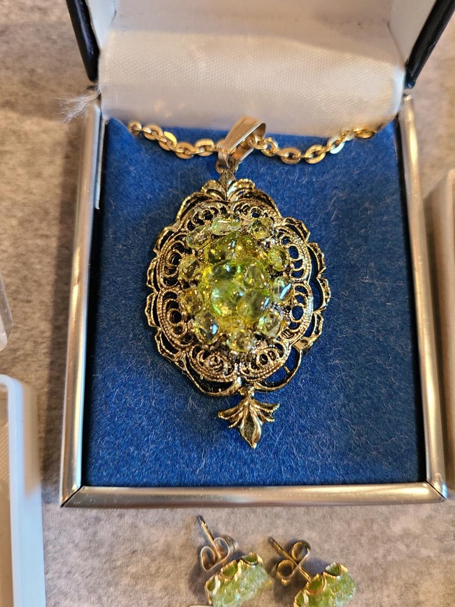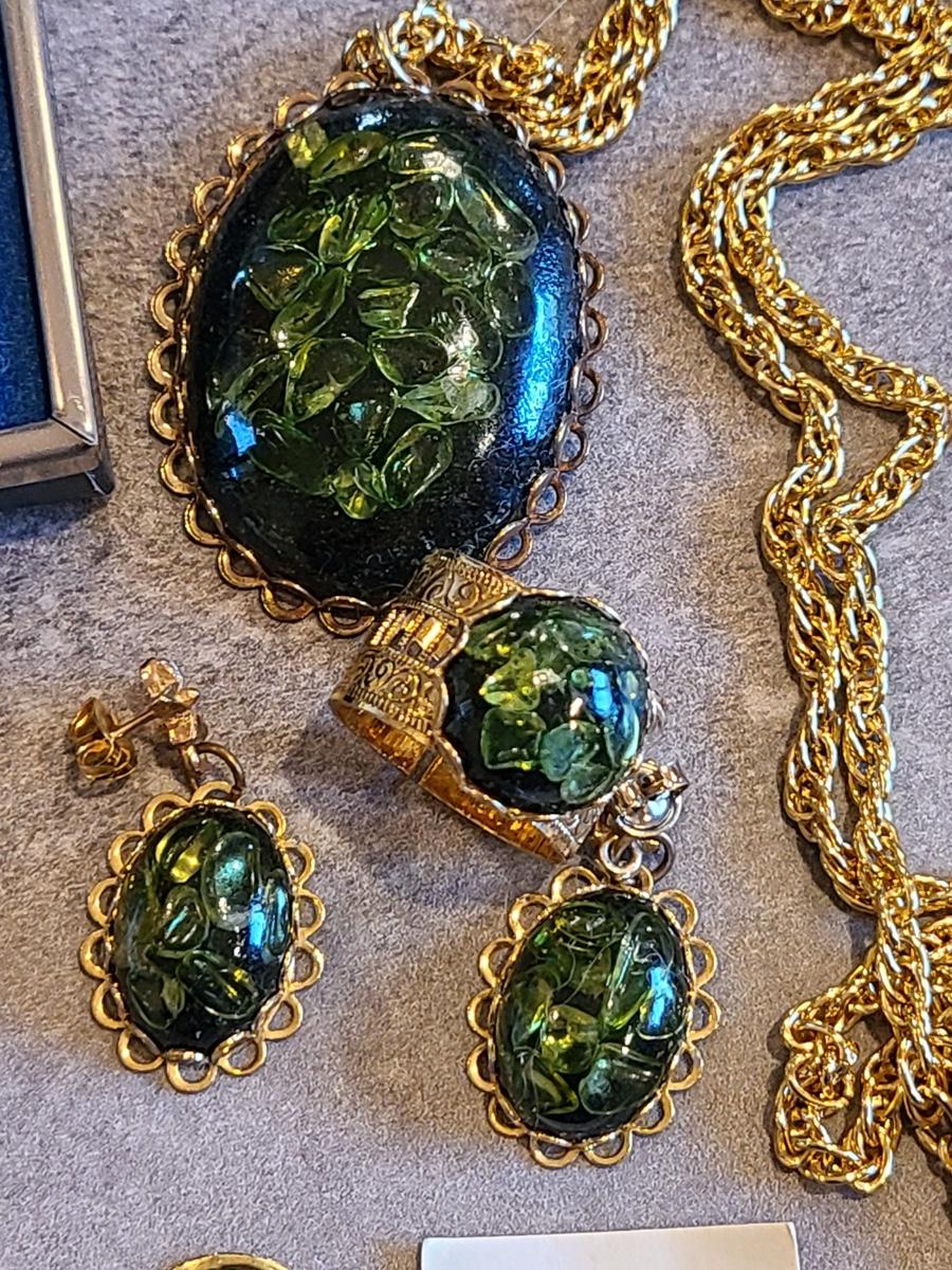 This is a lovely vintage lot of bright green "Lave Fantasia" from Hawaii. Olivine is formed in the volcanoes of Hawaii and is sometimes called the Hawaiin Diamond. Made in Hawaii. The Sigrid tag was in the box with the necklace, but none of the pieces are signed so not sure which set it goes to. Set in gold tone jewelry. Fun lot of costume jewelry in vibrant colors! Please see all pictures as they are the best representation of the items. The pictures show condition, measurements if taken, and what is included in the lot. Due to the large amount that we photograph and the time frame, we are not always able to take measurements. All items unless noted, are pre-owned and have been used. If you purchased furniture, you must bring help. We do not allow one person to carry large furniture out on their own. Bring help, tools and a truck for the safety of our client’s homes, and your personal safety. Company policy. Thank you.