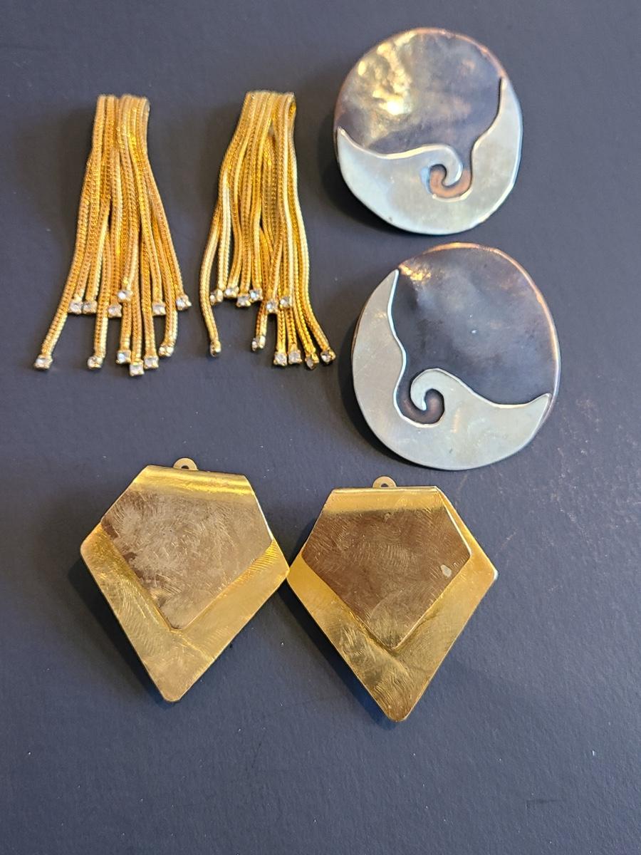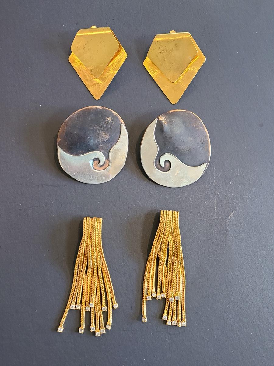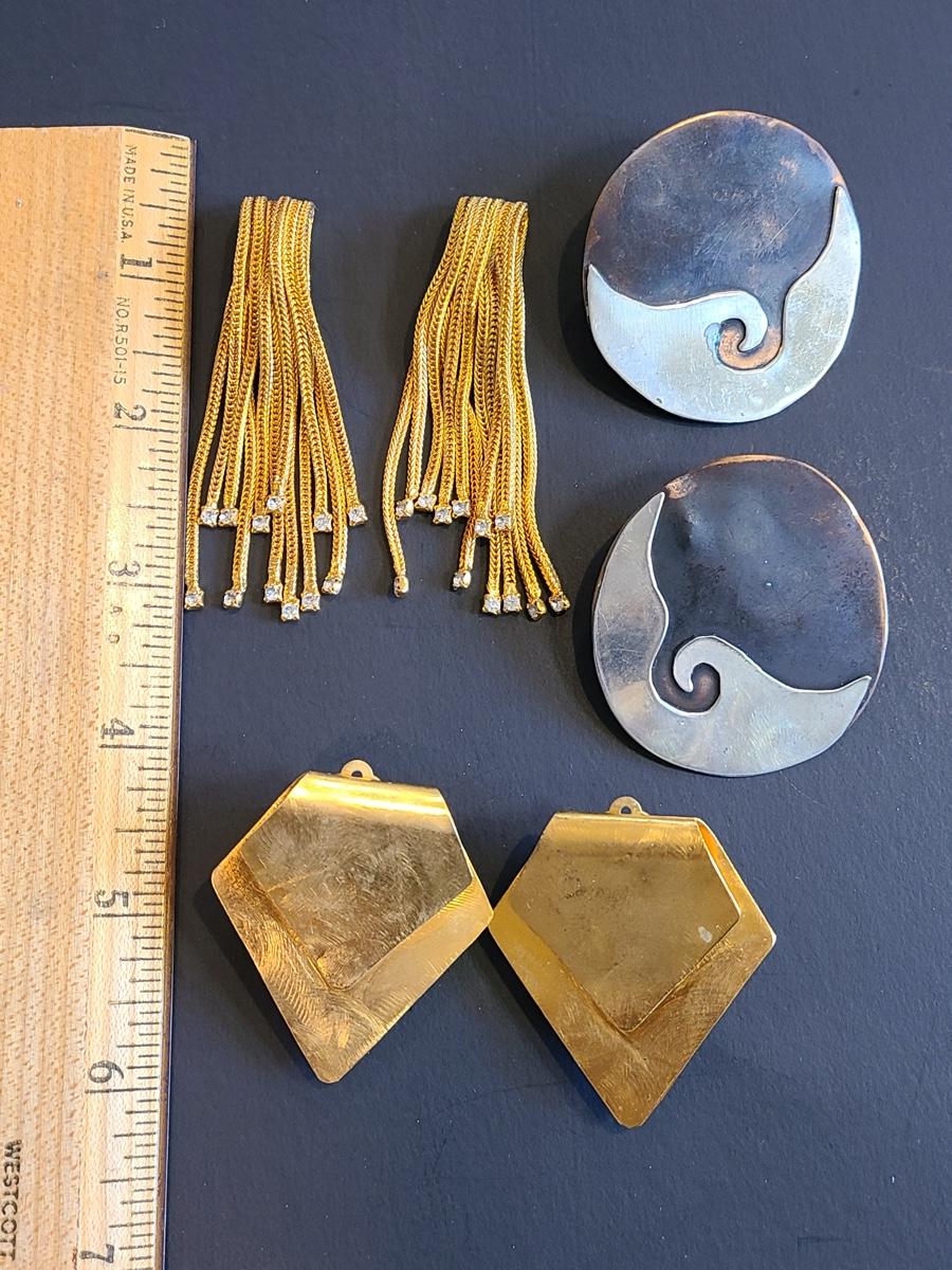 Three pairs of fun vintage earrings, these are large in size. Please see all pictures. The pictures show condition, measurements if taken, and what is included in the lot. Due to the large amount that we photograph and the time frame, we are not always able to take measurements. All items unless noted, are pre-owned and have been used. If you purchased furniture, you must bring help. We do not allow one person to carry large furniture out on their own. Bring help, tools and a truck for the safety of our client’s homes, and your personal safety. Company policy. Thank you