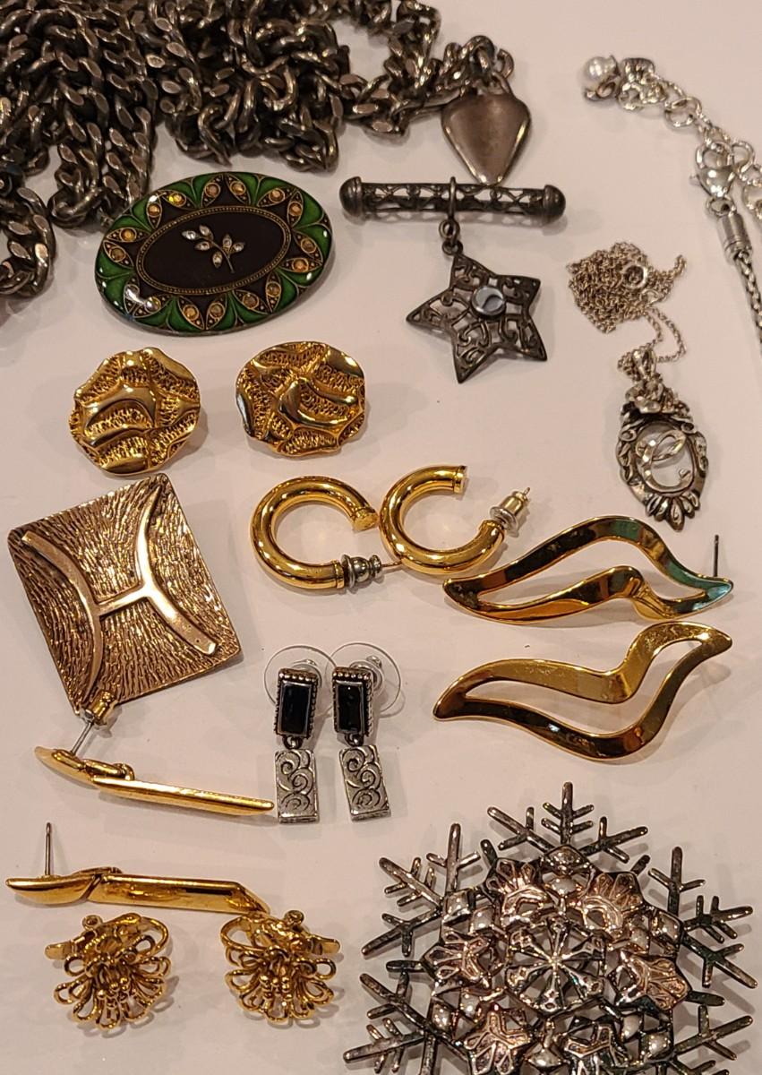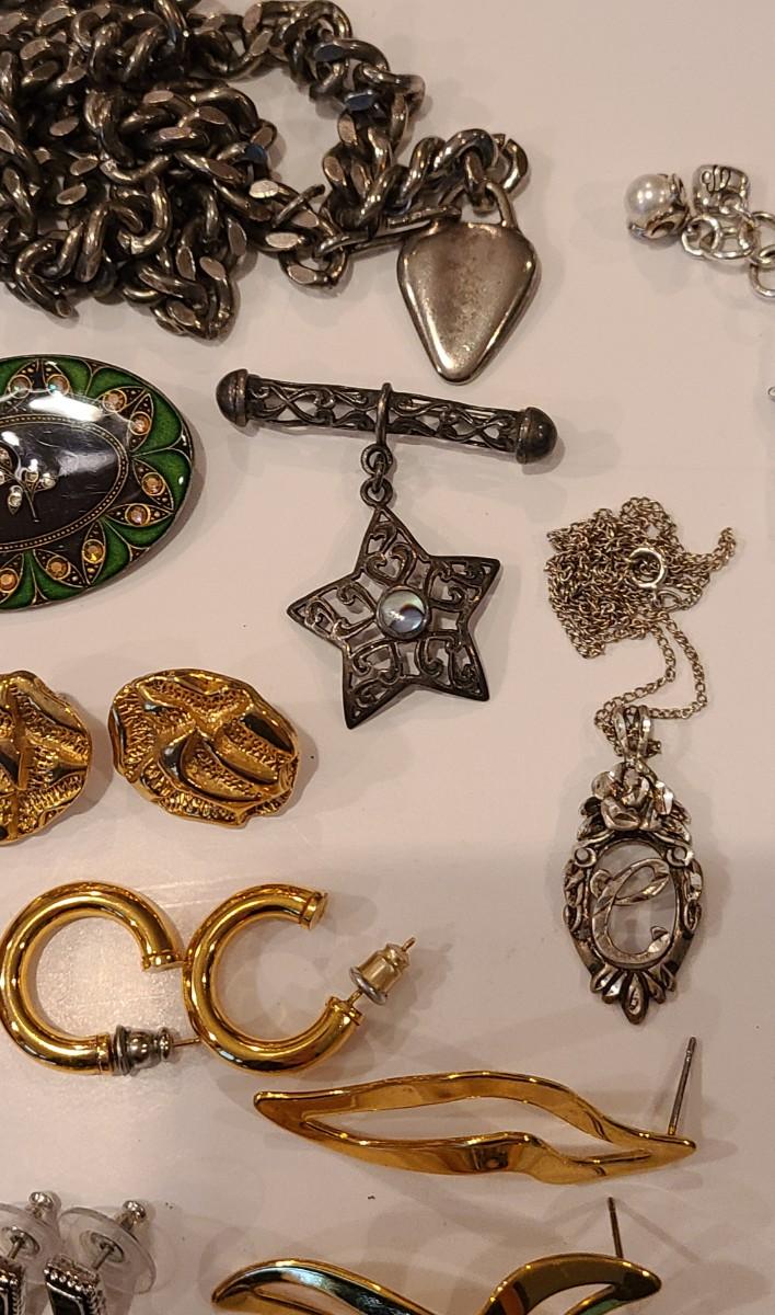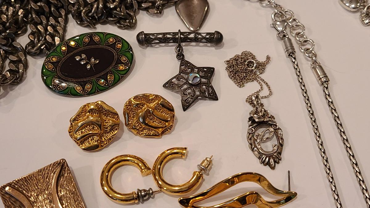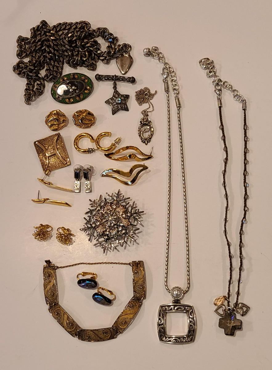 Fun lot of mixed jewelry: Trifari clip gold-tone floral earrings, Napier earrings, Catherine Popesco brooch, 925 marked Snowflake brooch, Brighton necklaces (one is reversible), 925 vintage "C" pendant, vintage waist belt and more. Please see all pictures for content of the lot, condition of the lot, and measurements if taken. Pictures are the best representation of the items listed and items are untested unless indicated in description. Thank you for looking and have fun bidding!