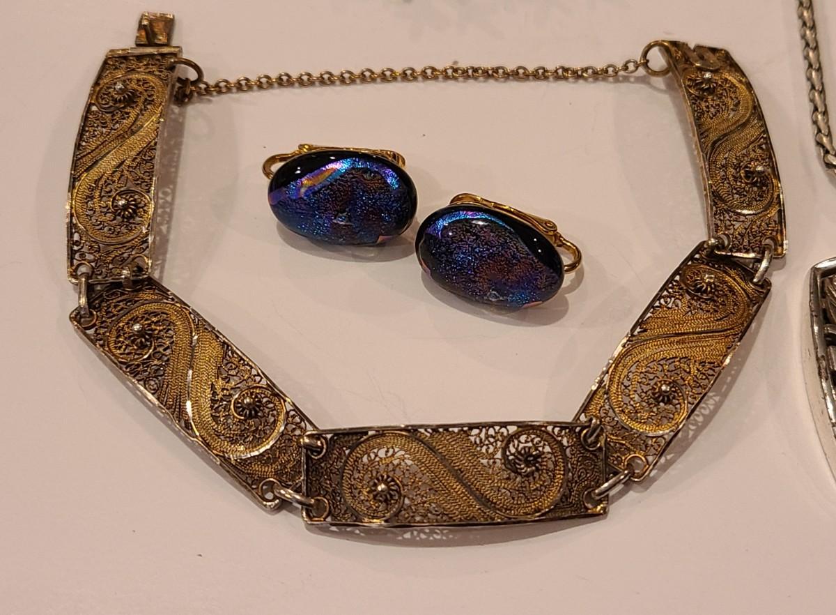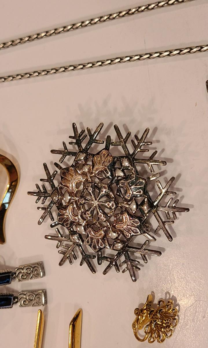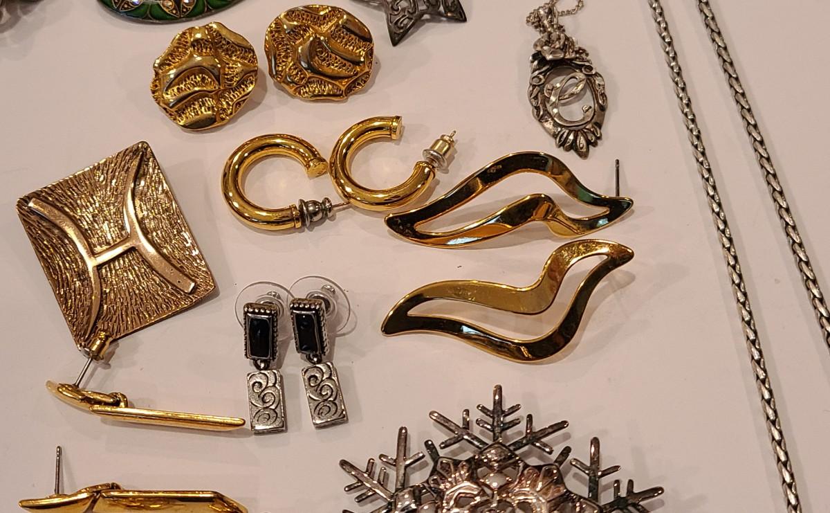 Fun lot of mixed jewelry: Trifari clip gold-tone floral earrings, Napier earrings, Catherine Popesco brooch, 925 marked Snowflake brooch, Brighton necklaces (one is reversible), 925 vintage "C" pendant, vintage waist belt and more. Please see all pictures for content of the lot, condition of the lot, and measurements if taken. Pictures are the best representation of the items listed and items are untested unless indicated in description. Thank you for looking and have fun bidding!