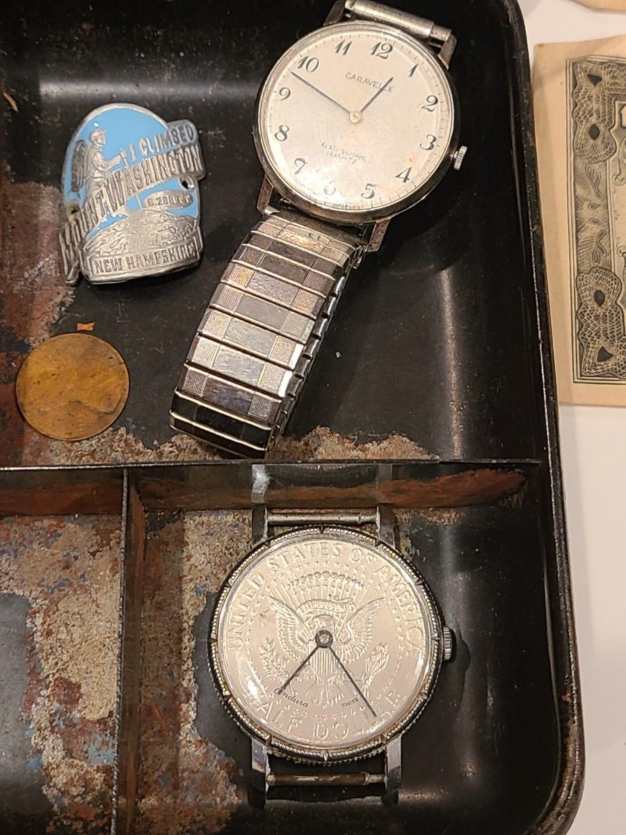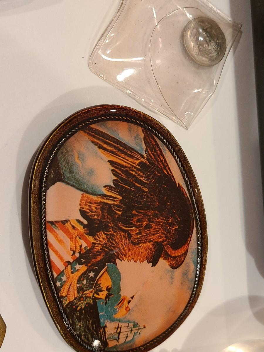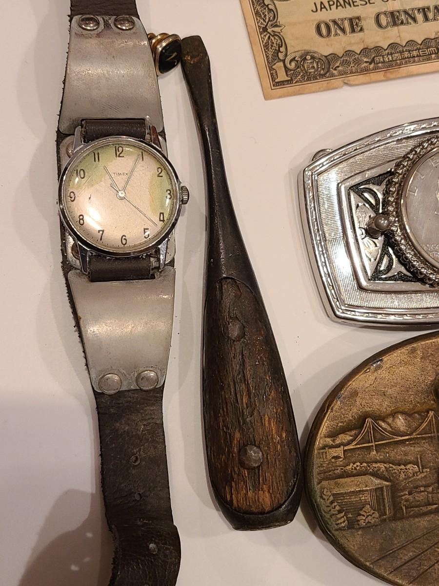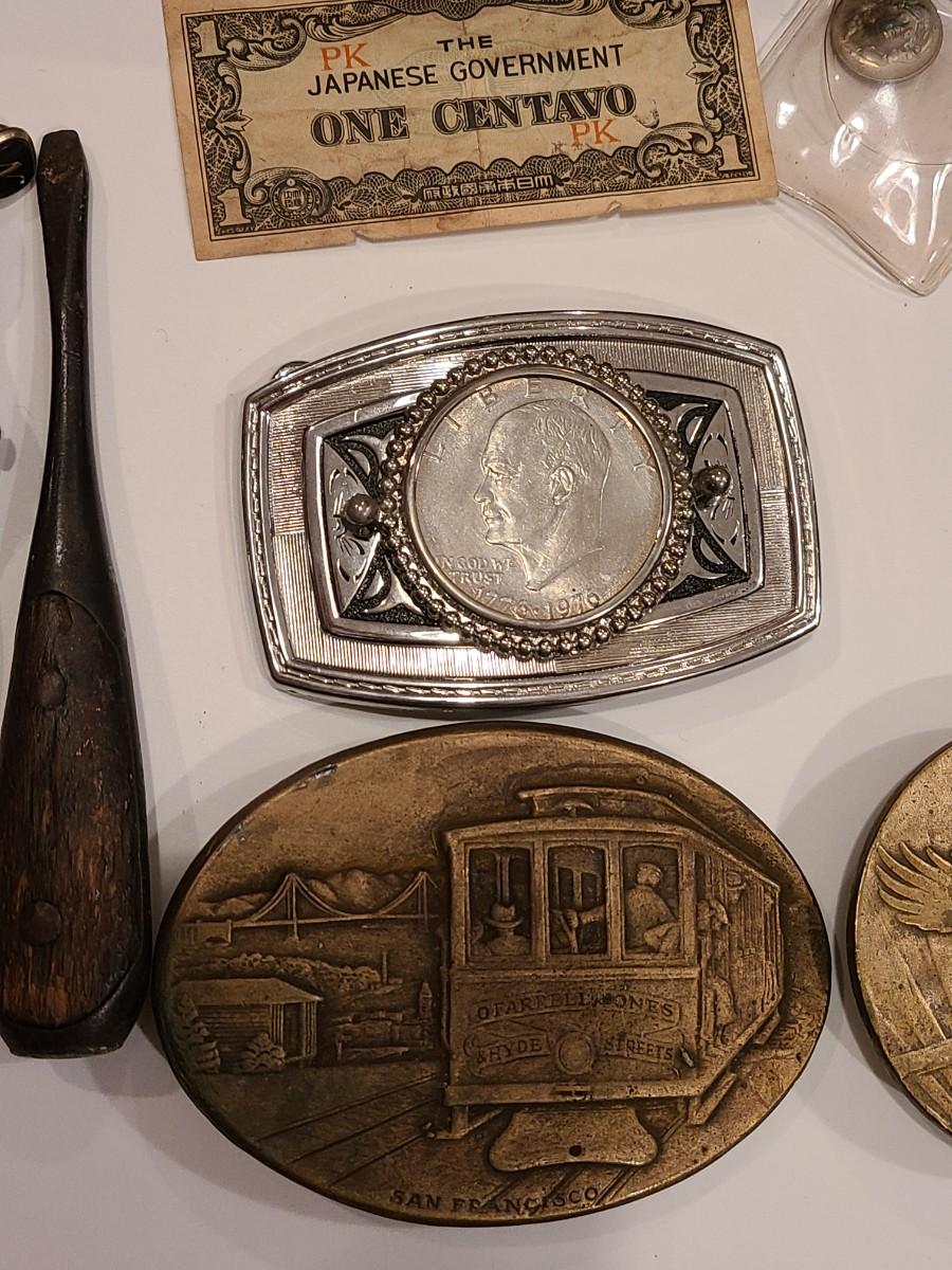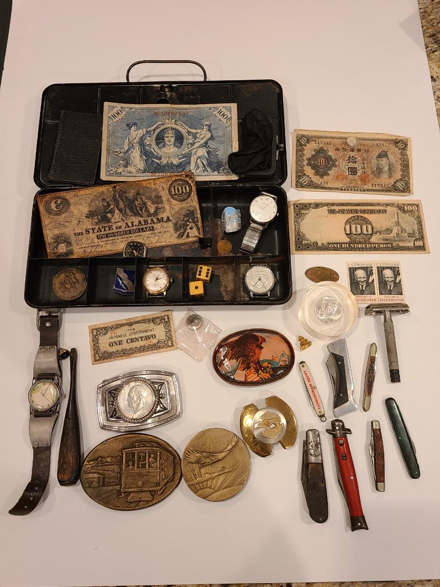 Vintage and antique trinkets, collectibles, foreign currency, belt buckles and more in old Standard Cash Box.