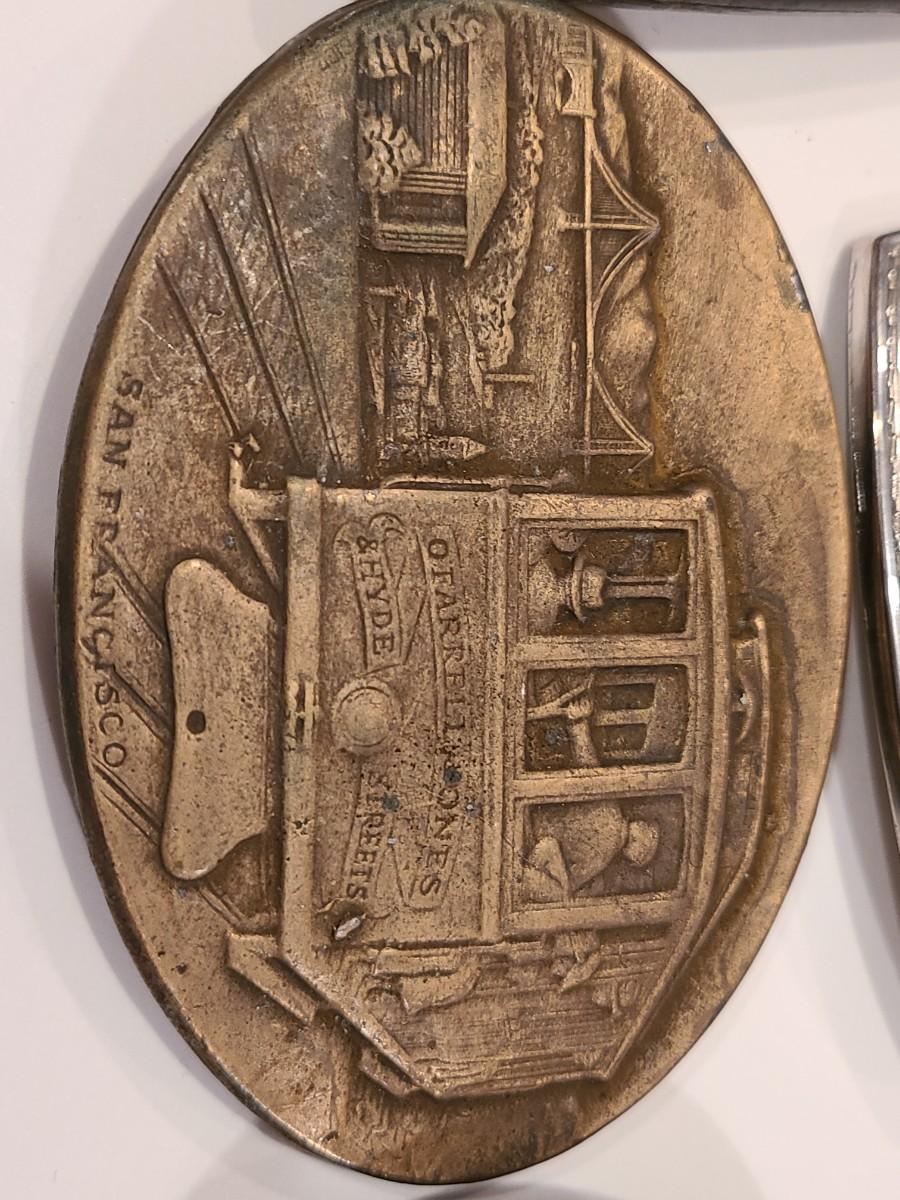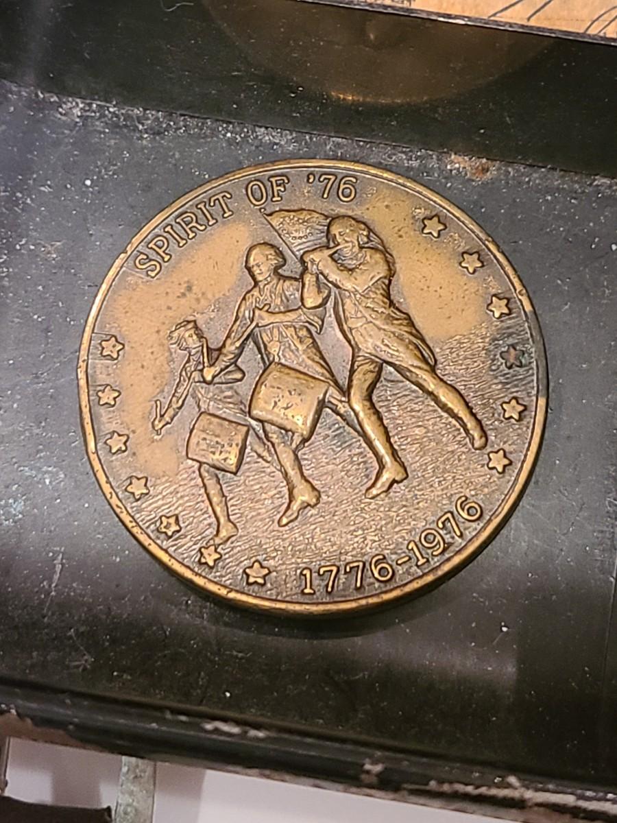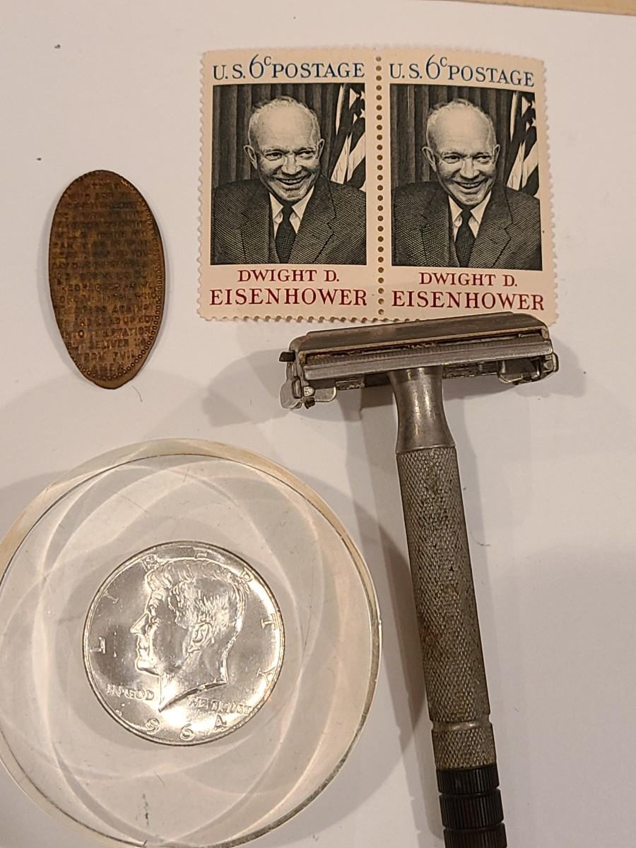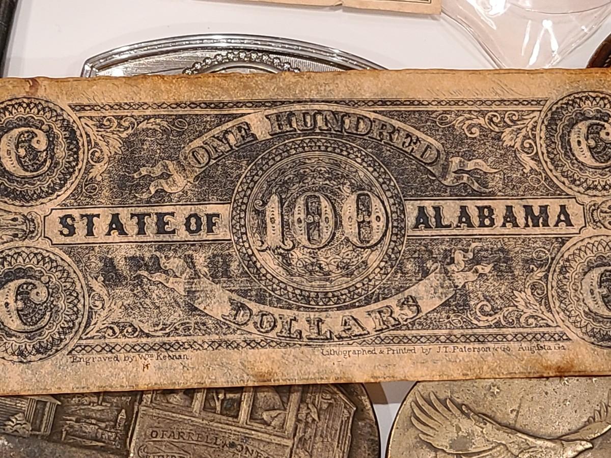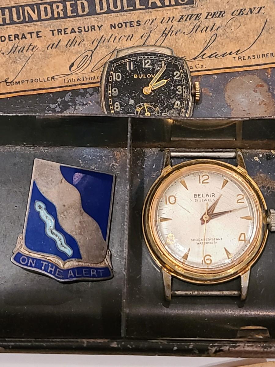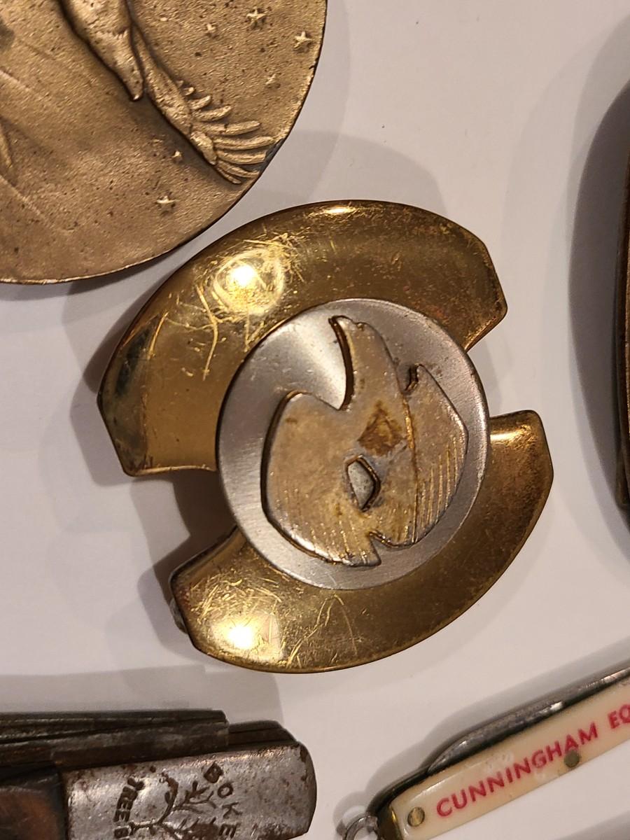 Vintage and antique trinkets, collectibles, foreign currency, belt buckles and more in old Standard Cash Box.