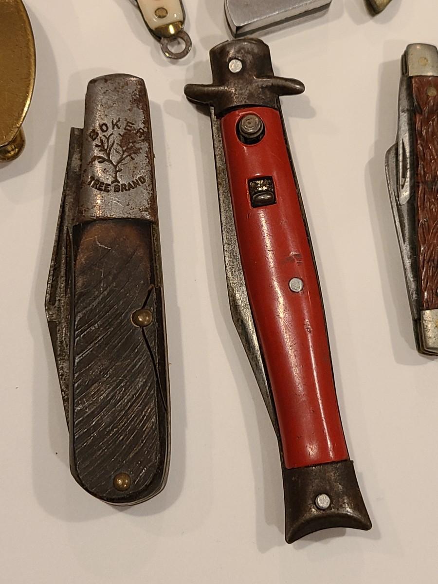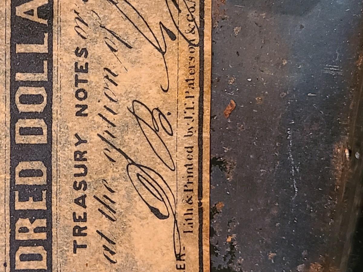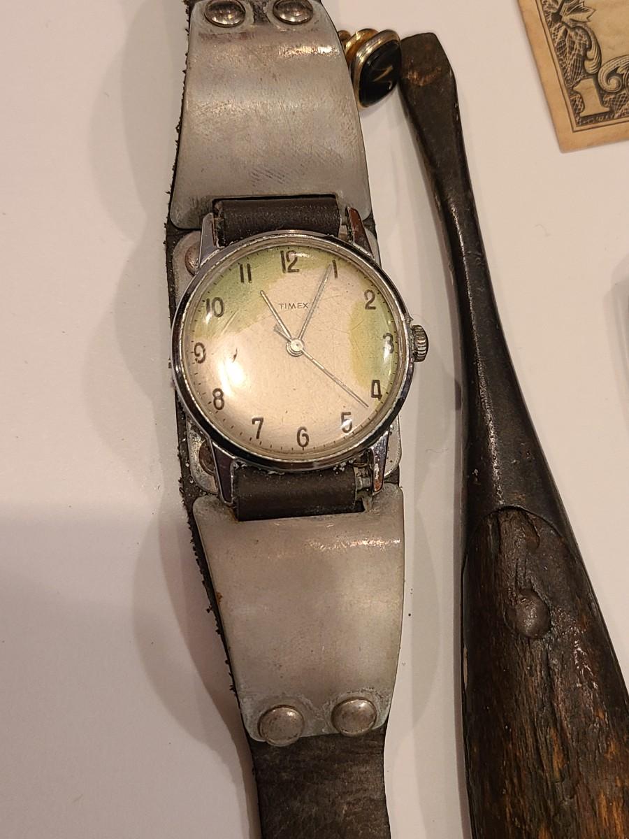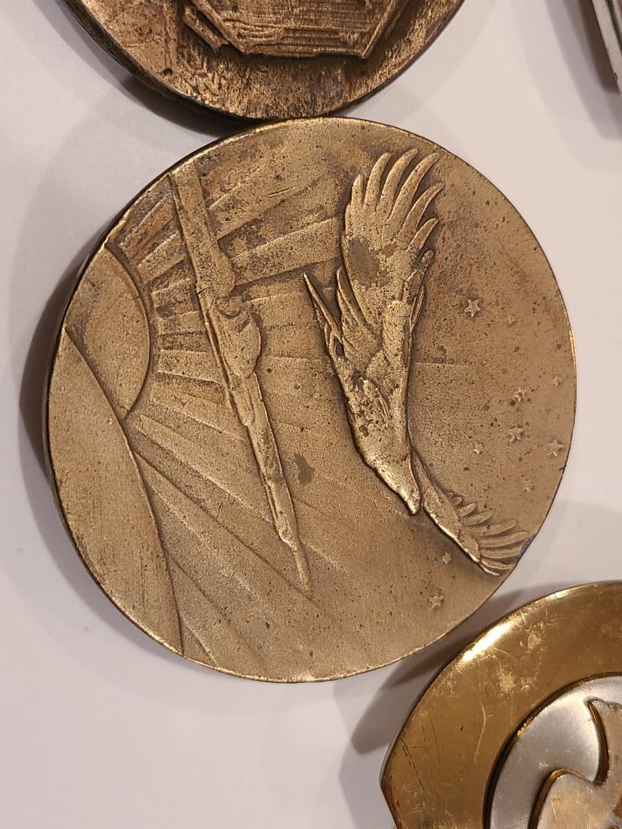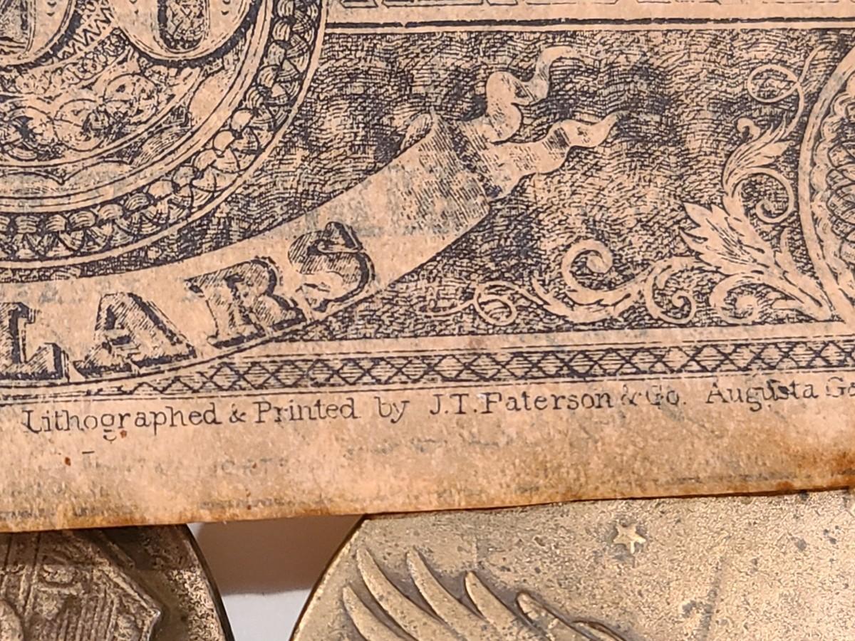 Vintage and antique trinkets, collectibles, foreign currency, belt buckles and more in old Standard Cash Box.