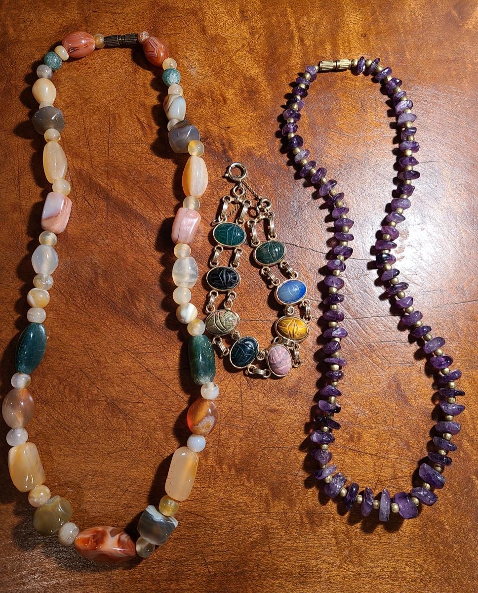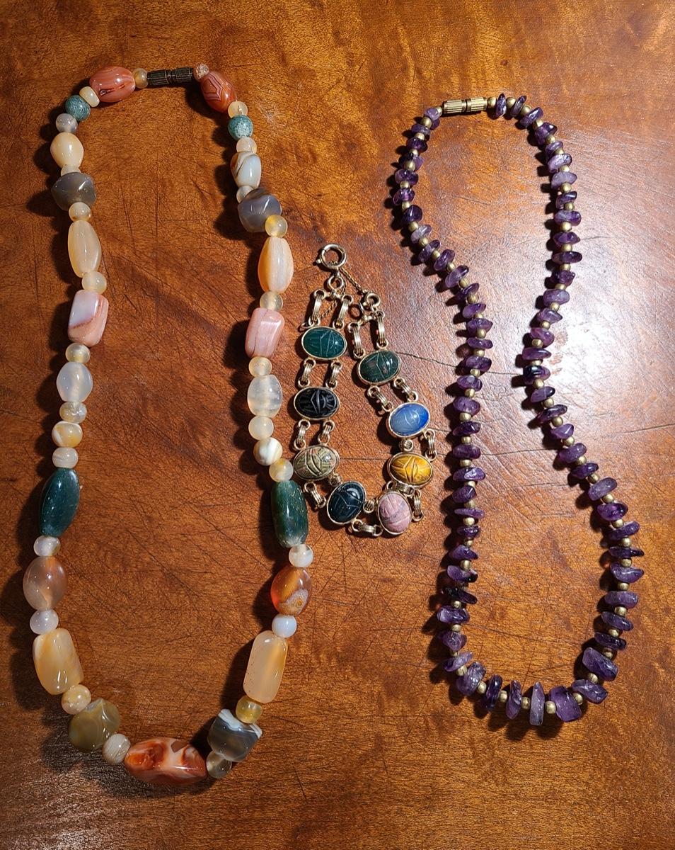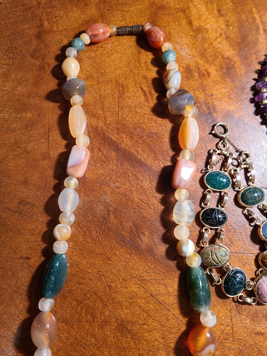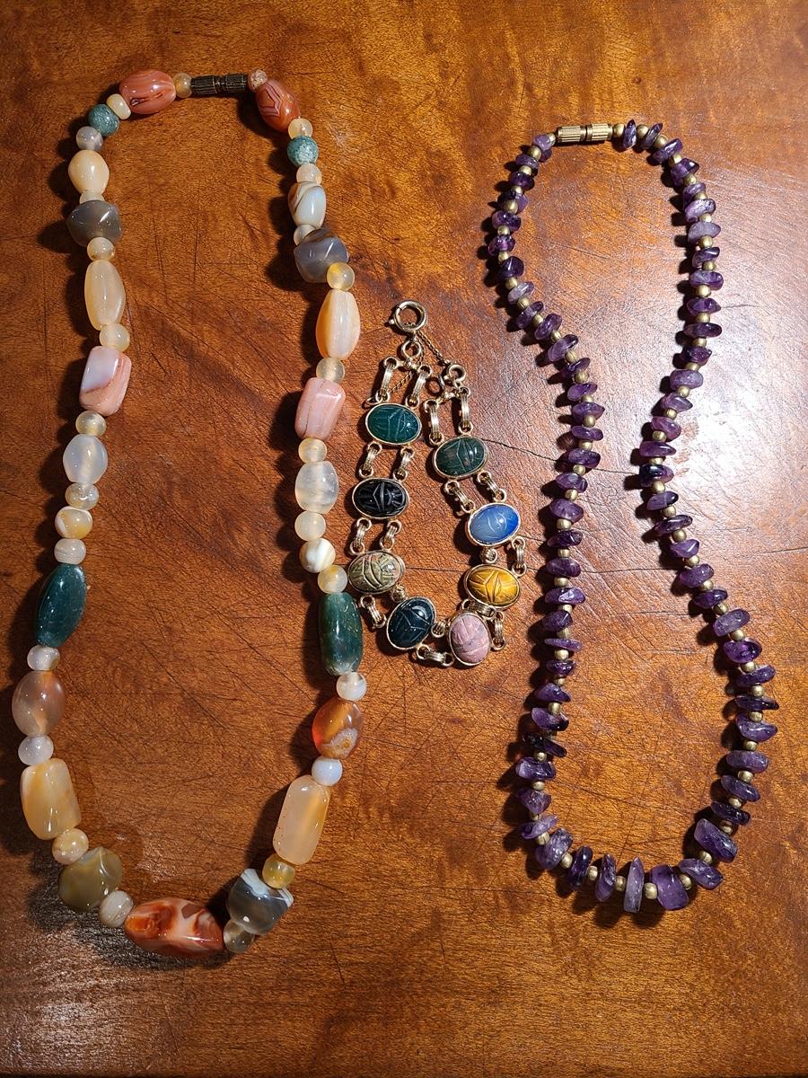 Lovely lot of natural stone necklaces with vibrant colors, and a bracelet marked gold filled.