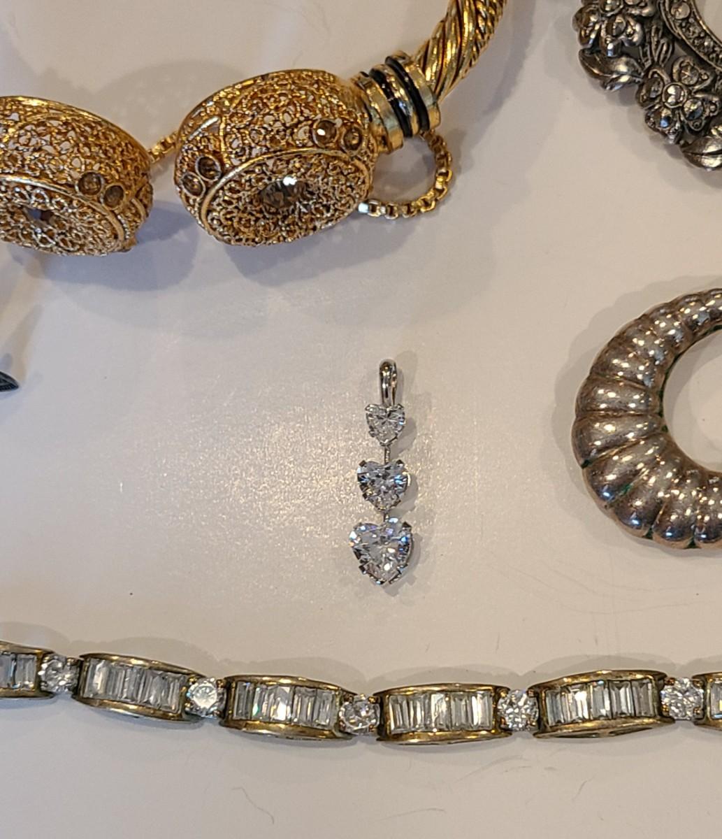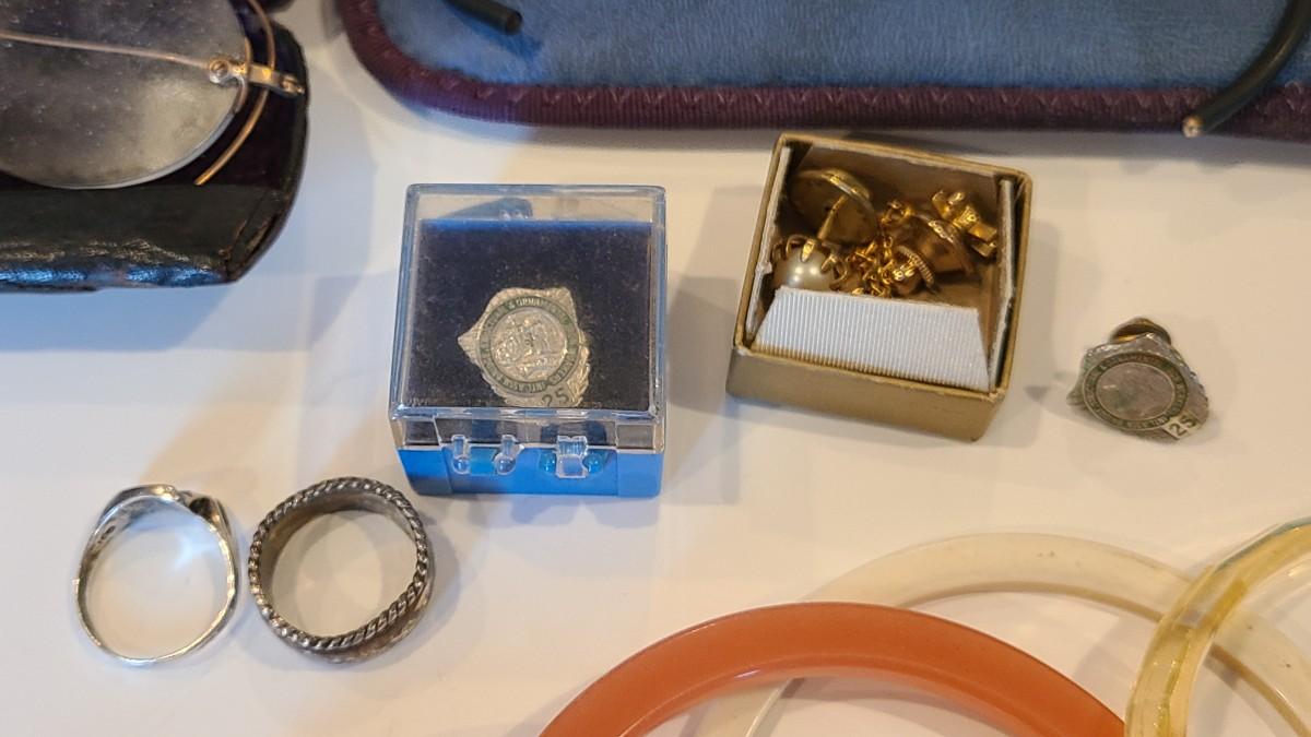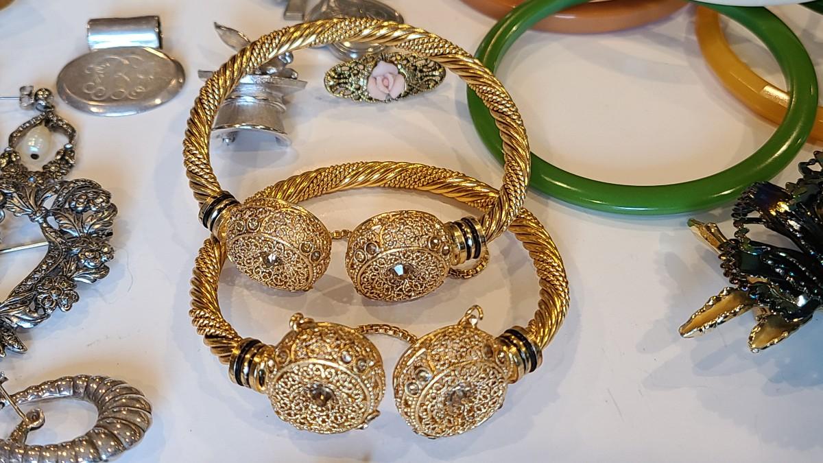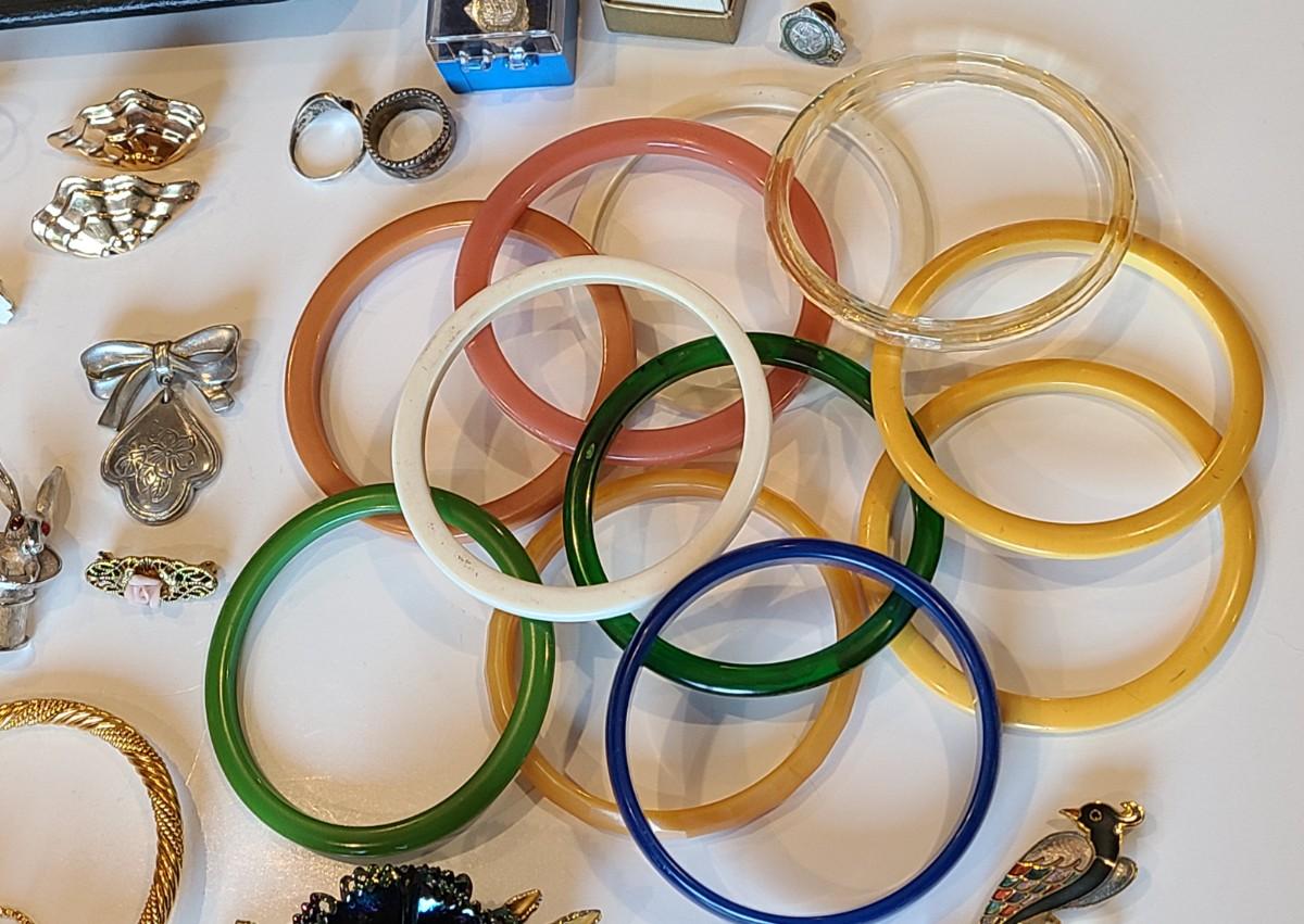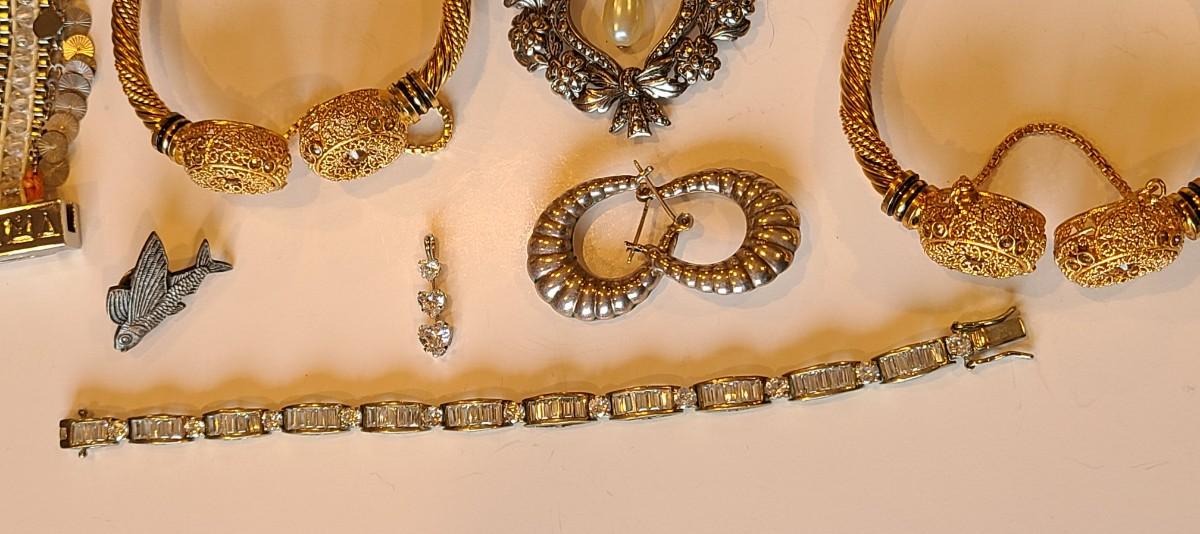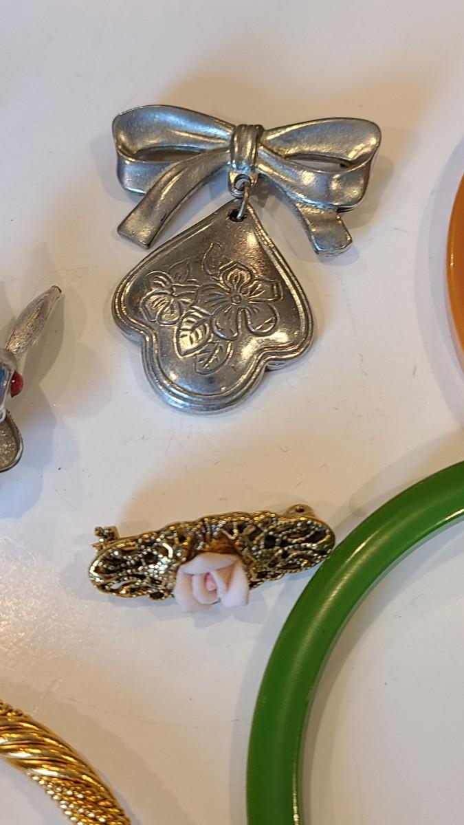 Mixed lot of jewelry including: Vintage colorful bangles, Trifari Bowl necklace and rabbit in the hat brooch, Hipanema bracelet, antique spectacles (as-is), sterling marked brooch with monogram, Kirk Steiff pewter February Violet brooch, cameo ring, signed copper ring, vintage tennis bracelet, and Jacmel Mauritius DQCZ JCM 14K White Gold 3-Tier Heart Pendant (great gift), and Scotland Yard/Ironworker lapel pins. Tried to take multiple close-ups to get makers marks. Please see all pictures for content of the lot, condition of the lot, and measurements if taken. Pictures are the best representation of the items listed and items are untested unless indicated in description. Thank you for looking and have fun bidding!