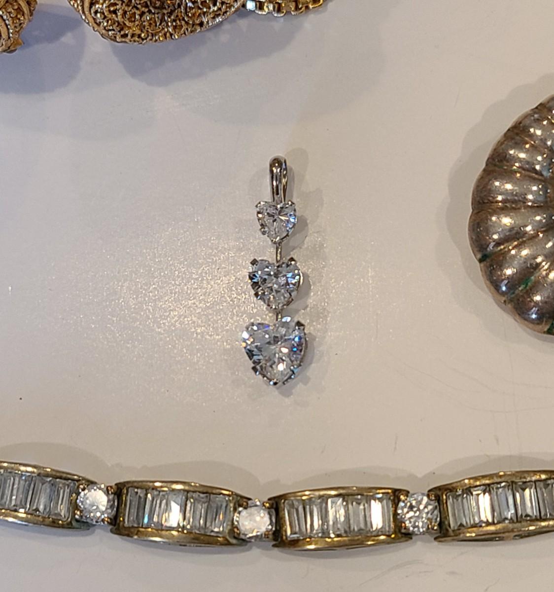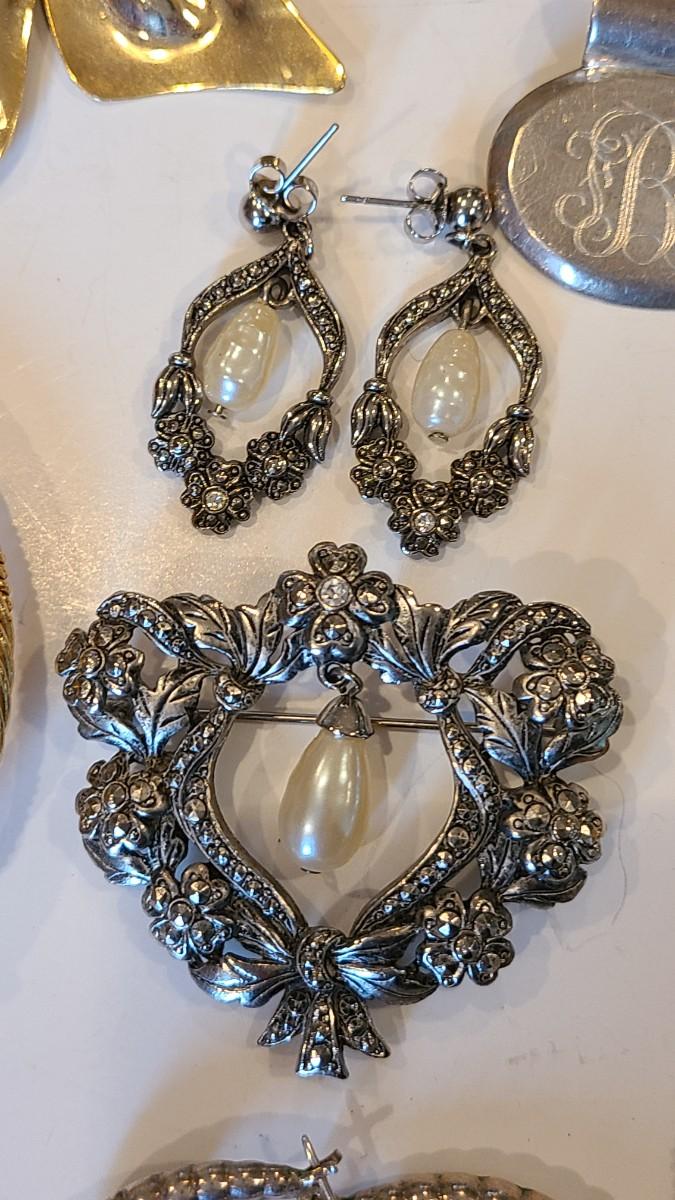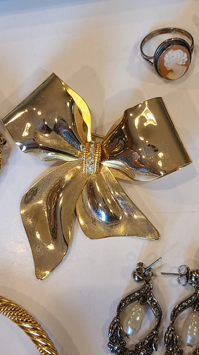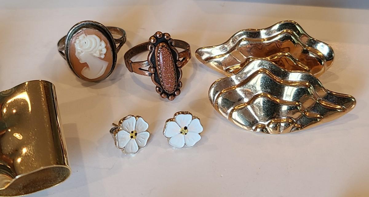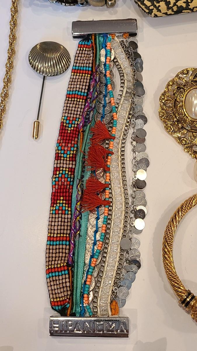 Mixed lot of jewelry including: Vintage colorful bangles, Trifari Bowl necklace and rabbit in the hat brooch, Hipanema bracelet, antique spectacles (as-is), sterling marked brooch with monogram, Kirk Steiff pewter February Violet brooch, cameo ring, signed copper ring, vintage tennis bracelet, and Jacmel Mauritius DQCZ JCM 14K White Gold 3-Tier Heart Pendant (great gift), and Scotland Yard/Ironworker lapel pins. Tried to take multiple close-ups to get makers marks. Please see all pictures for content of the lot, condition of the lot, and measurements if taken. Pictures are the best representation of the items listed and items are untested unless indicated in description. Thank you for looking and have fun bidding!