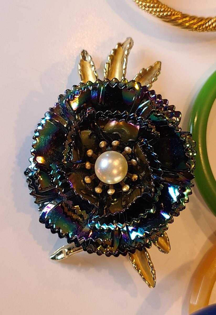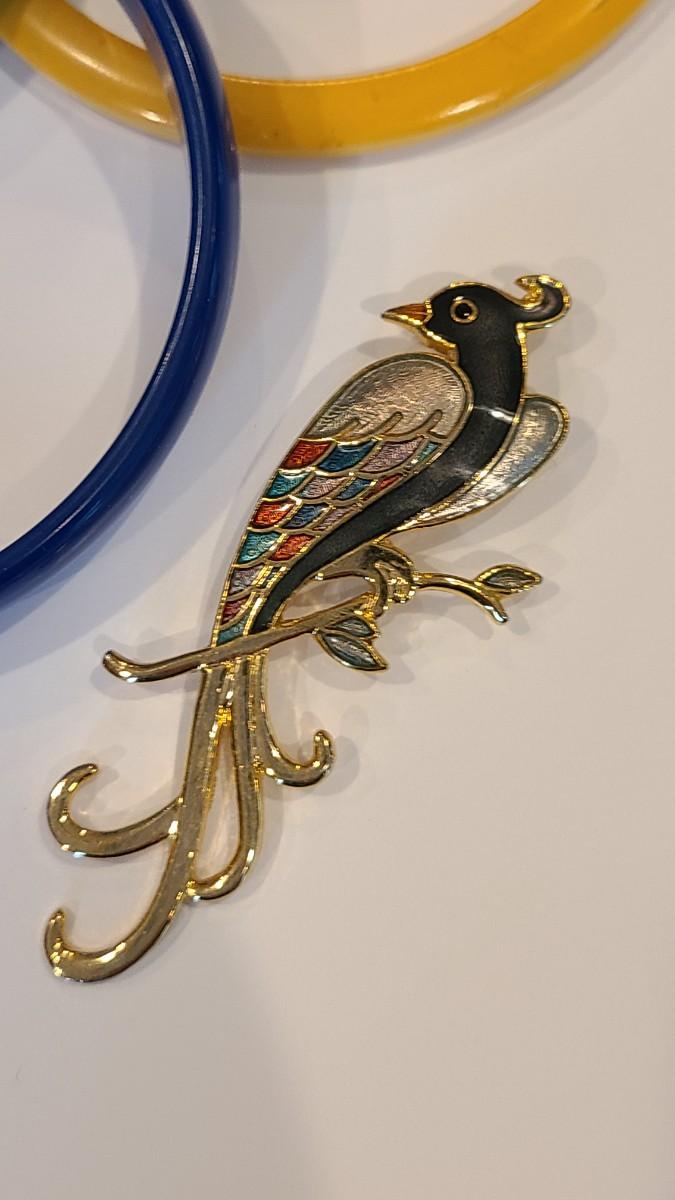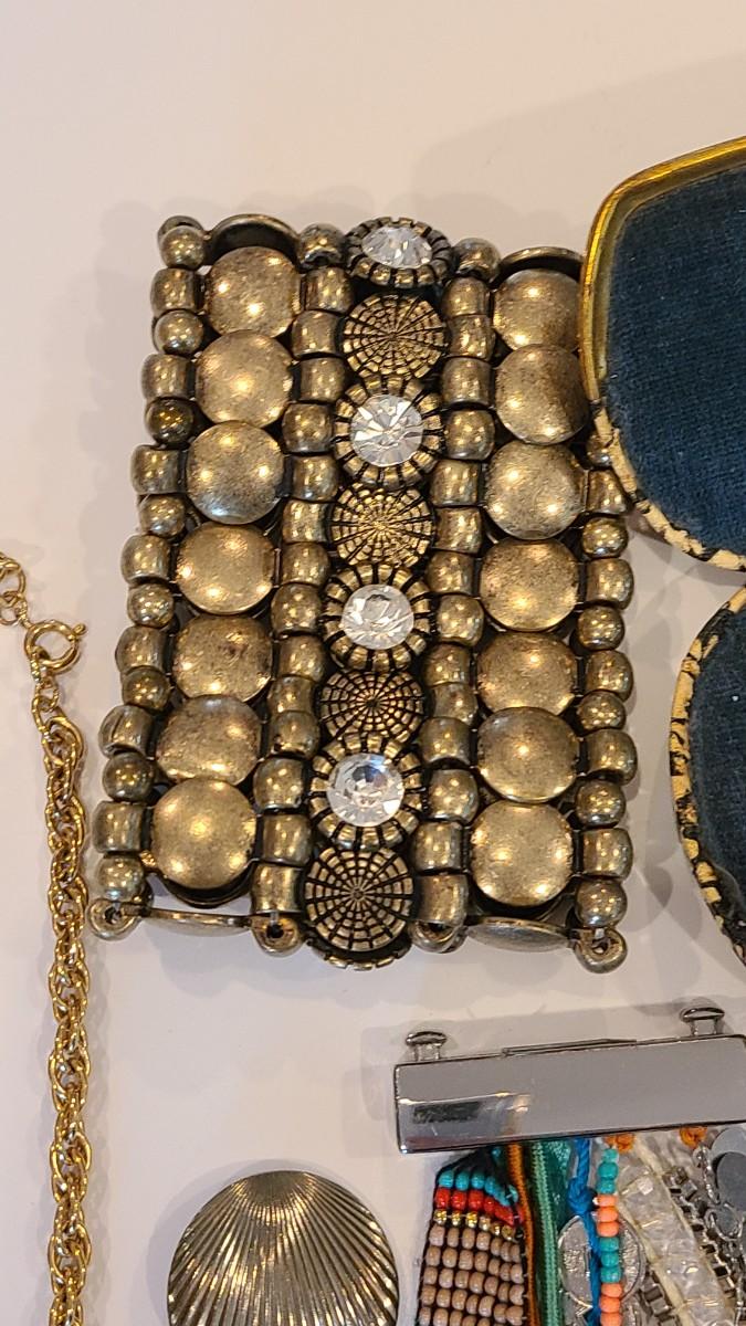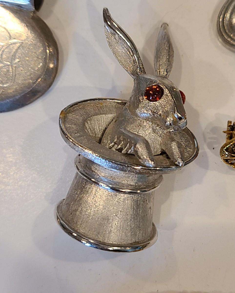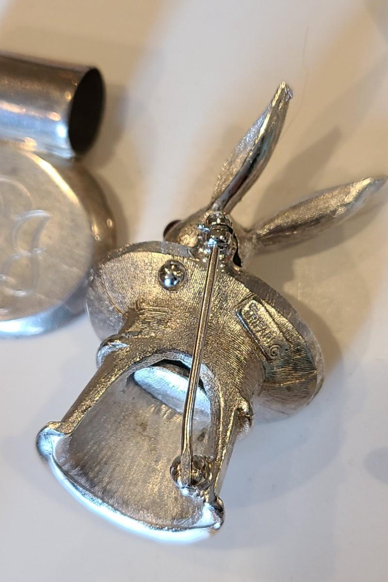 Mixed lot of jewelry including: Vintage colorful bangles, Trifari Bowl necklace and rabbit in the hat brooch, Hipanema bracelet, antique spectacles (as-is), sterling marked brooch with monogram, Kirk Steiff pewter February Violet brooch, cameo ring, signed copper ring, vintage tennis bracelet, and Jacmel Mauritius DQCZ JCM 14K White Gold 3-Tier Heart Pendant (great gift), and Scotland Yard/Ironworker lapel pins. Tried to take multiple close-ups to get makers marks. Please see all pictures for content of the lot, condition of the lot, and measurements if taken. Pictures are the best representation of the items listed and items are untested unless indicated in description. Thank you for looking and have fun bidding!