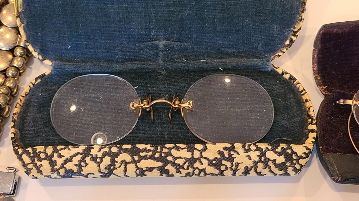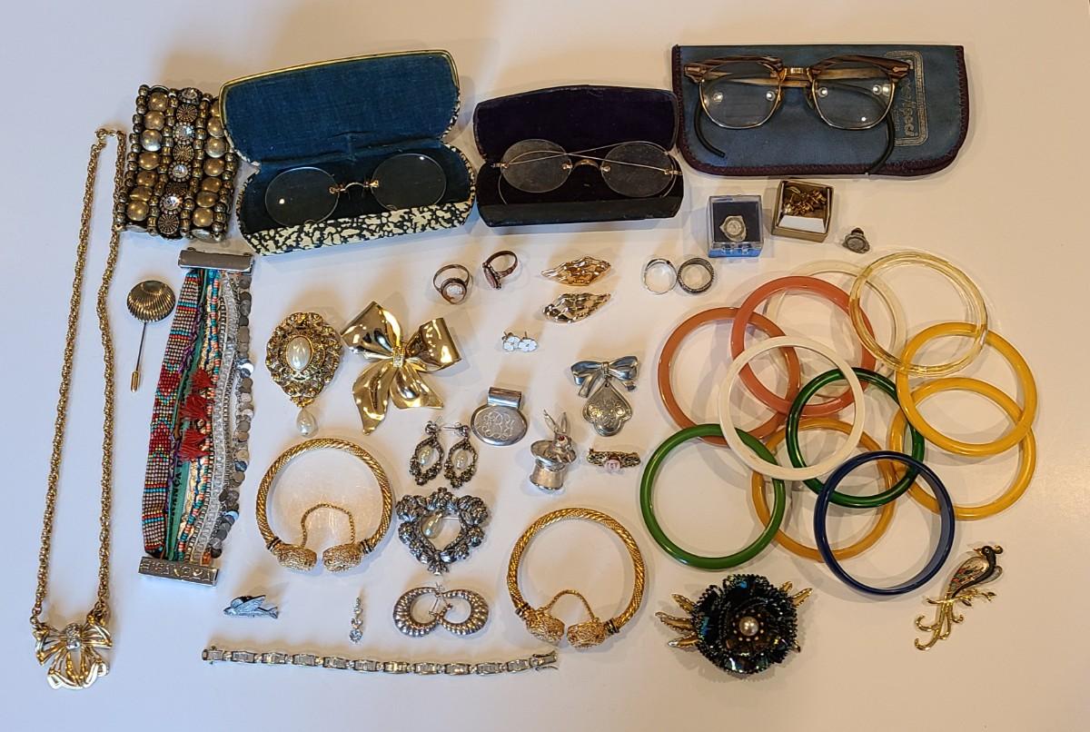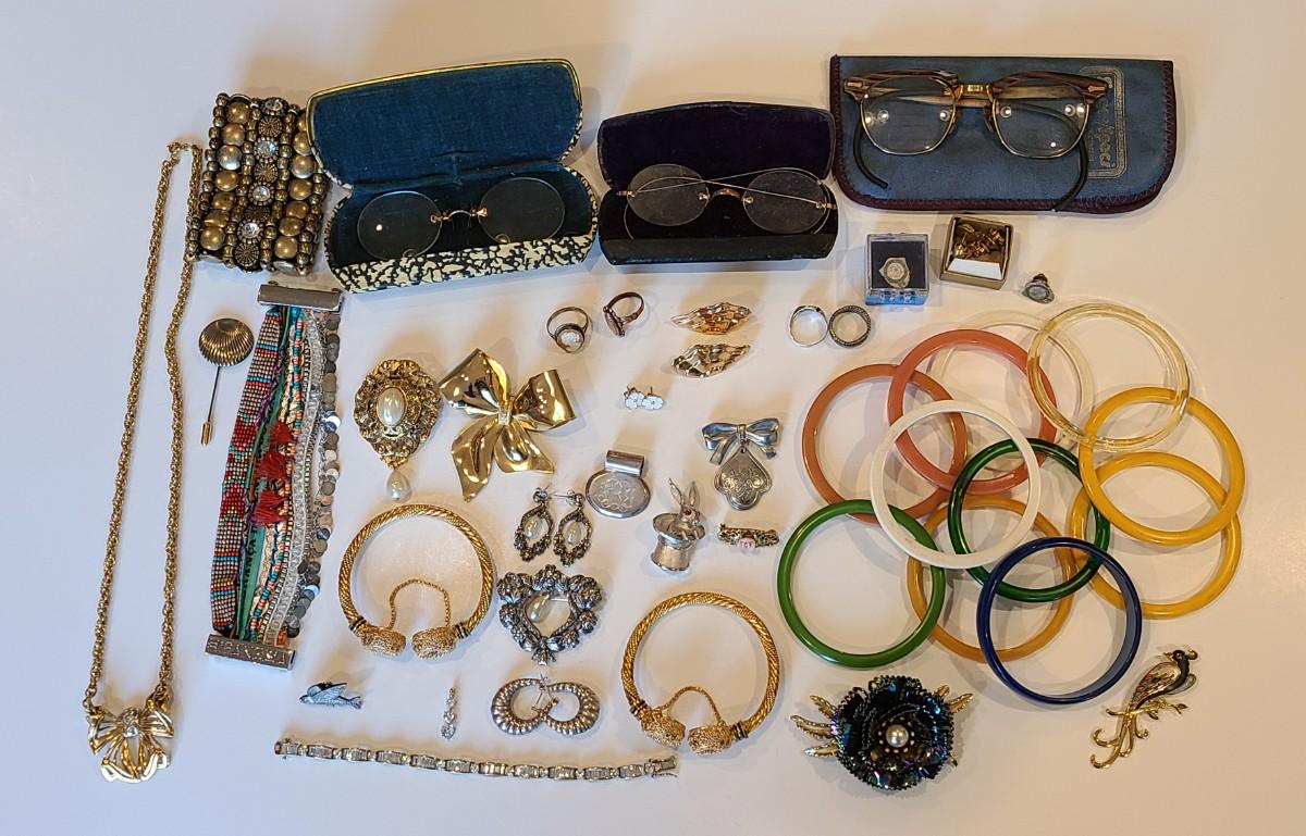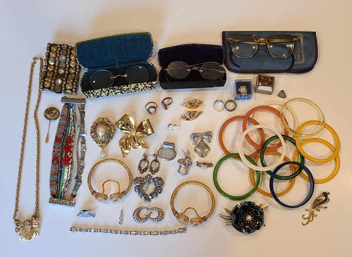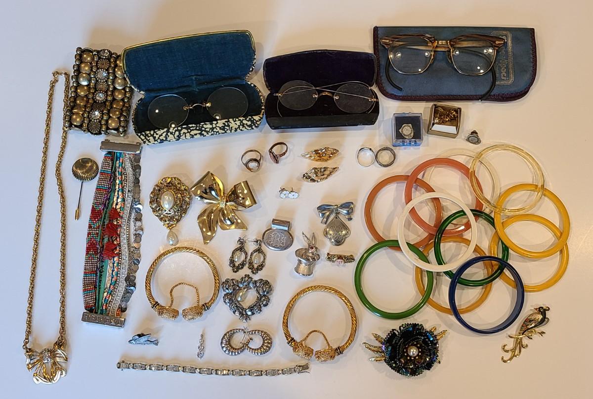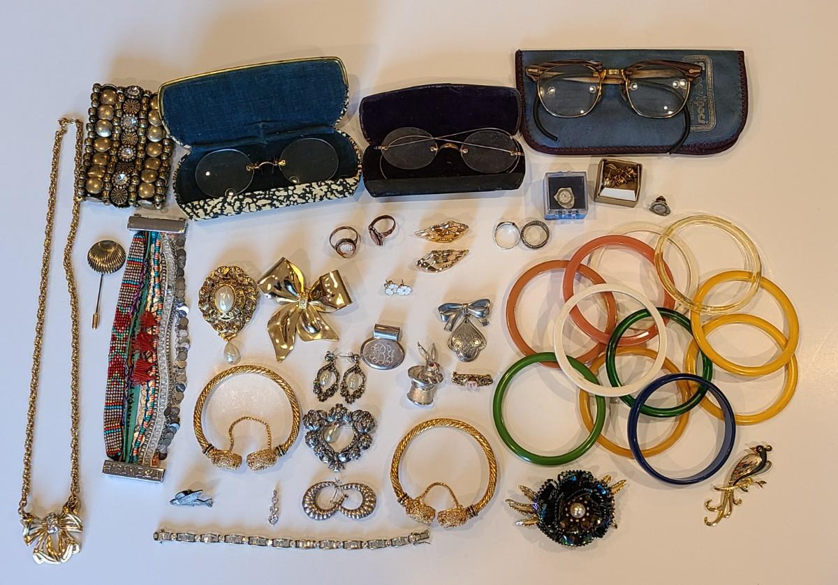 Lot J5: 14K Gold, Sterling, Trifari, Antique Glasses, and More