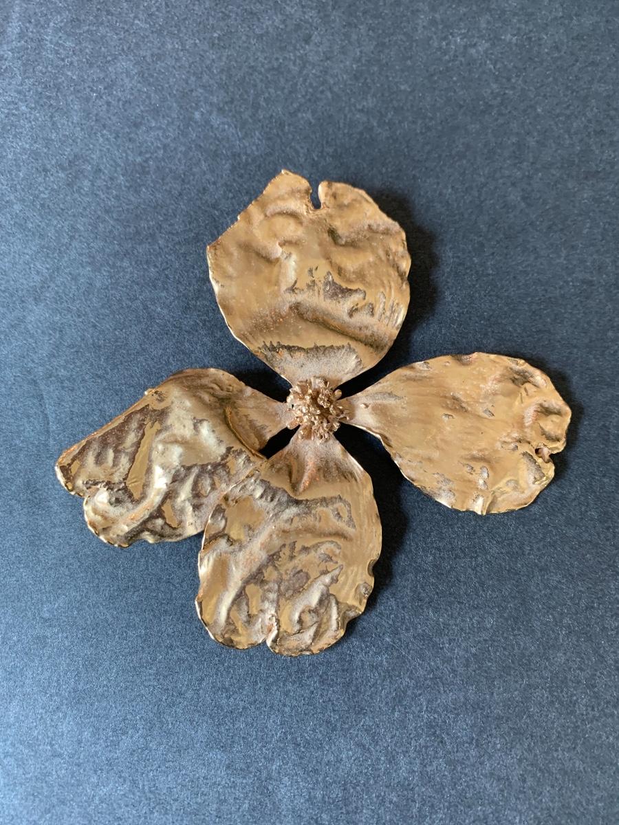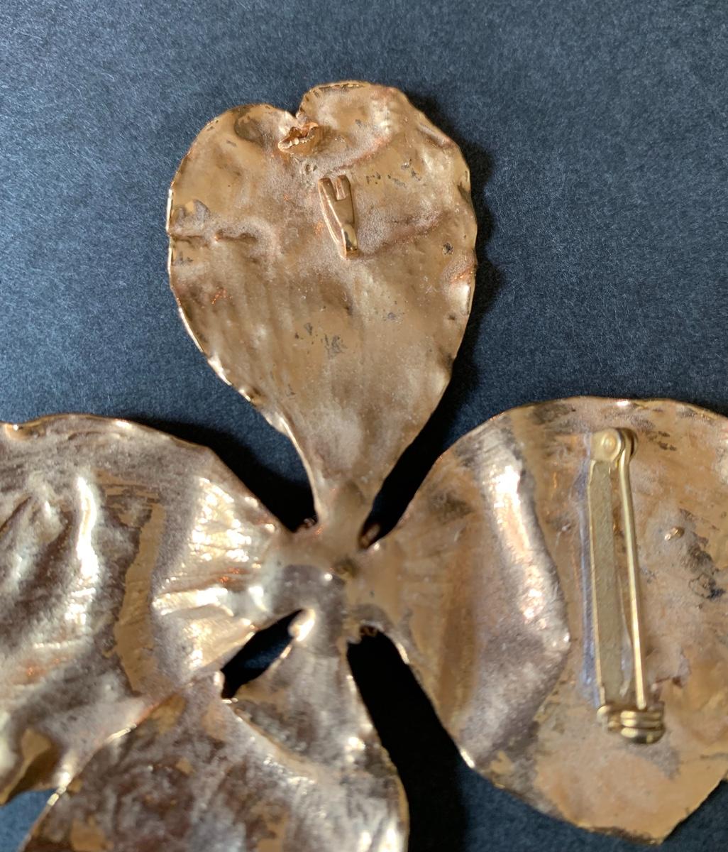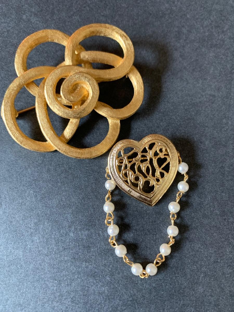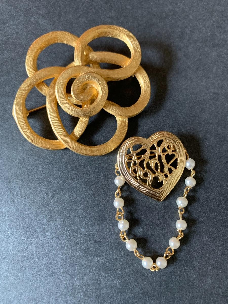 Swirls, hearts and flowers. The largest gold tone flower can also be worn as a necklace (loop on back)