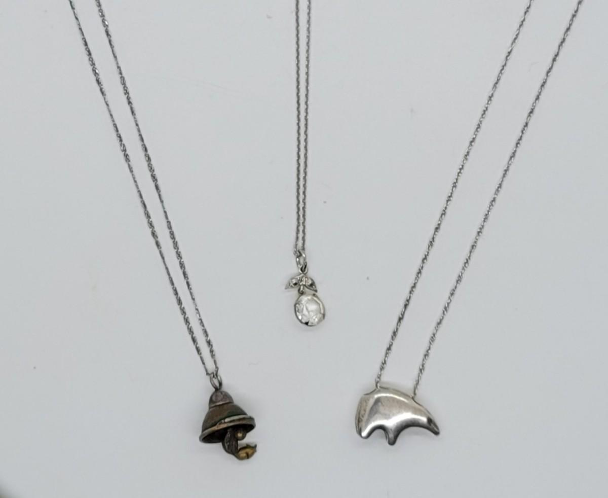 Lot J78:  18" silver chain with copper bell, 18" silver chain with bear and 15" silver chain with crystal clasps marked sterling