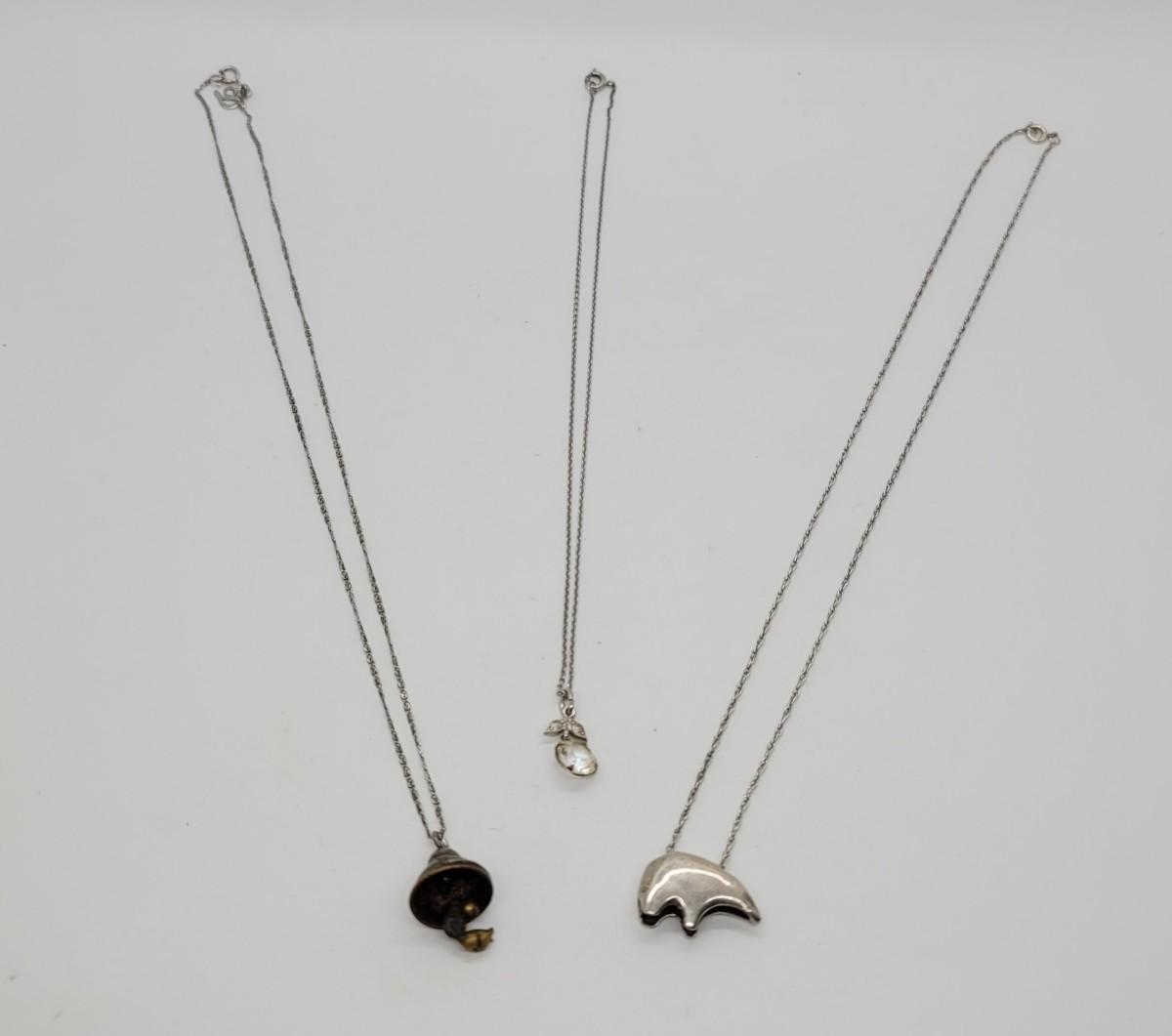 Lot J78: 18" silver chain with copper bell, 18" silver chain with bear and 15" silver chain with crystal clasps marked sterling