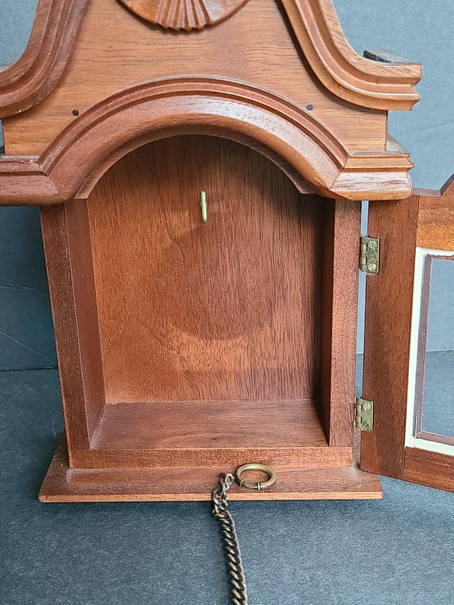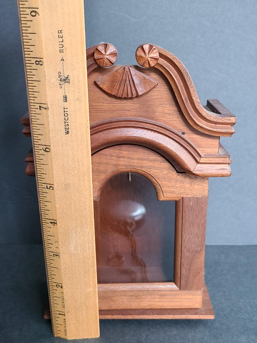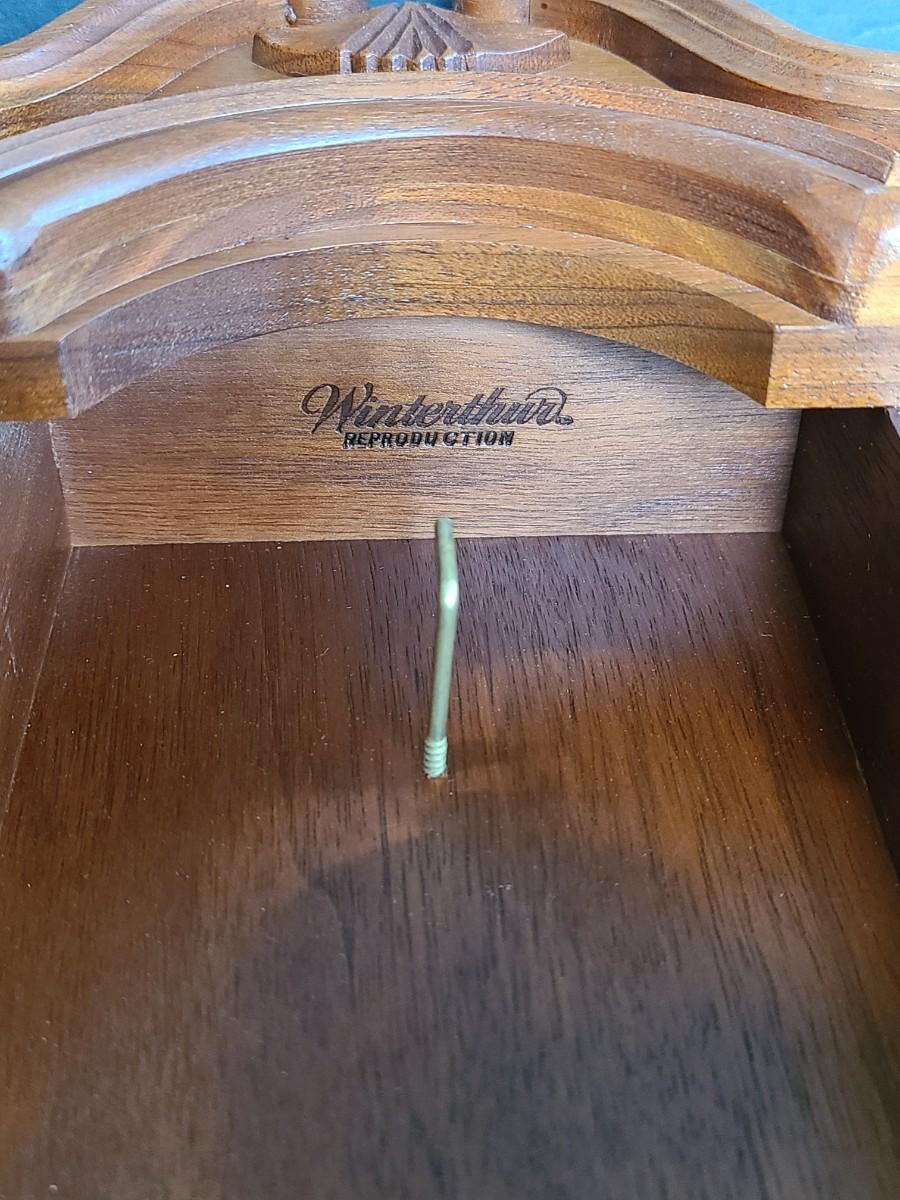 This unique piece is very hard to find. It is reproduction from the specks of a Winterthur large scale clock case, but in miniature form and from what looks to be Walnut. It is marked Winterthur Reproduction. The pocket watch inside is an Elgin the intermittantly ticks. The pictures show condition, measurements if taken, and what is included in the lot. Due to the large amount that we photograph and the time frame, we are not always able to take measurements. All items unless noted, are pre-owned and have been used. If you purchased furniture, you must bring help. We do not allow one person to carry large furniture out on their own. Bring help, tools and a truck for the safety of our client’s homes, and your personal safety. Company policy. Thank you.