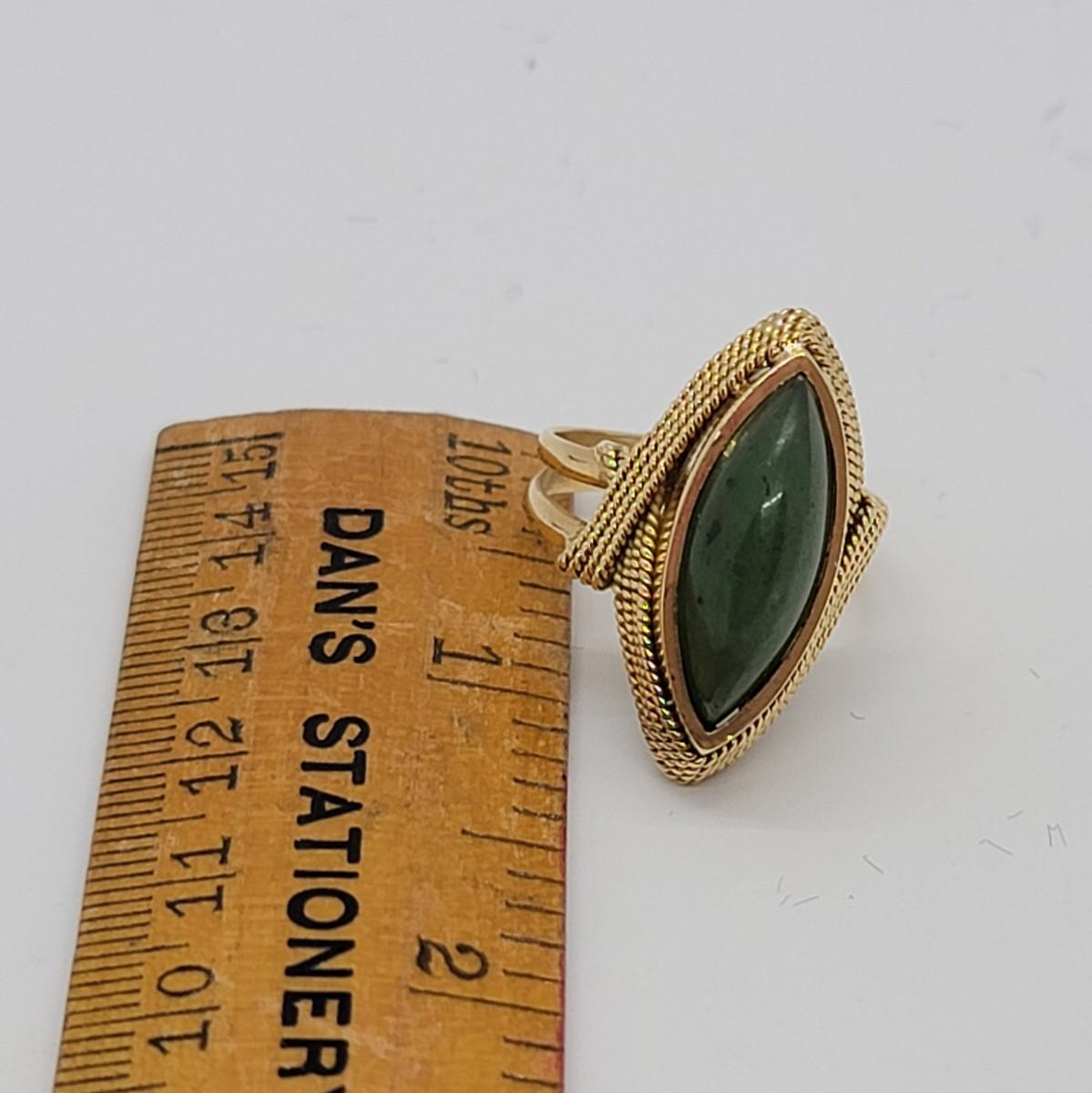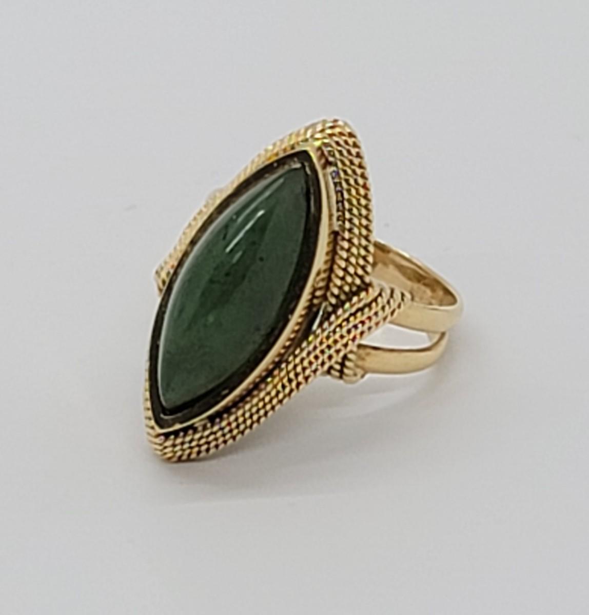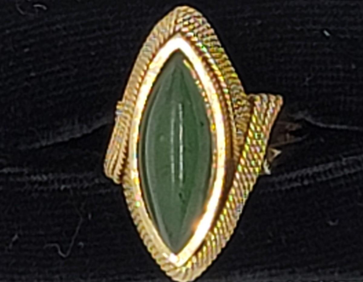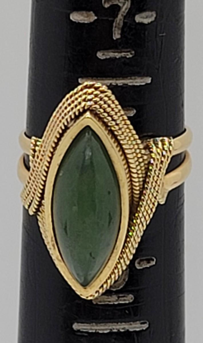 Lot J82: 14k yellow gold Marquis shaped Cabachon Green Jade Ring sz. 8