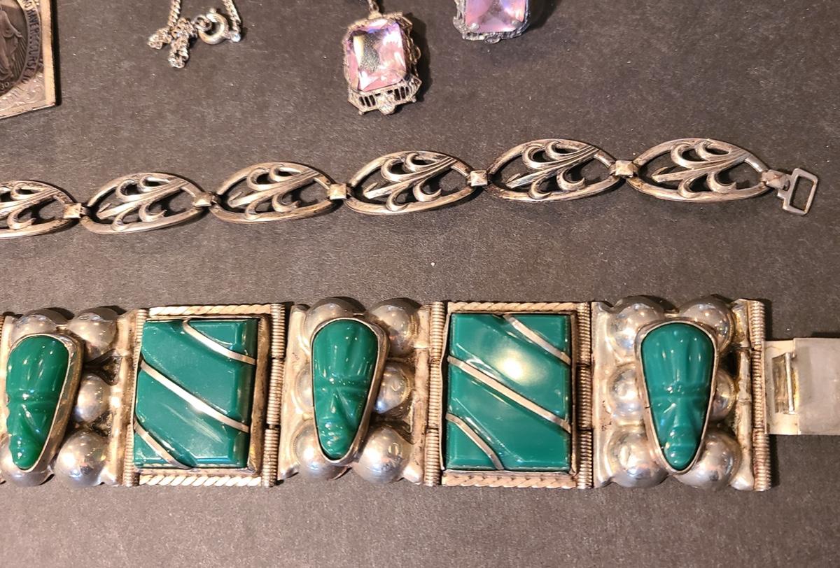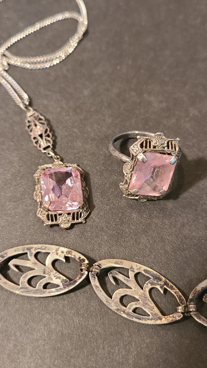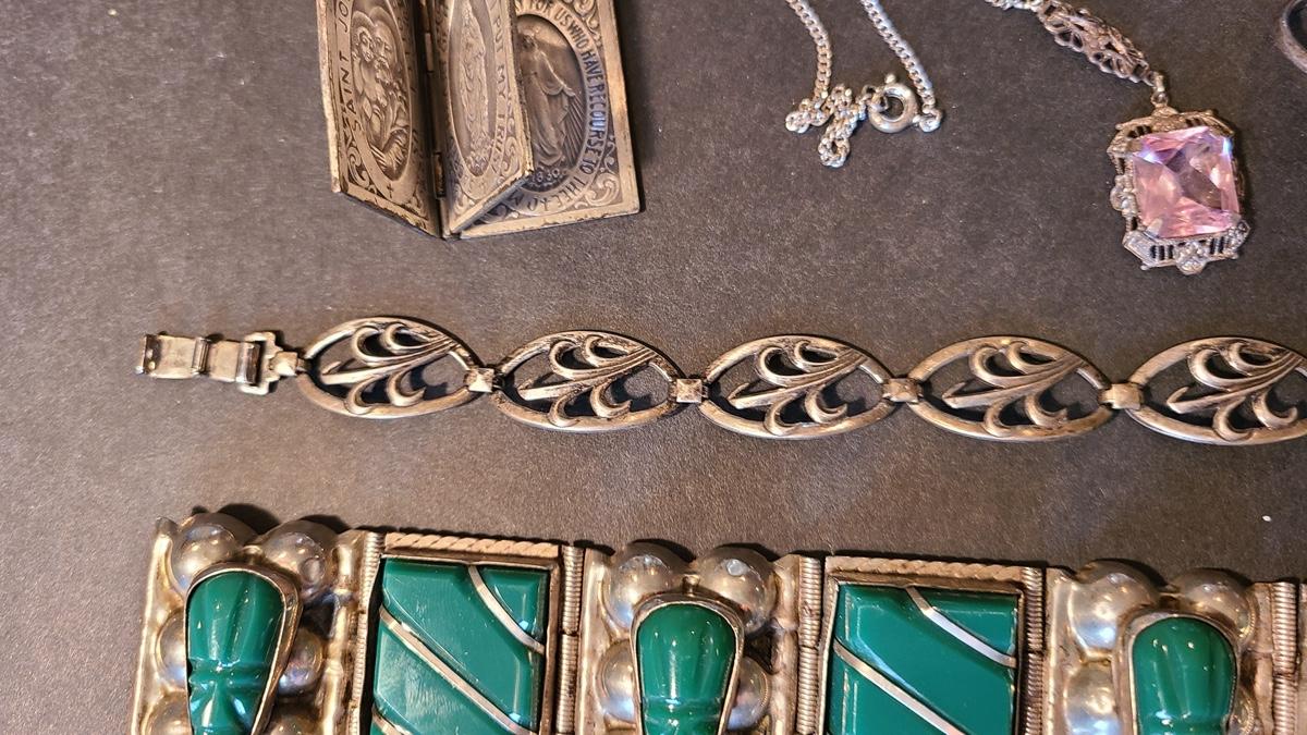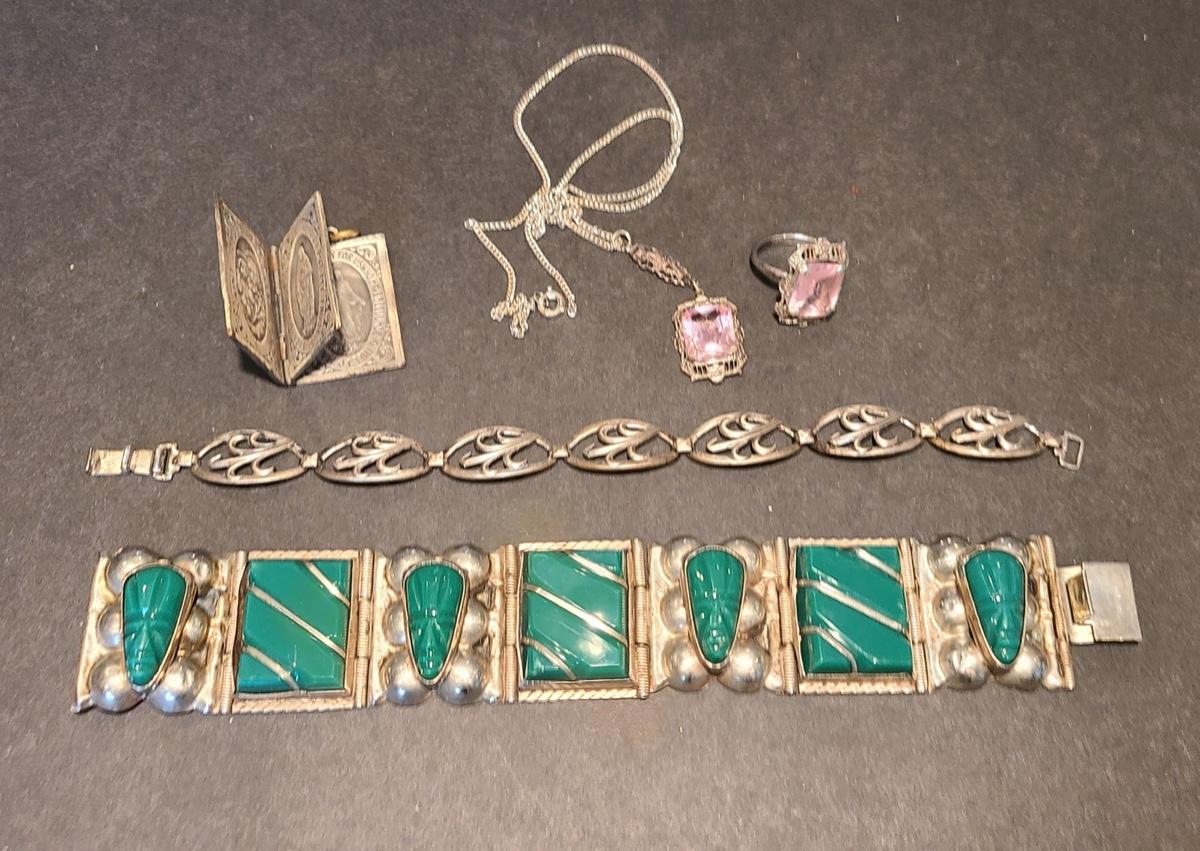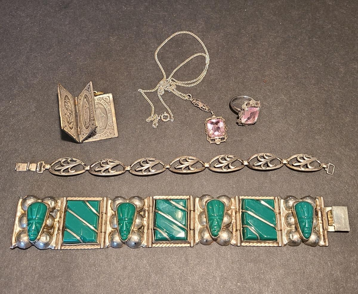 Unique lot of vintage and antique jewelry. The ring and necklace match, but only the ring is marked sterling and has an old piece of pink glass in it. The bracelets are not marked sterling. Unique to this lot is the page turning, religious pendant, not marked sterling. Please see all pictures for content of the lot, condition of the lot, and measurements if taken. Pictures are the best representation of the items listed and items are untested unless indicated in description. Thank you for looking and have fun bidding!