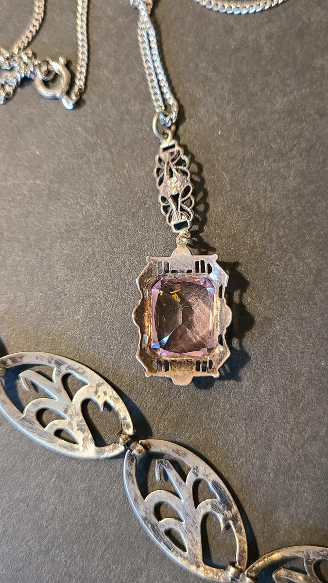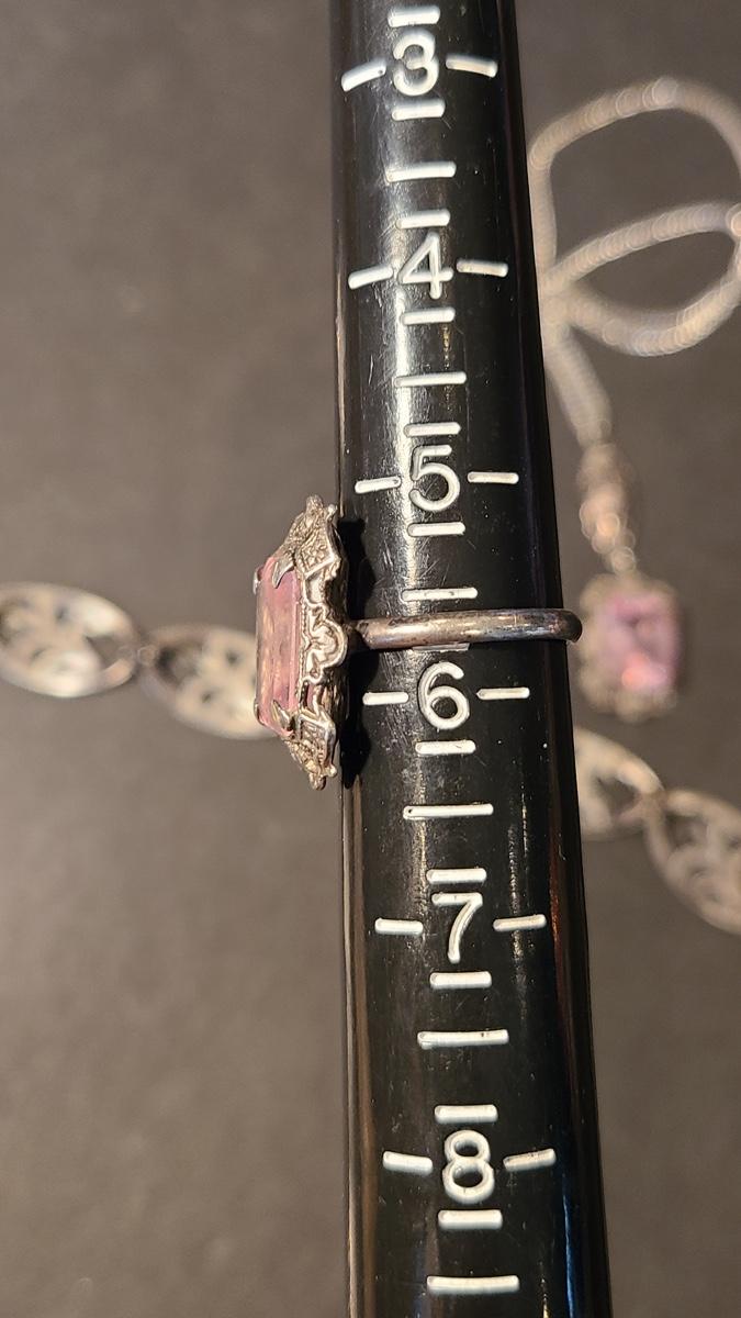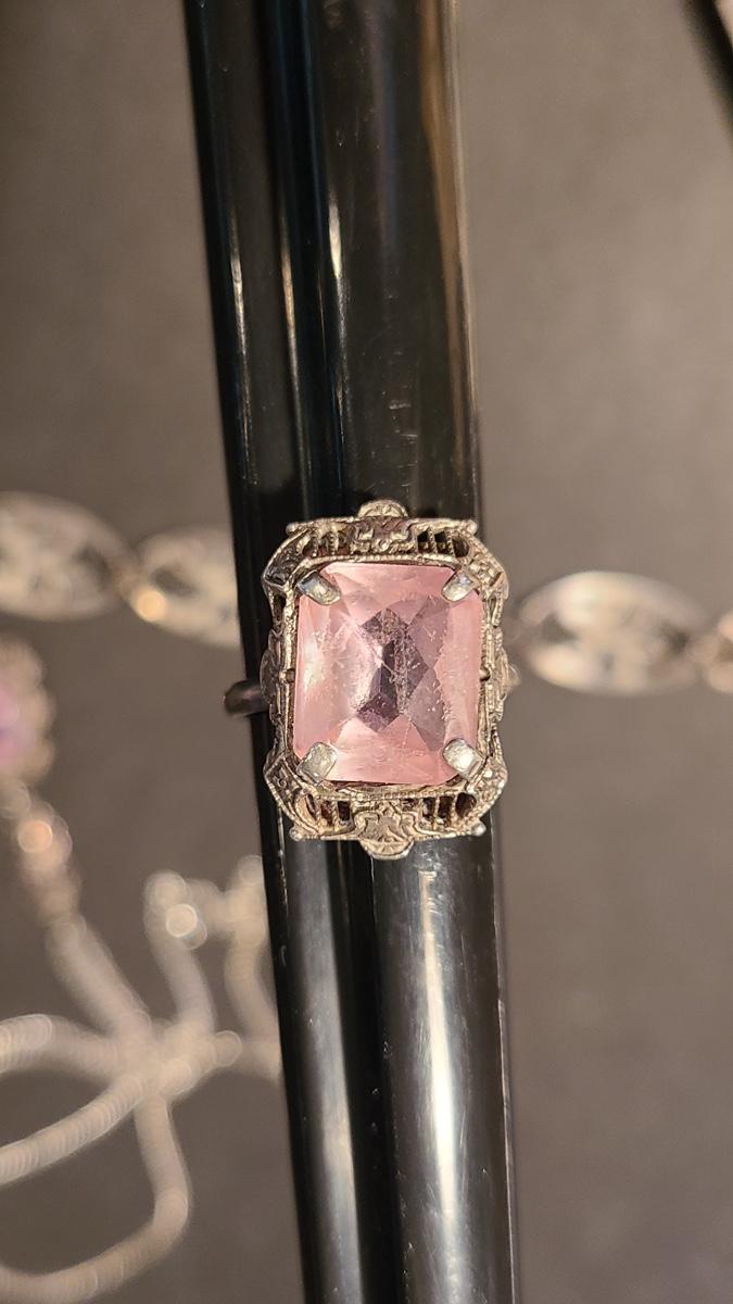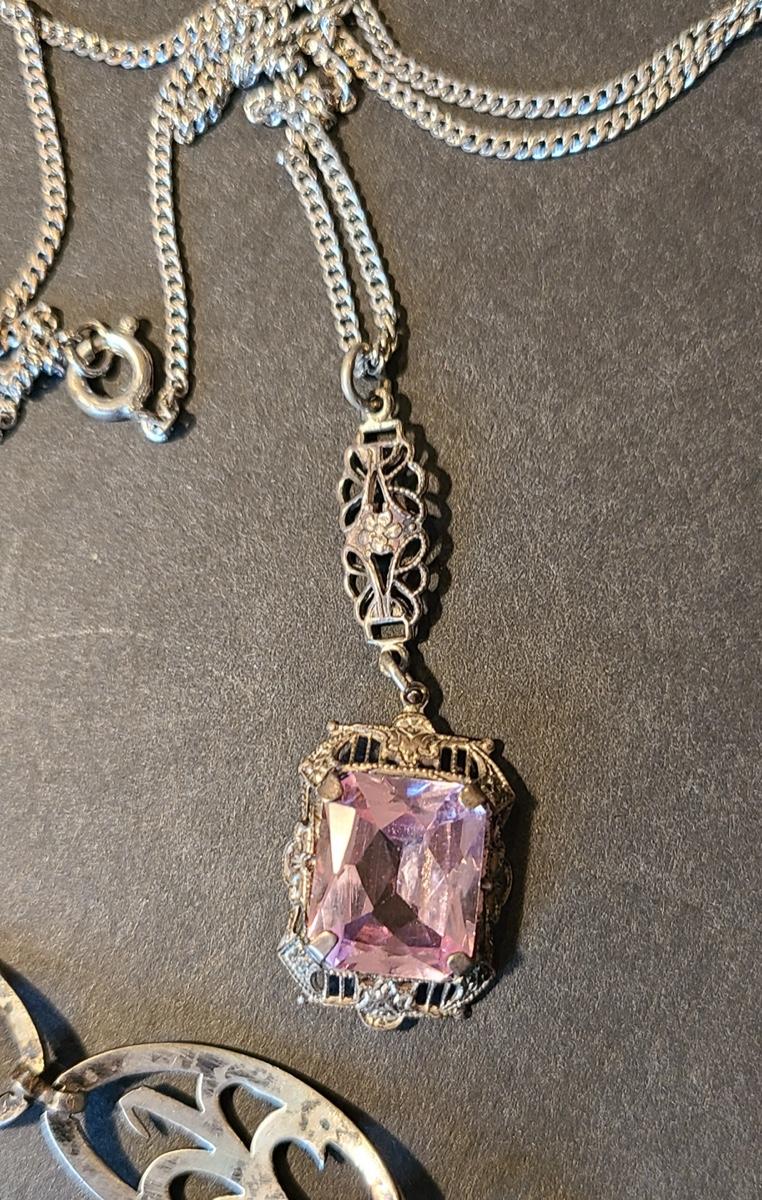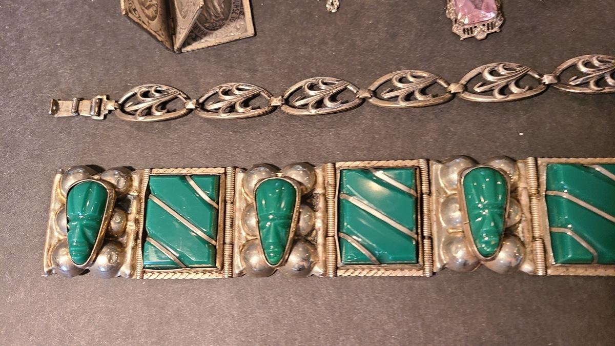 Unique lot of vintage and antique jewelry. The ring and necklace match, but only the ring is marked sterling and has an old piece of pink glass in it. The bracelets are not marked sterling. Unique to this lot is the page turning, religious pendant, not marked sterling. Please see all pictures for content of the lot, condition of the lot, and measurements if taken. Pictures are the best representation of the items listed and items are untested unless indicated in description. Thank you for looking and have fun bidding!