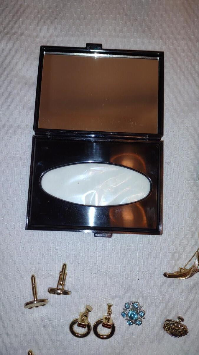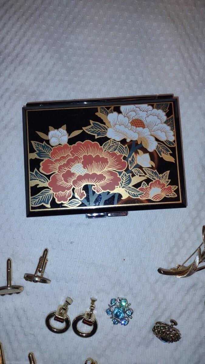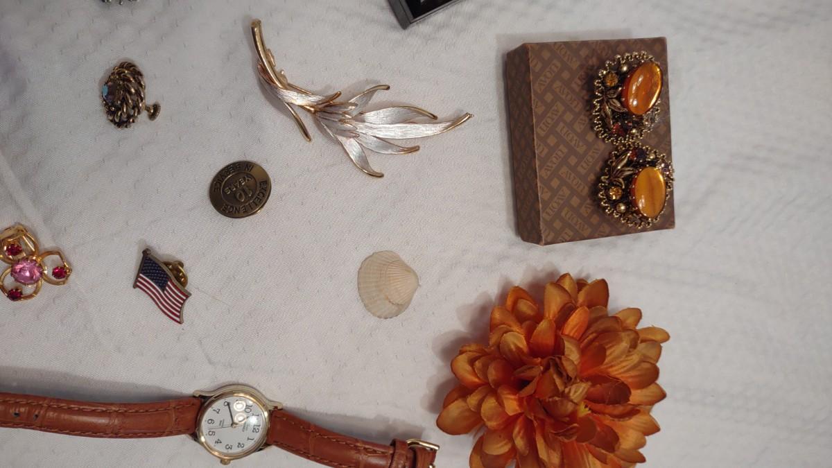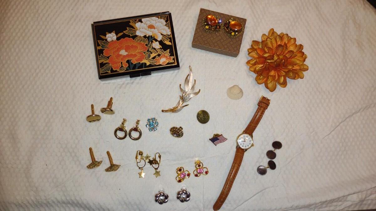 CLIP ON EARRINGS FOR EVERY OCCASION. A ORANGE FLOWER HAIR CLIP, BEAUTIFUL BLACK JEWELRY BOX, TIMEX INDIGLO WATCH