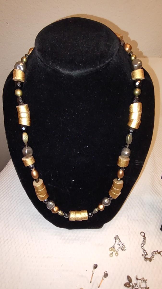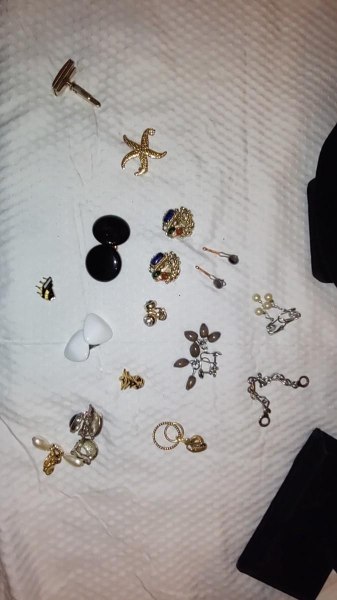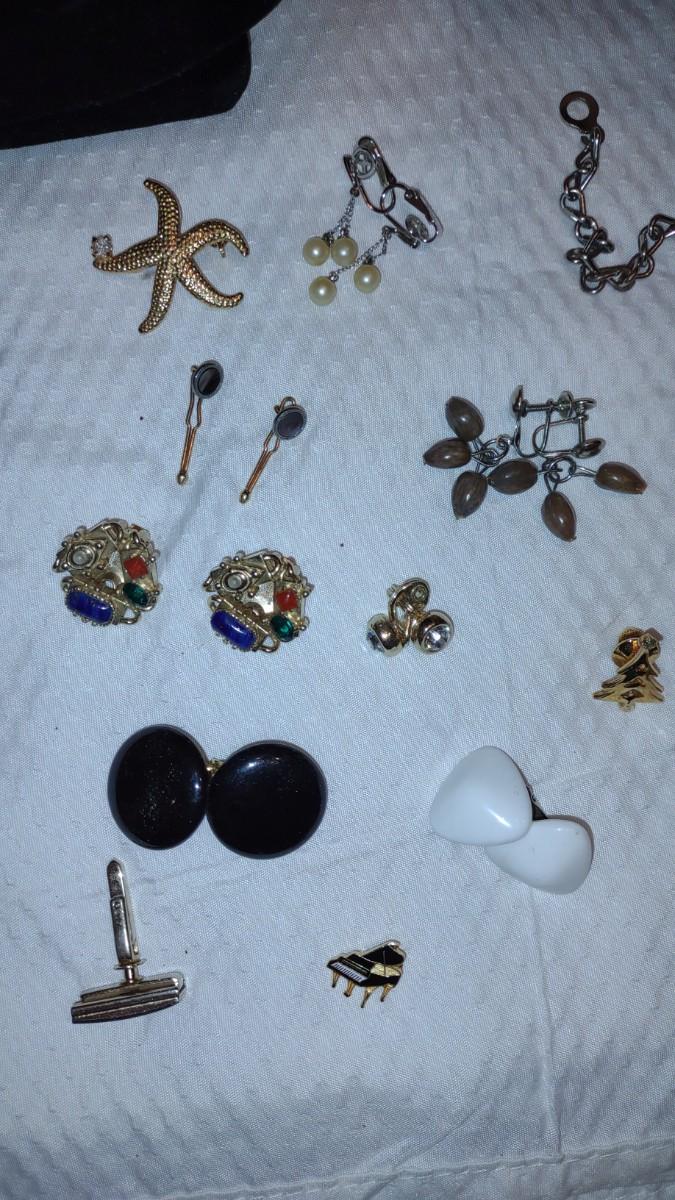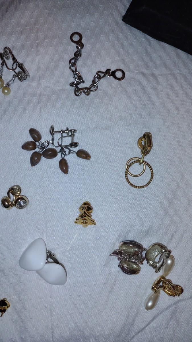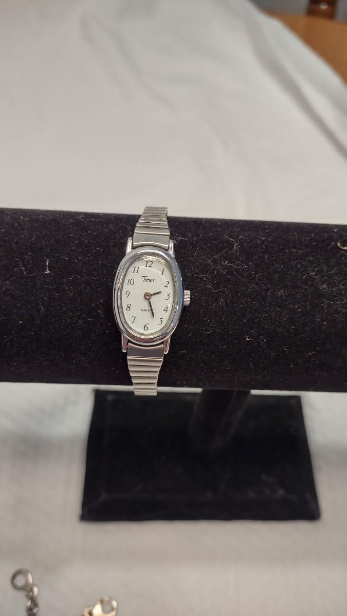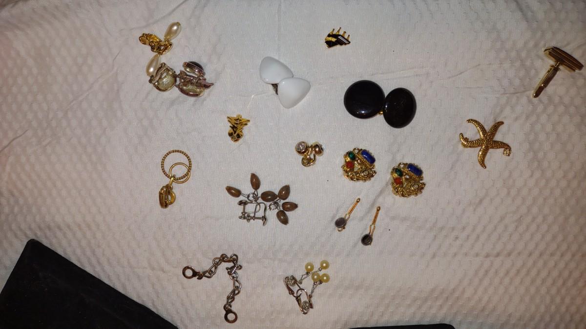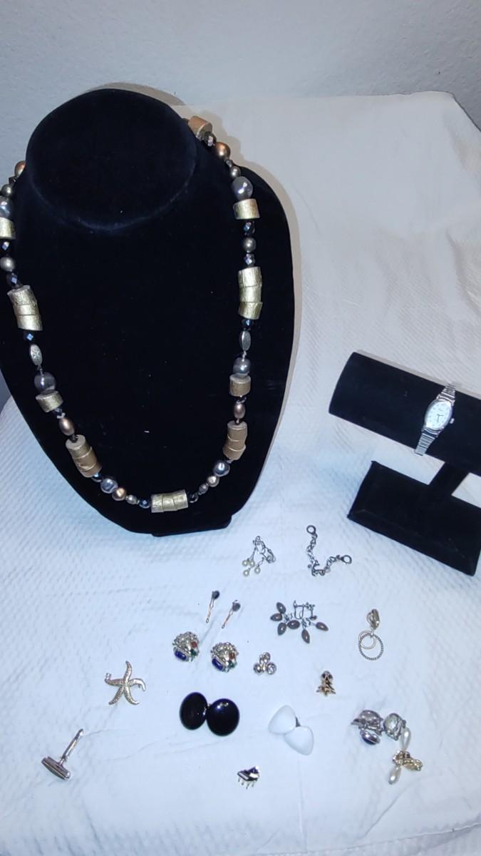 A GREAT COLLECTION OF CLIP-ON EARRINGS. VERY UNIQUE BEADED NECKLACE, SILVER TONE TIMEX WATCH.