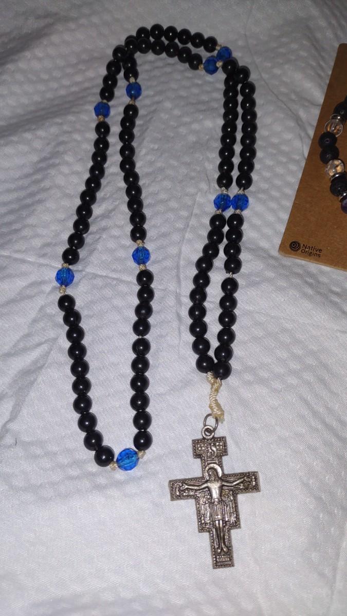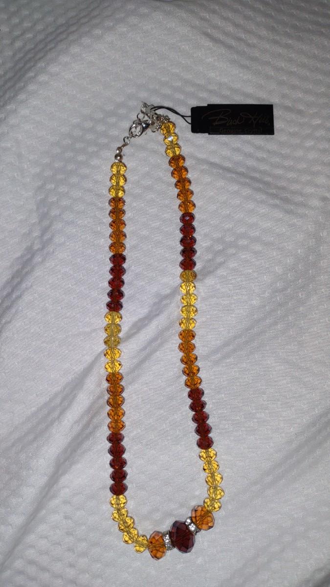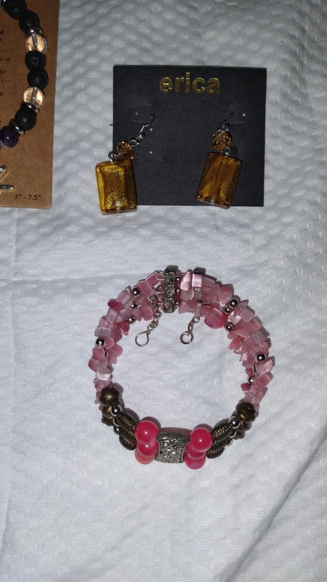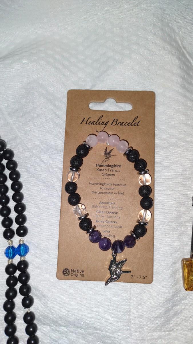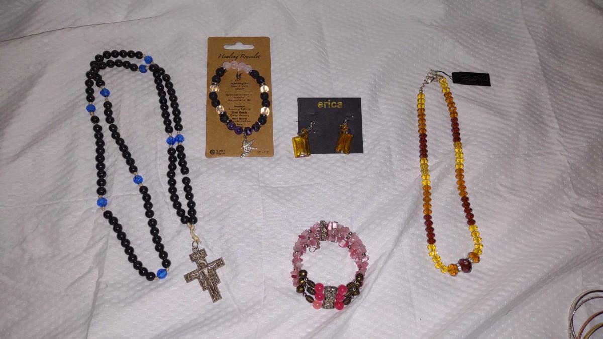 ERICA EARRINGS, A GENUINE CRYSTAL BUCK HILL NECKLACE, HUMMINGBIRD HEALING BRACELET, ROSARY, AND A BEADED BRACELET.