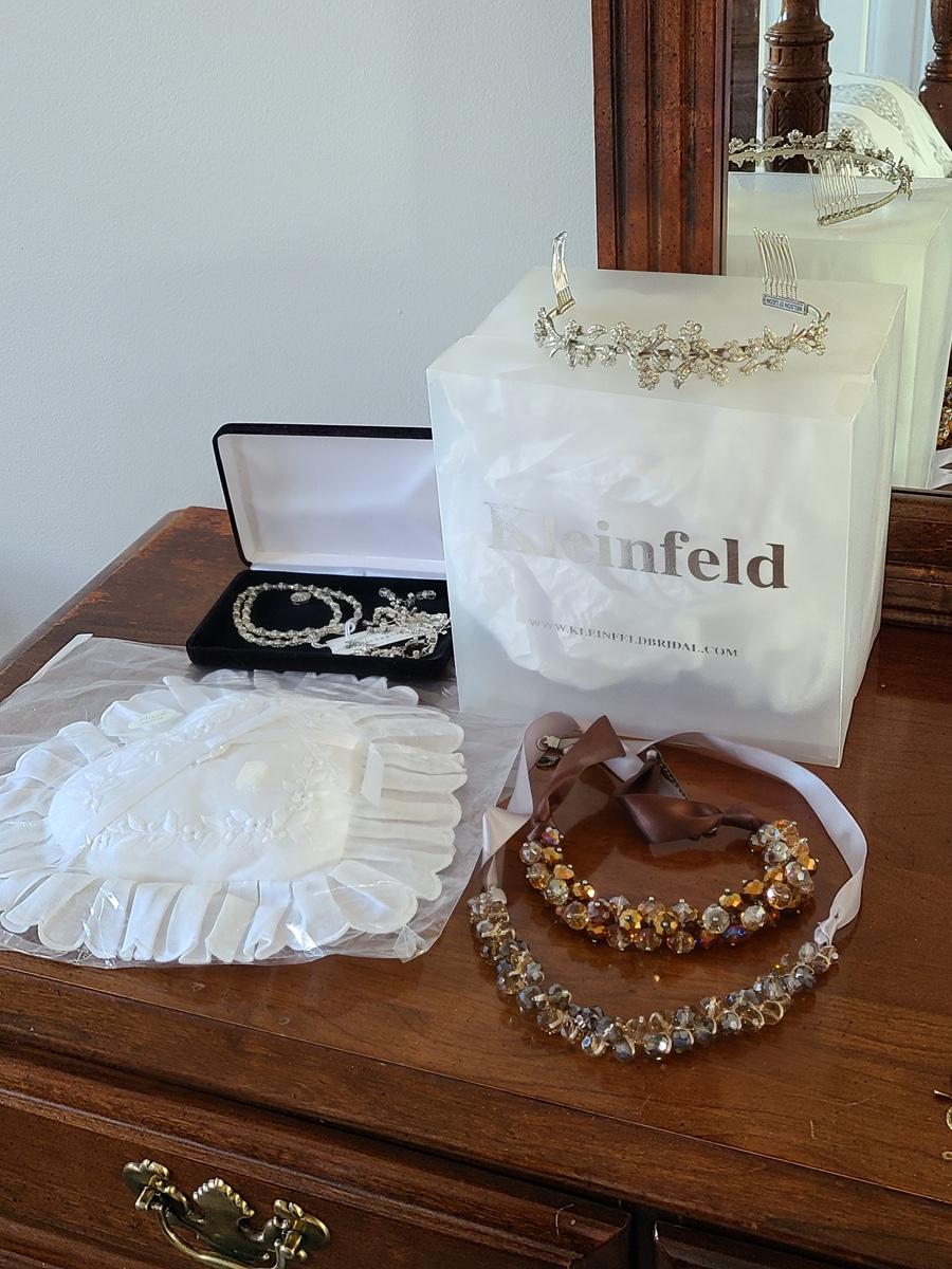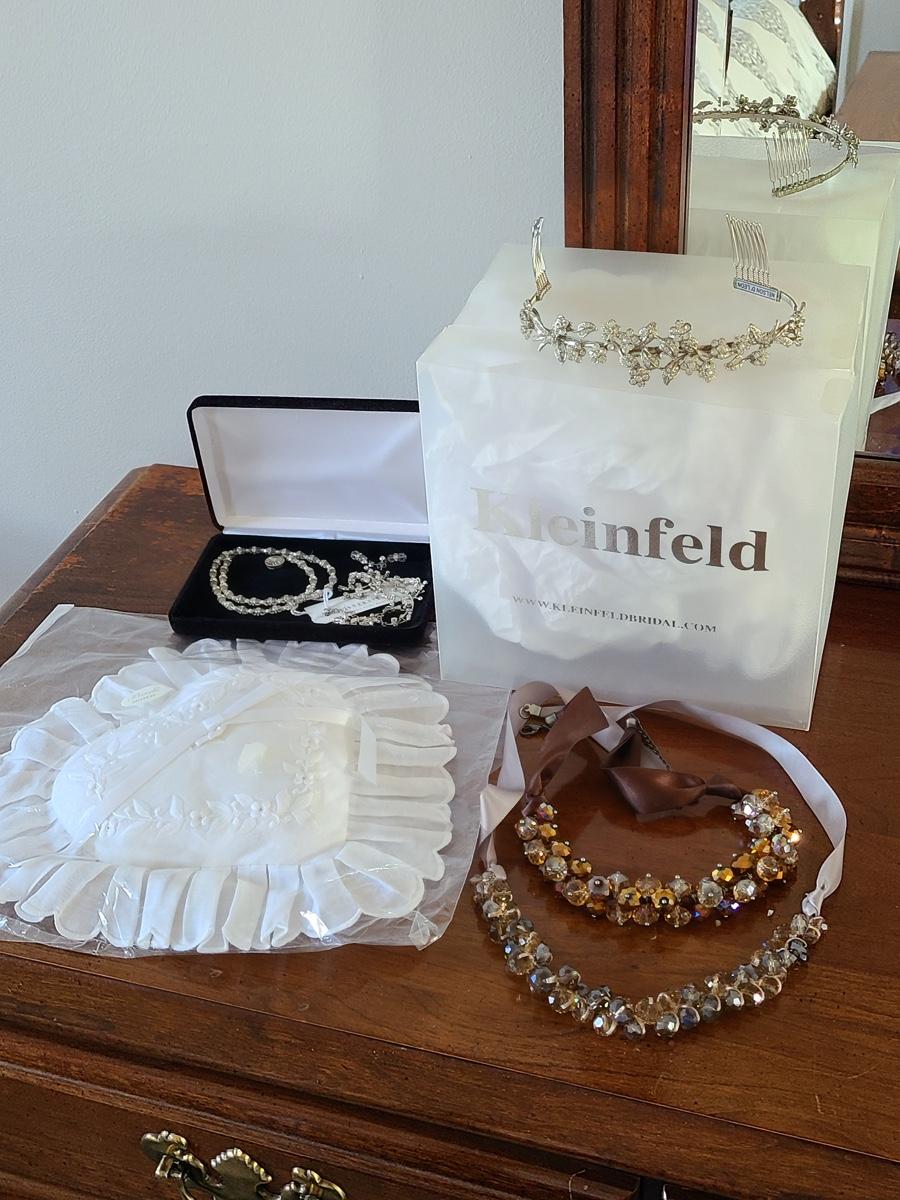 This is the perfect lot for the bride to be and the mother of the bride! Gorgeous beaded and ribbon necklaces, Kleinfeld Beaded Tiera, Bridal pillow and more!! Please see all pictures as they are the best representation of the items in the lot, the condition of the lot, and will show measurements if taken. If purchasing furniture you must be able to move yourself with your own help, and truck. .
