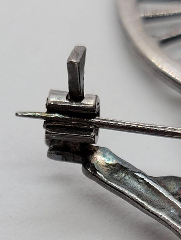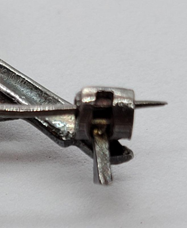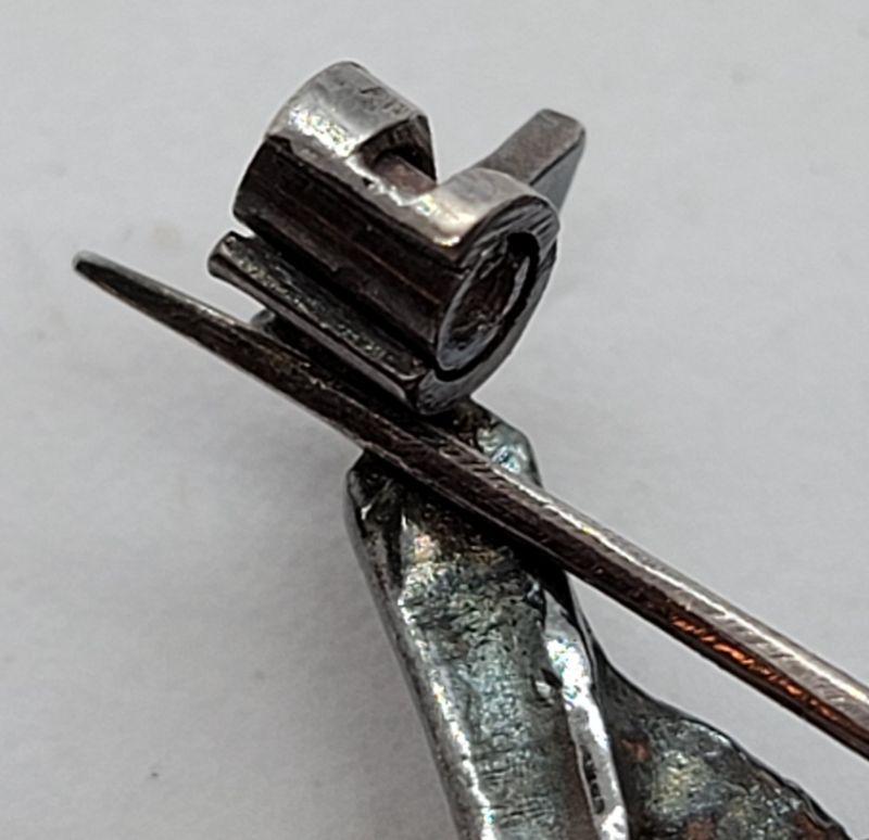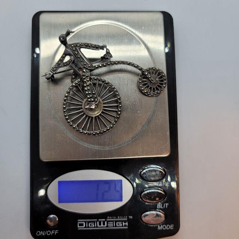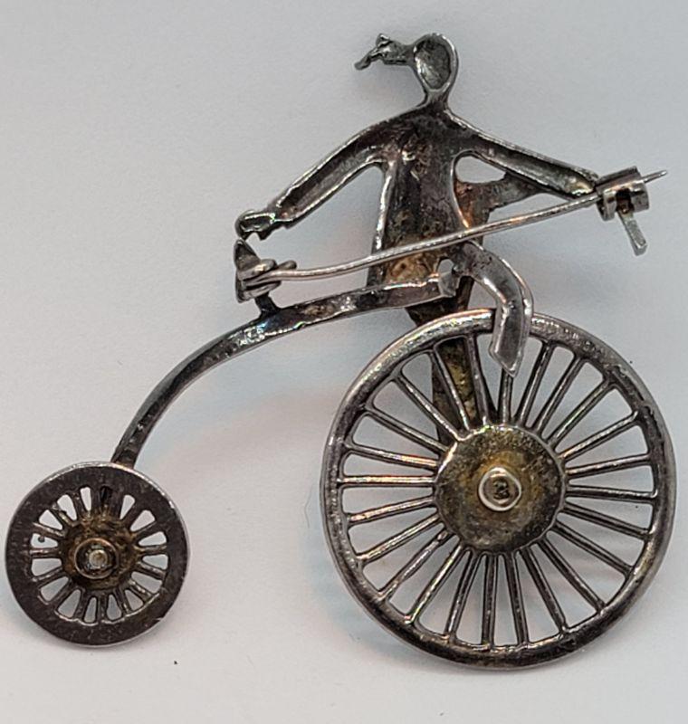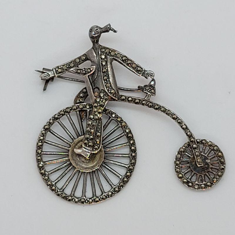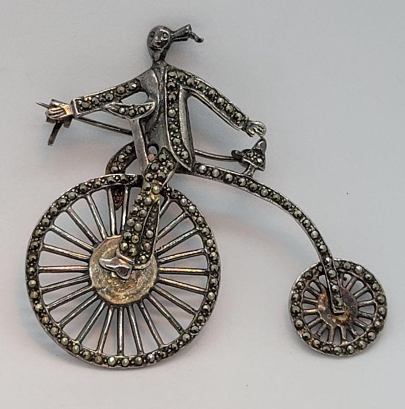Lot JMO4: Large Silver and Marcasite Brooch of a person riding a penny farthing high bike. Articulated wheels.
