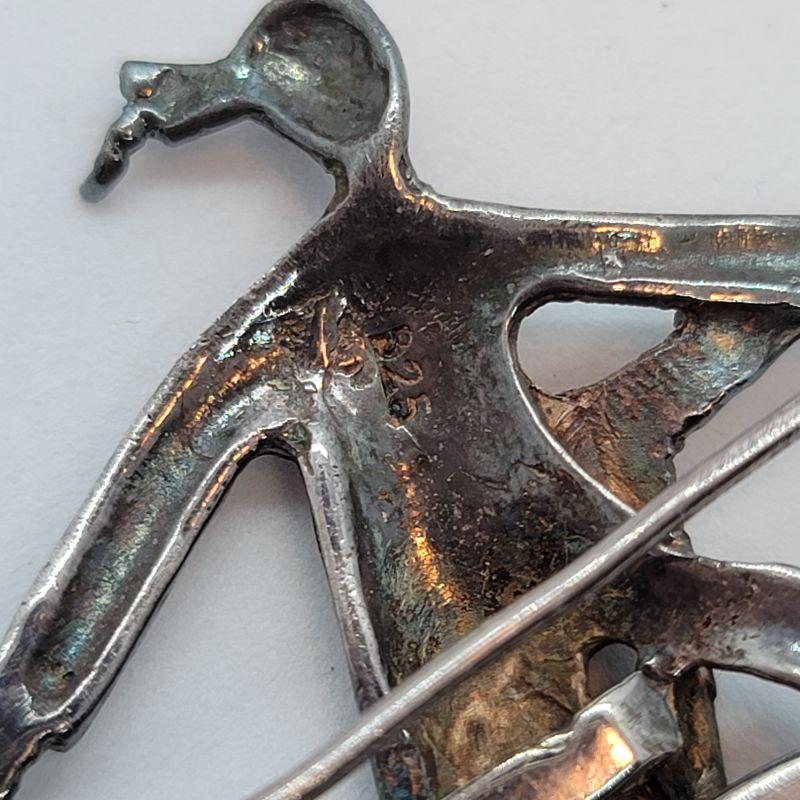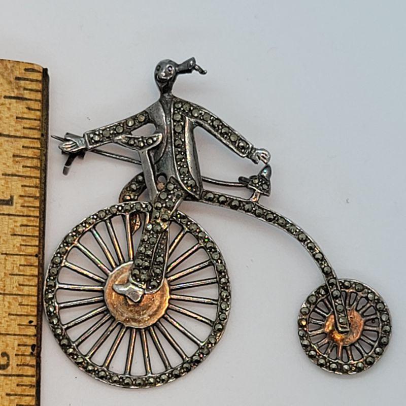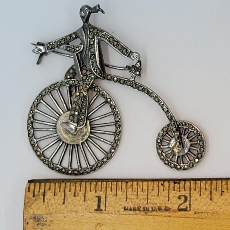 Large Two inch tall Vintage Silver & Marcasite Brooch of a Person Riding a Penny Farthing Bicycle.