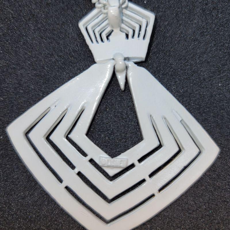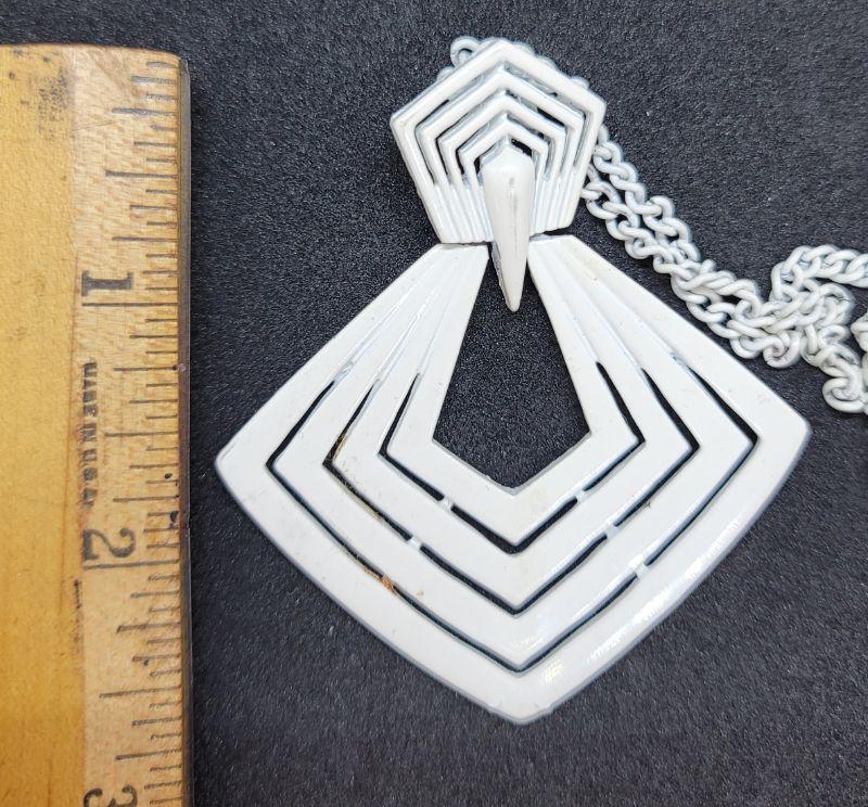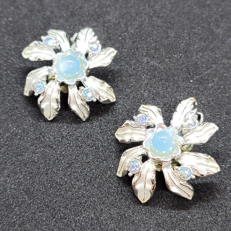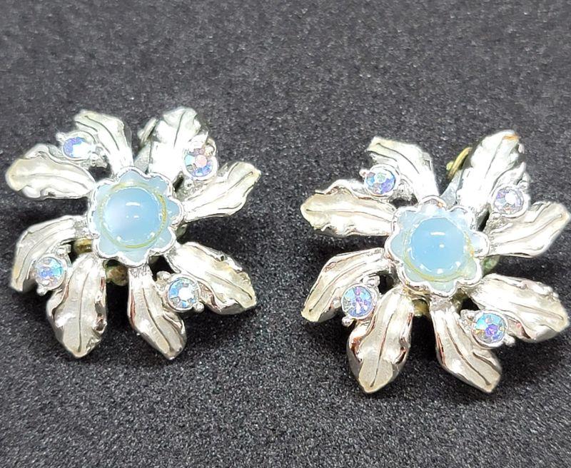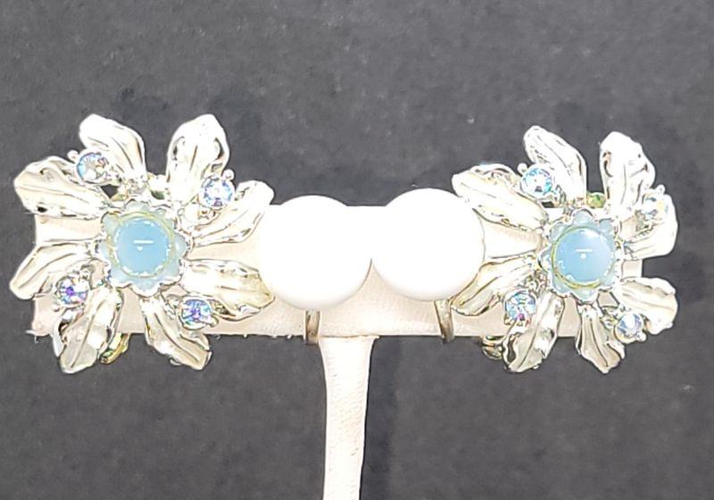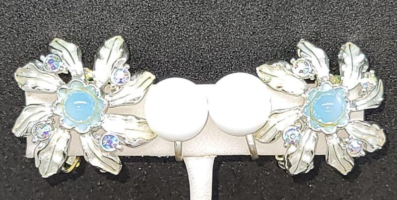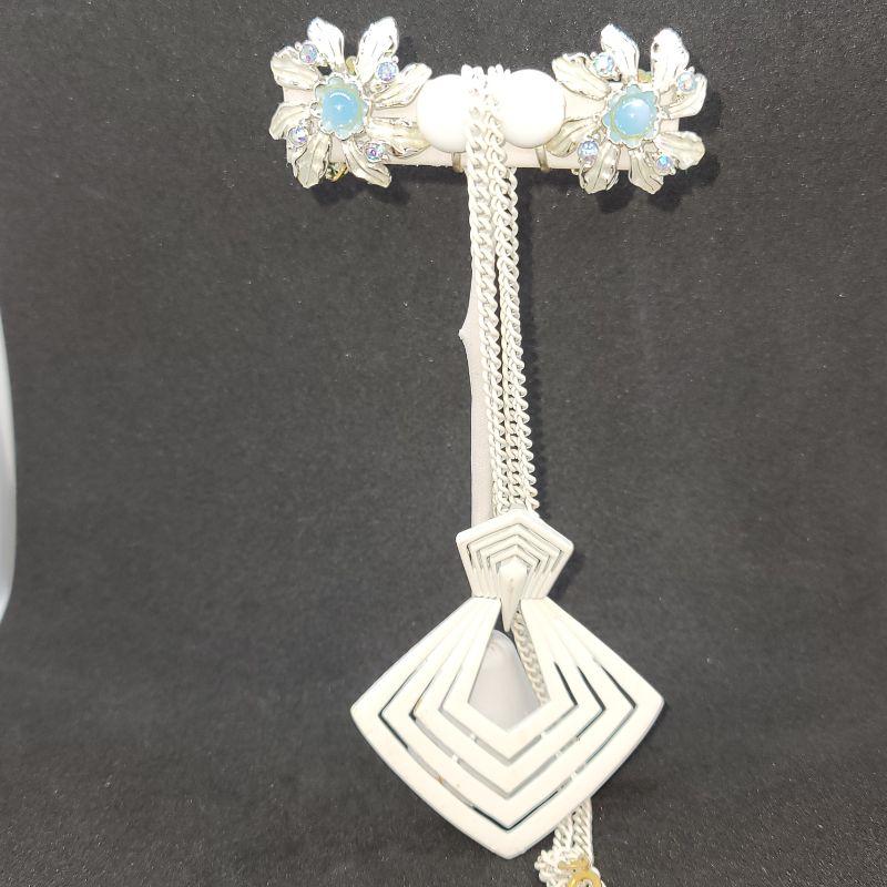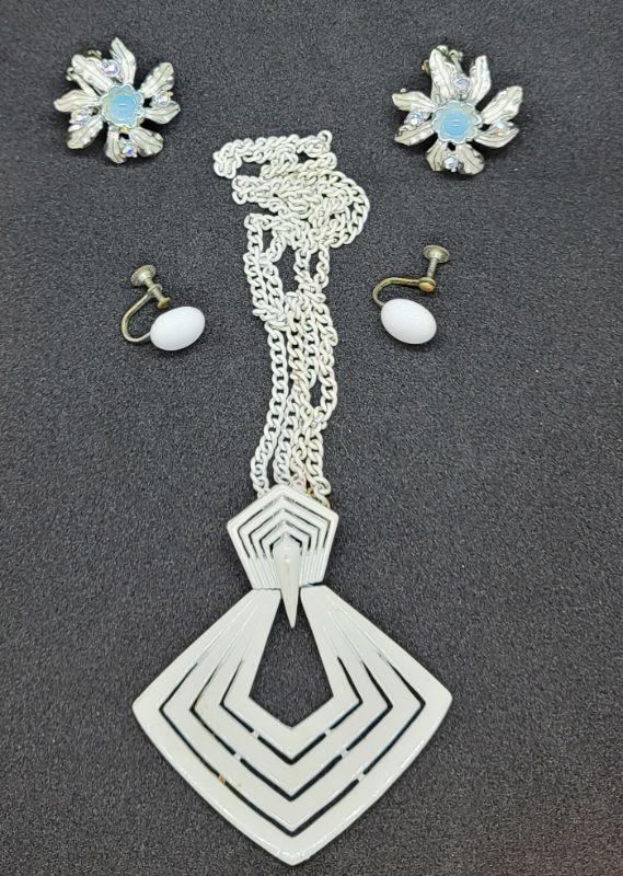 LOT JMO6: 24" LONG WHITE LISNER NECKLACE WITH 3 INCH PENDANT, CLIP ON JUDY LEE EARRINGS WITH AURORA BOREALIS STONES & A MILKY BLUE CENTER BEAD & A PAIR OF WHITE MILK GLASS SCREWBACKS MARKED JAPAN