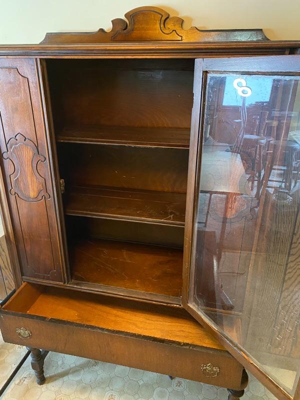 This is a lovely antique display cabinet. It is solid wood with glass front, and carved details. Beautiful as is but up-cycled to a shabby chic grey or white it can be used anywhere in the home. 63”x 39” x 15 deep. . CG Please see all pictures for content of the lot, condition of the lot, and measurements if taken. Pictures are the best representation of the items listed and items are untested unless indicated in description. Thank you for looking and have fun bidding!