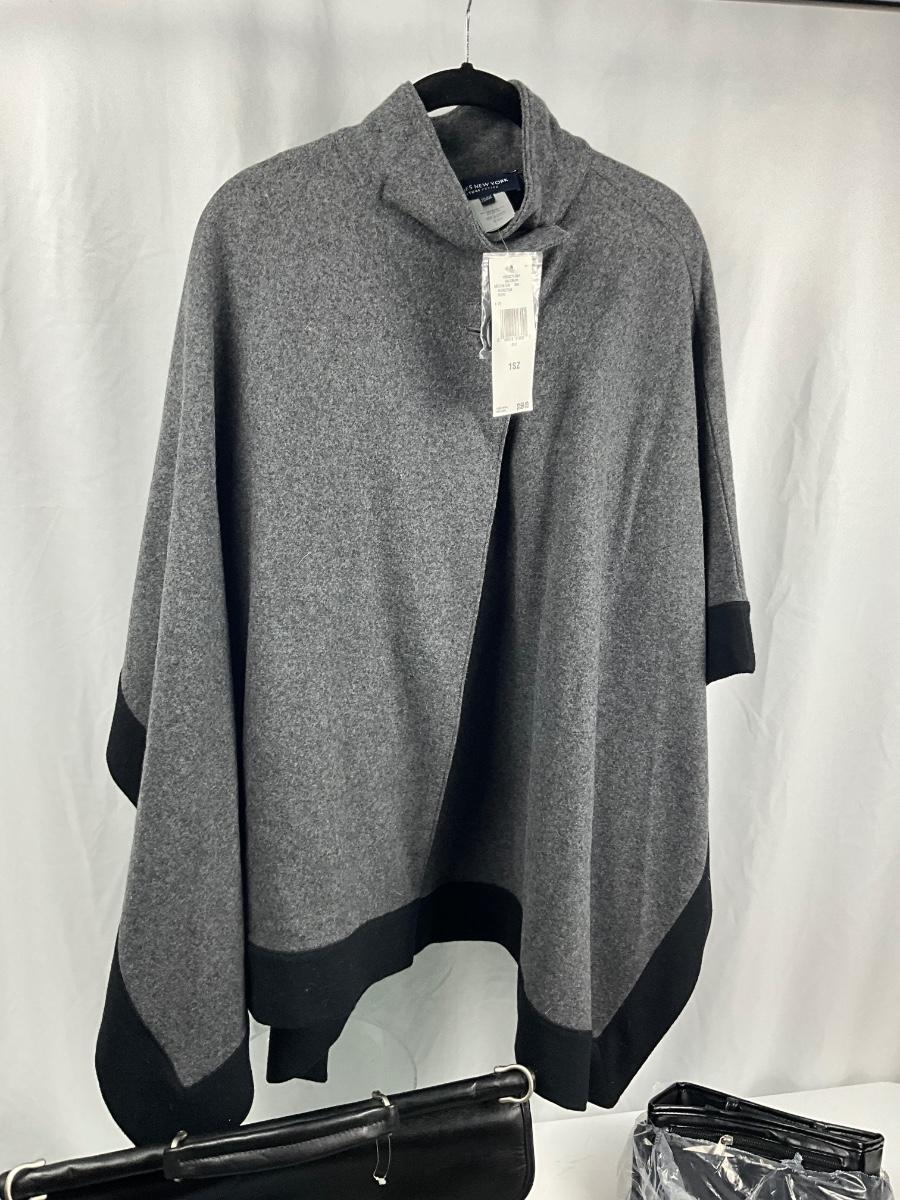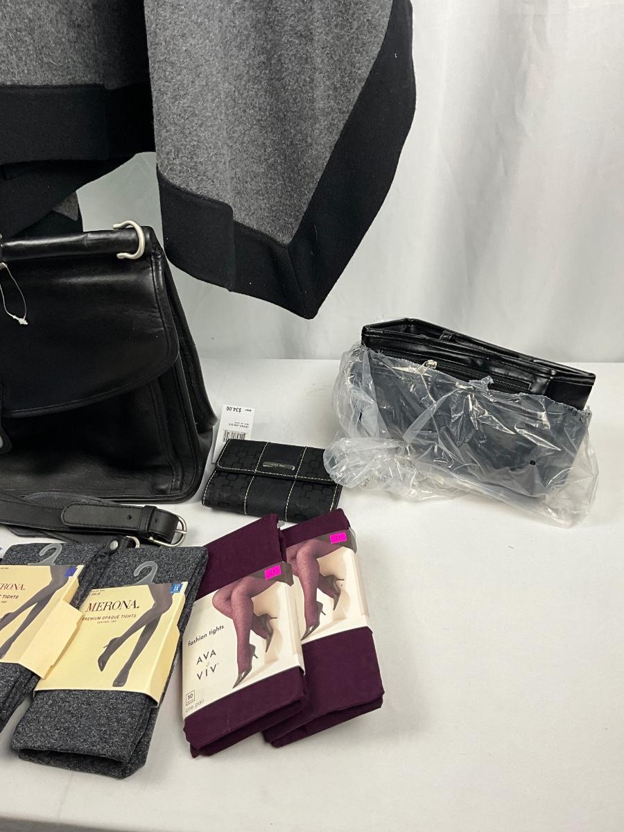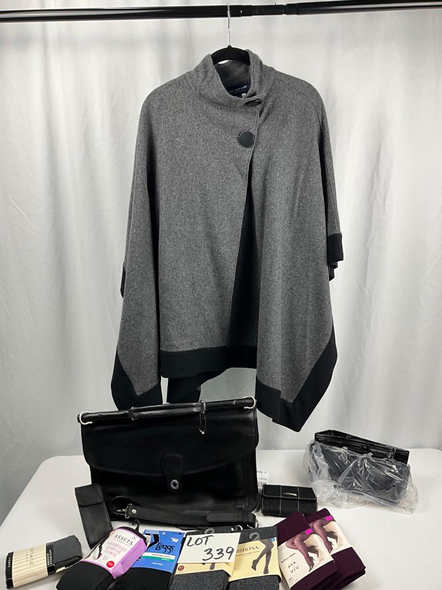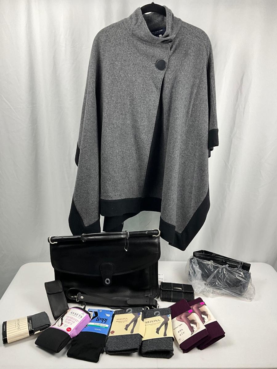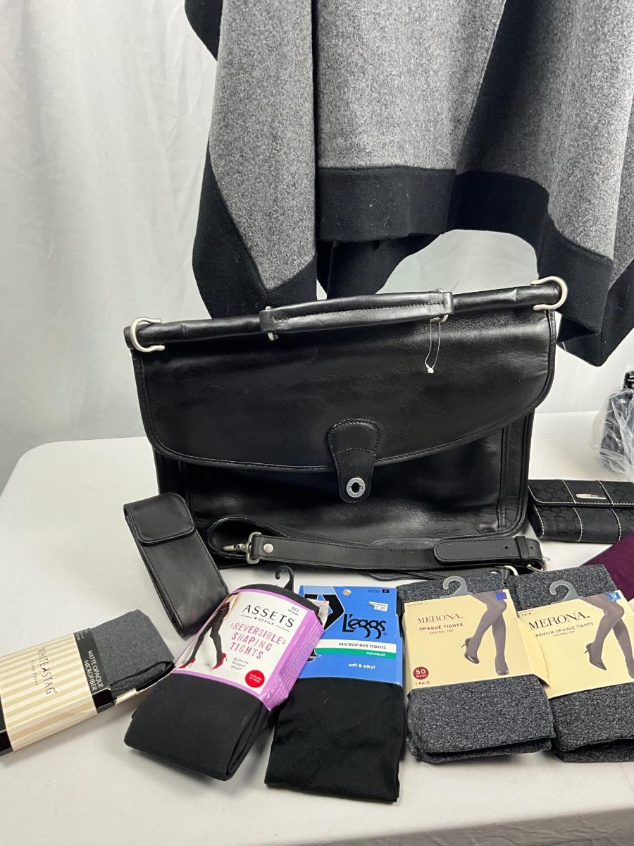 New With Tags Jones New York ladies wool cape. Black leather briefcase with shoulder strap, glasses case, leather organizer, black bifold wallet and new in package tights.