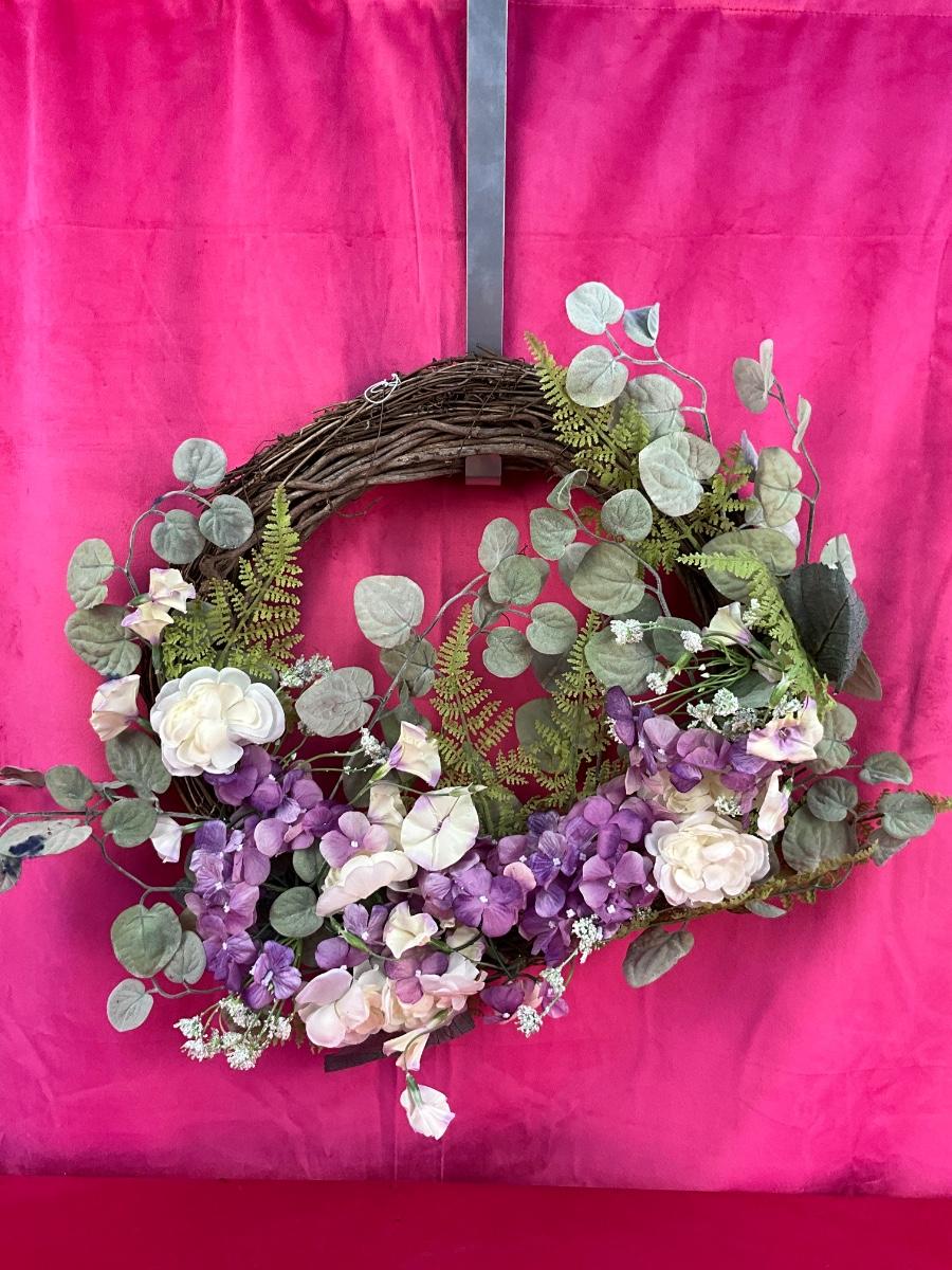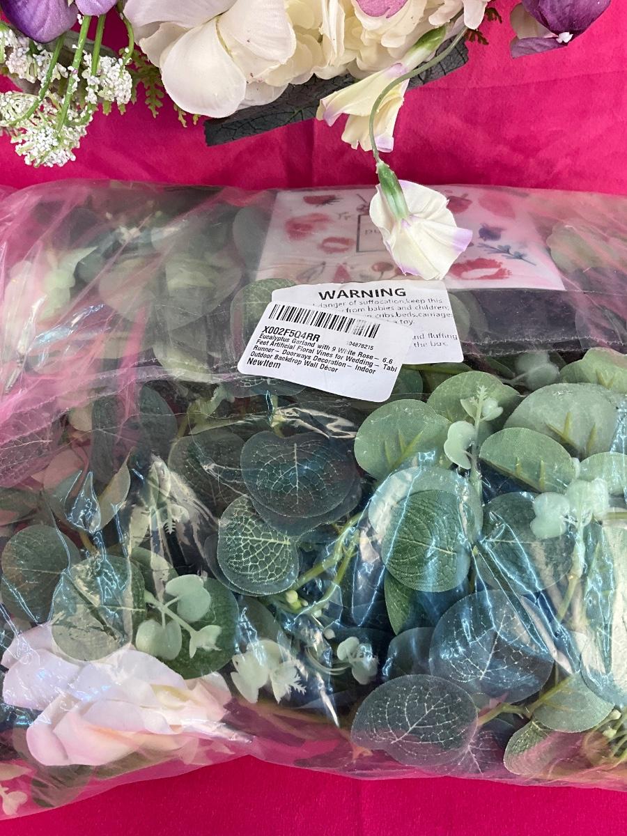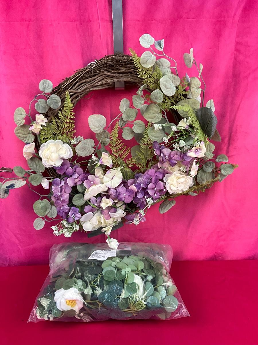 The lot contains a Pier 1 eucalyptus and pansy wreath and a bag of new eucalyptus garland.