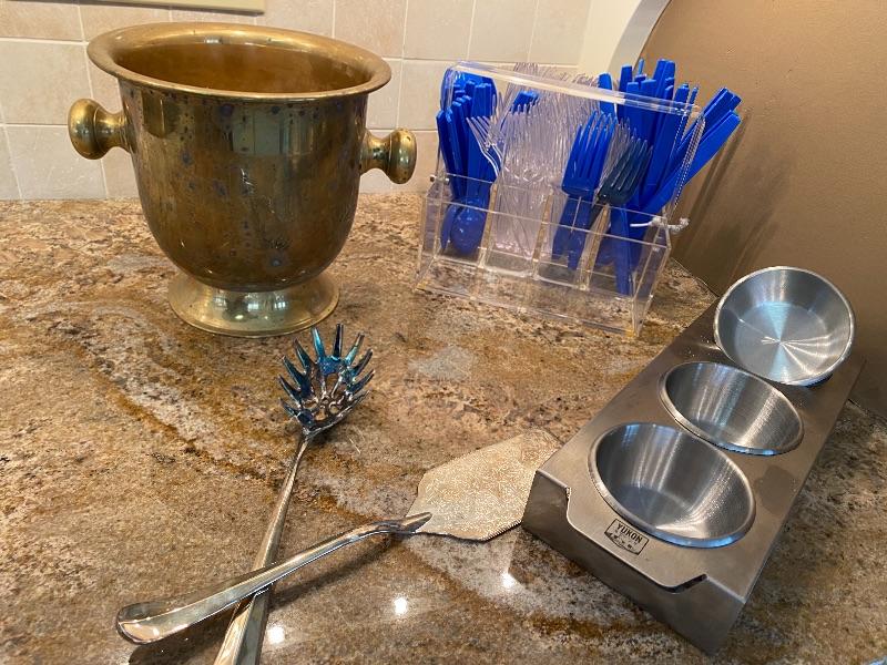 Mixed lot Ice bucket, 3 pc. Relish or condiment tray, silver-plated serving utensils and more. Please see all pictures for content of the lot, condition of the lot, and measurements if taken. Pictures are the best representation of the items listed and items are untested unless indicated in description. Thank you for looking and have fun bidding!