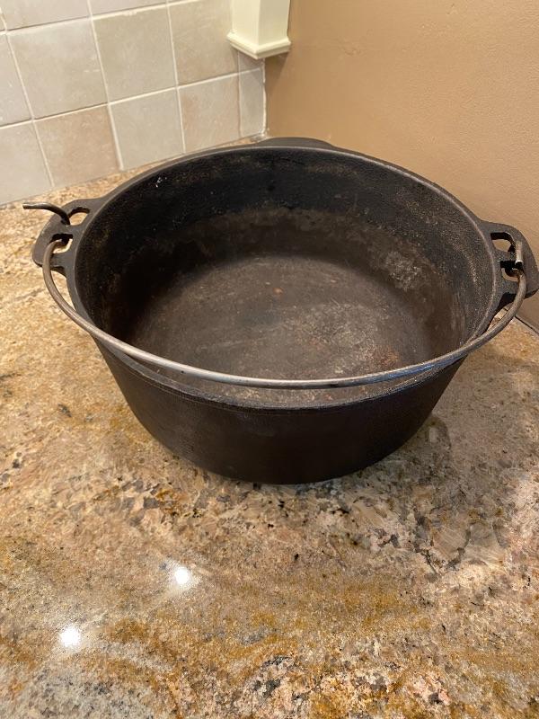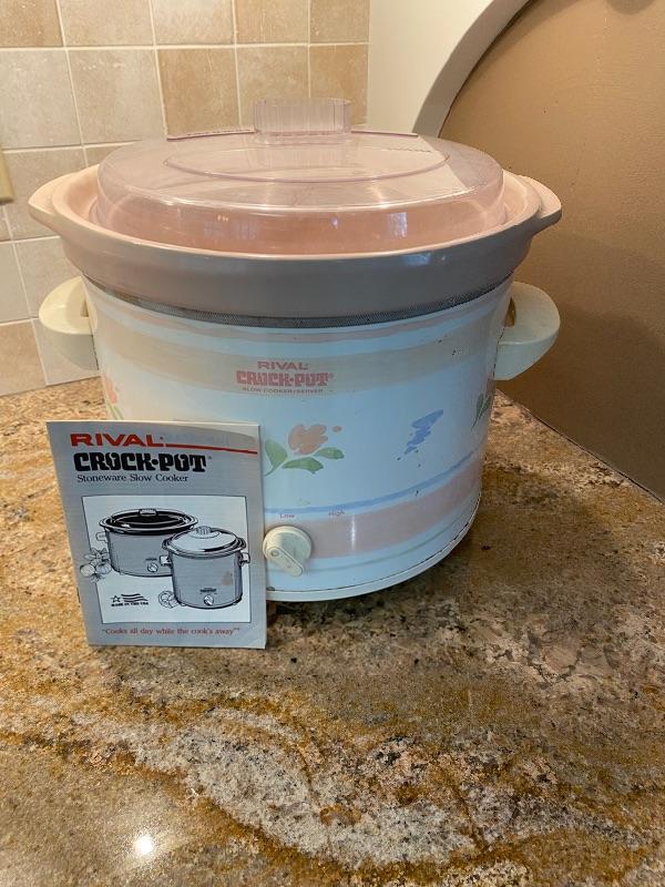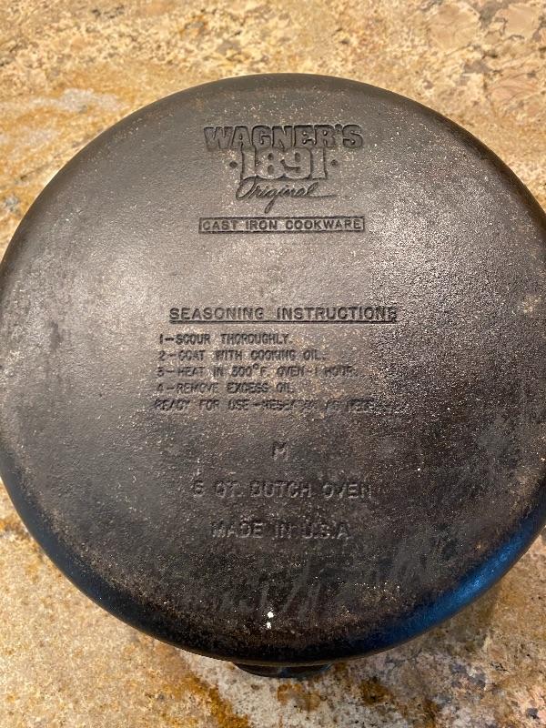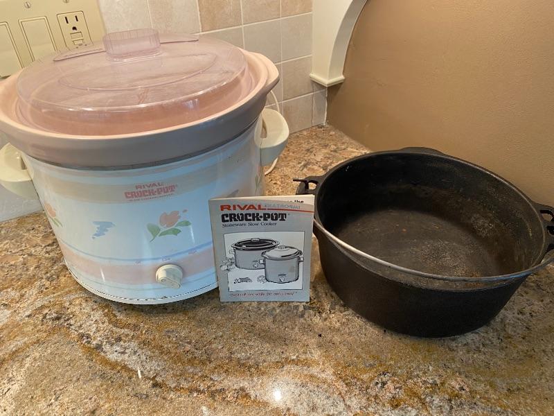 Lot K50: Wagners "1891 original" 5 quart cast iron Dutch oven made in USA and a Rival round crockpot