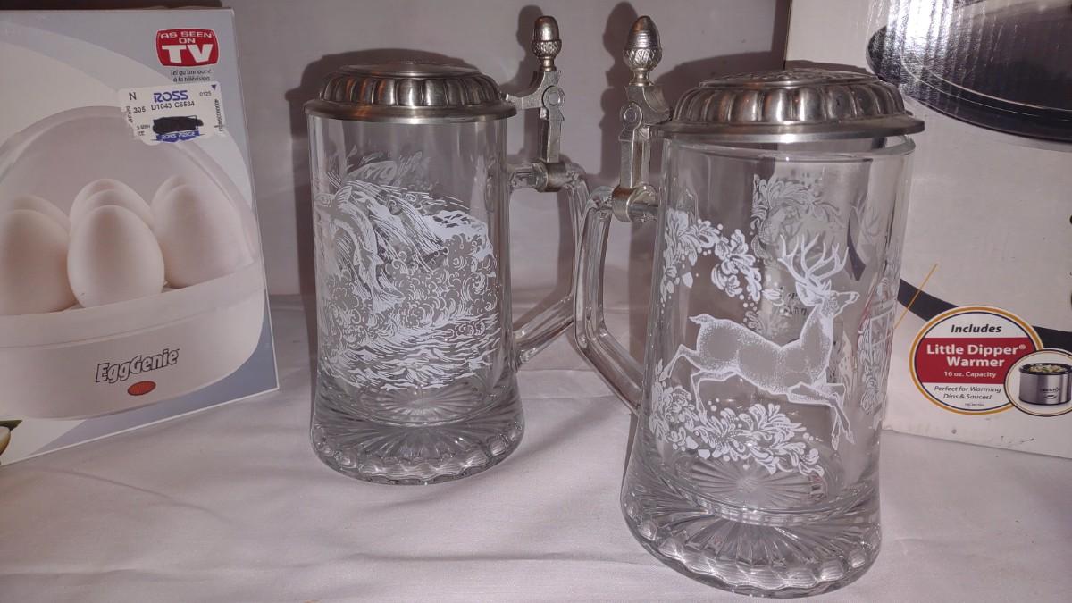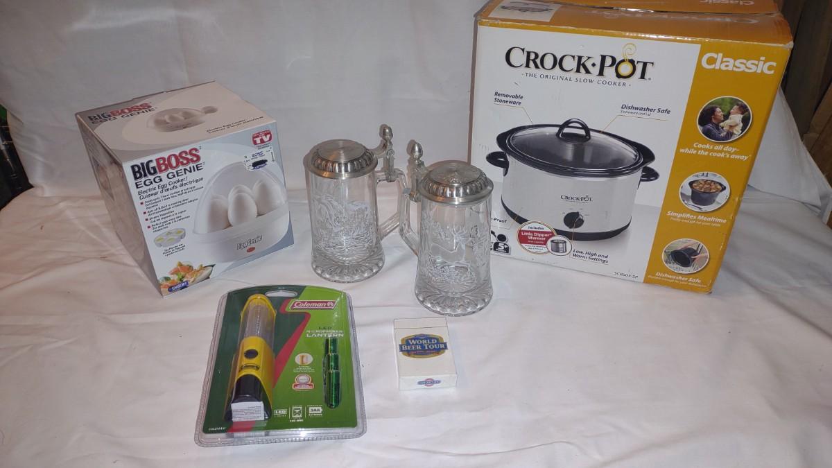 BRAND NEW CROCKPOT, COLEMAN LED LANTERN. EGG GENIE. FROSTED STEINS.