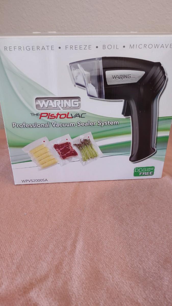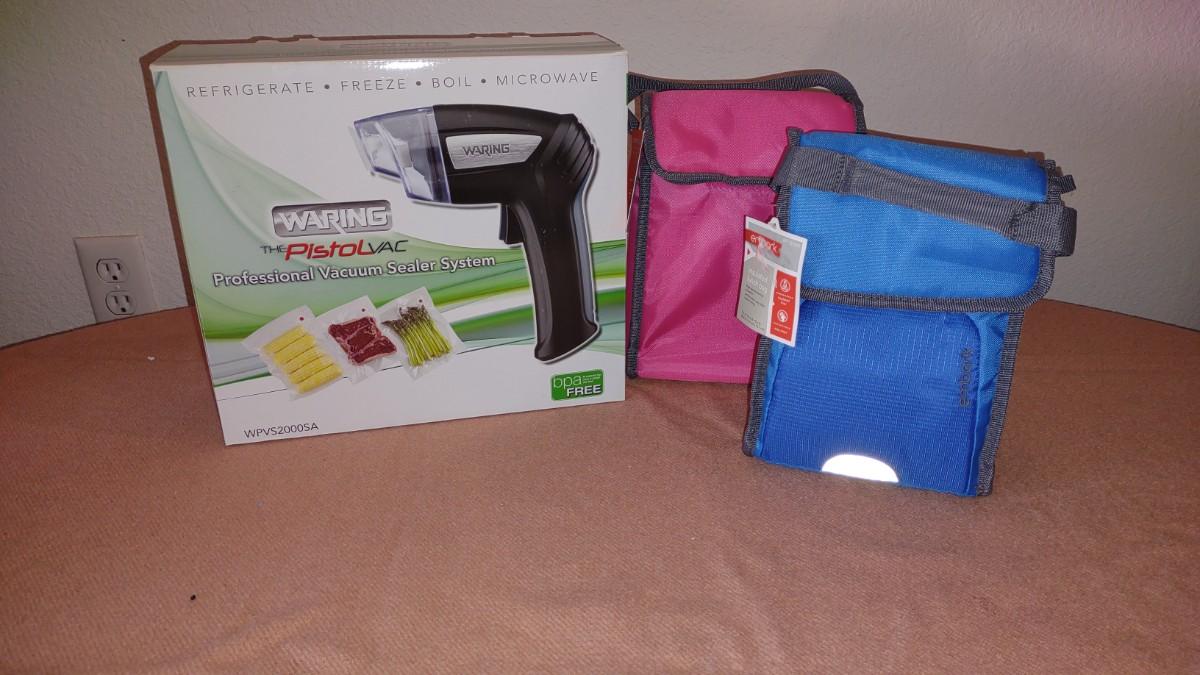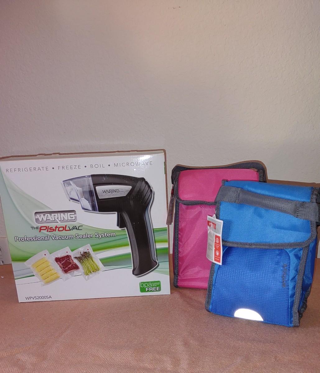 BRAND NEW WARING PISTOL VAC PROFESSIONAL SEALER SYSTEM AND TWO NEW INSULATED LUNCH BAGS.