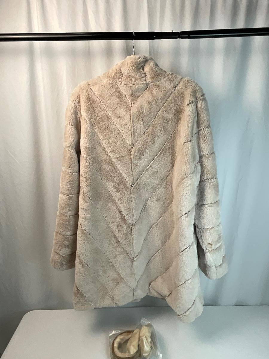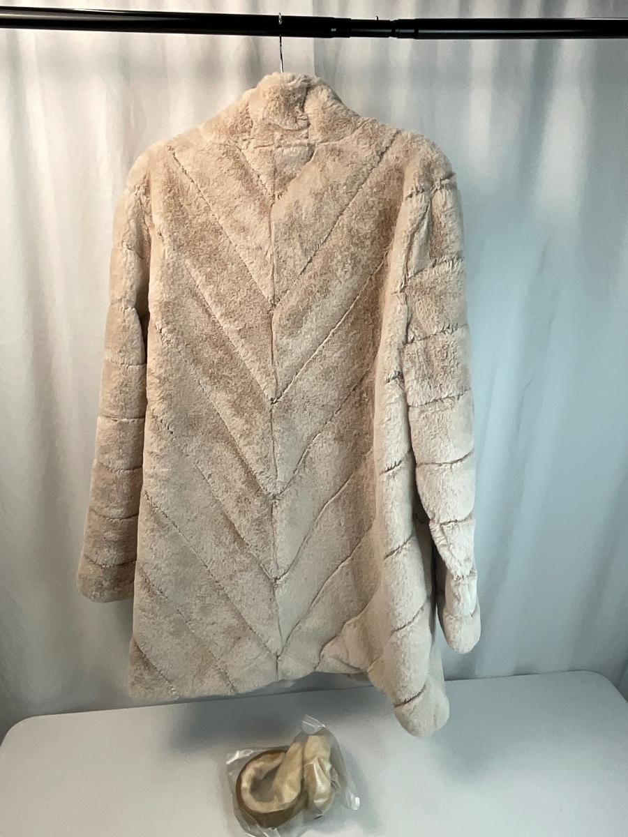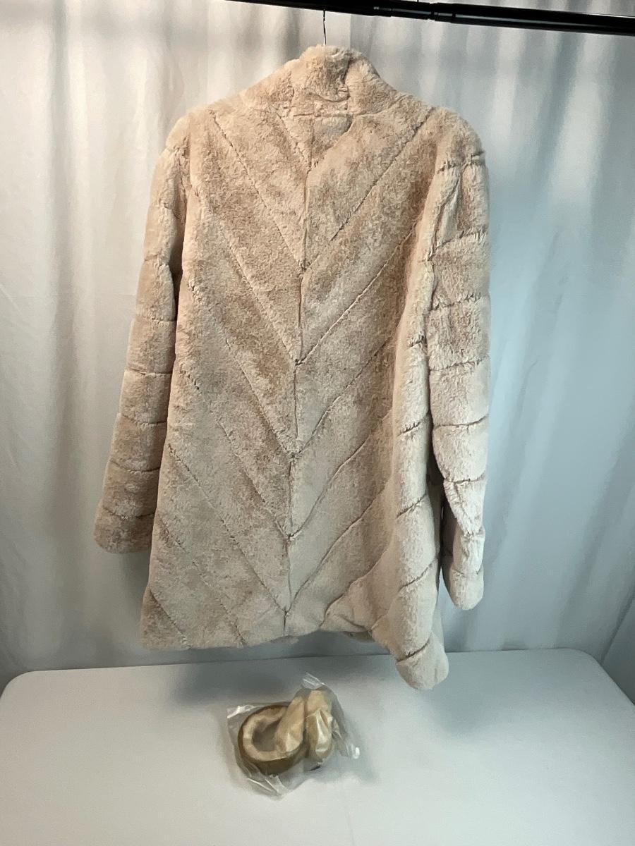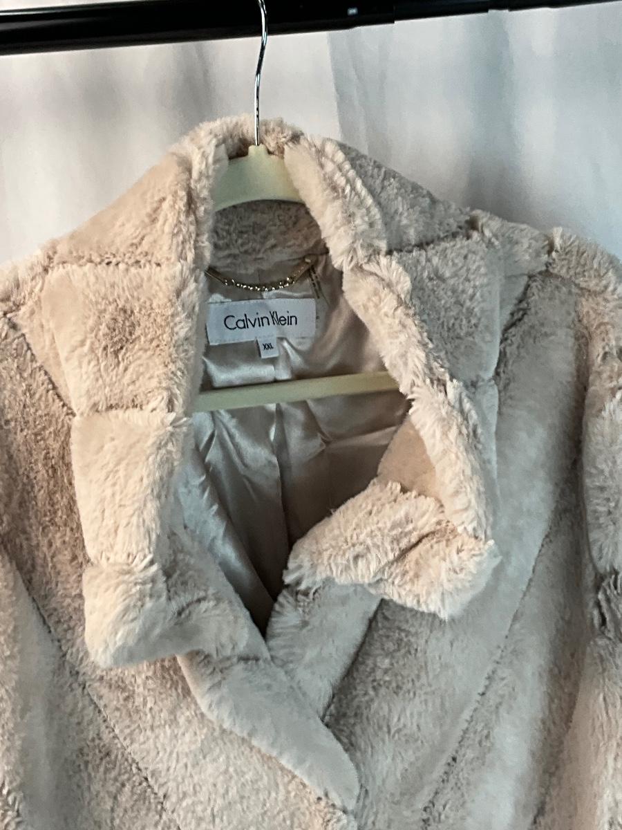 Calvin Klein women’s faux fur mid length coat, color is Blush Pink, size XXL. Faux fur earmuffs.