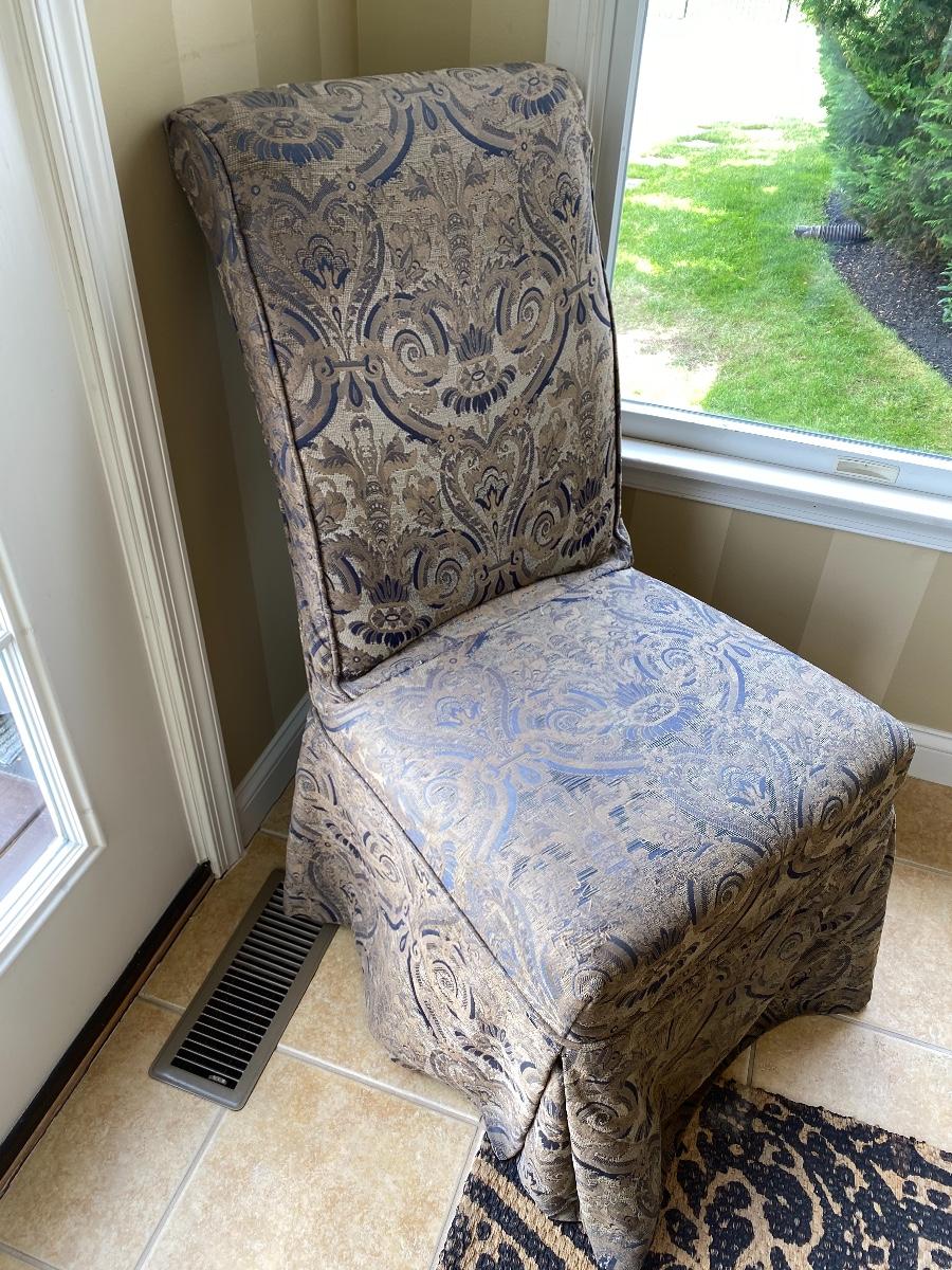 Dining/accent chair w removable slip cover. 22x27x41 Please see all pictures for content of the lot, condition of the lot, and measurements if taken. Pictures are the best representation of the items listed and items are untested unless indicated in description. Thank you for looking and have fun bidding!