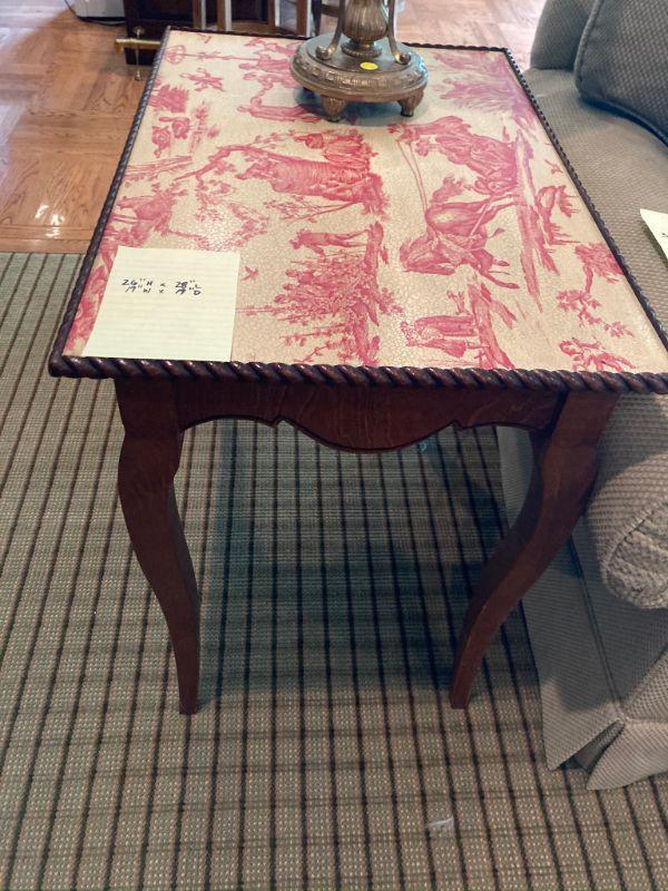 This beautiful faux toile top table is beautiful in person and the wood base has a scrolled carved wood edge. An excellent addition to any room . Pale yellow and Red top with mahogany colored base. 28 x 19 x 26 inches. Good luck and happy bidding!