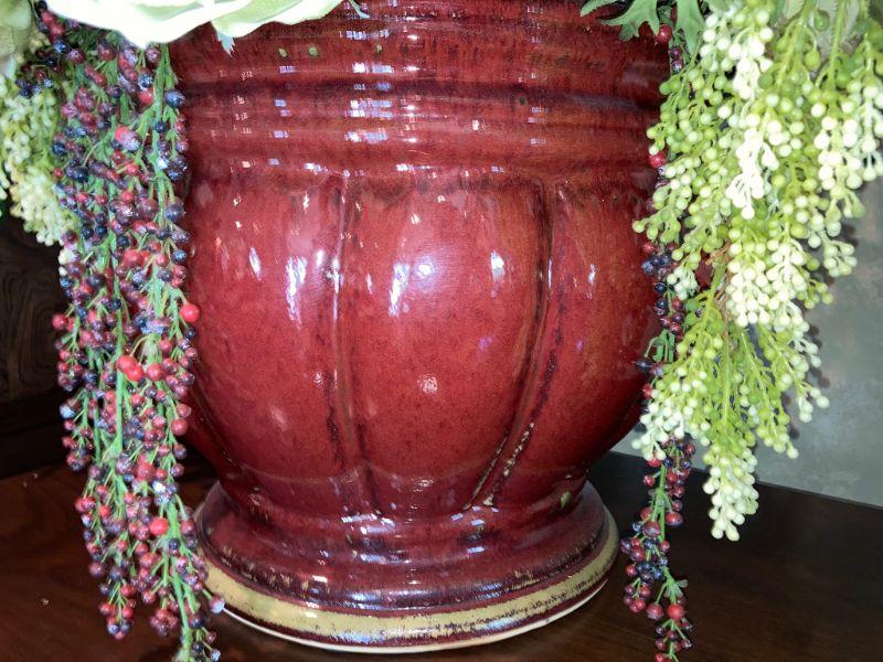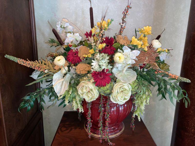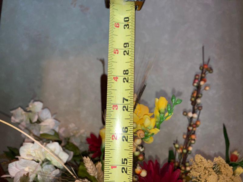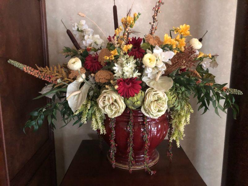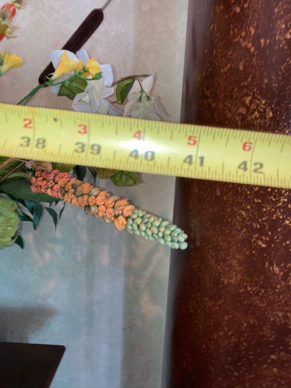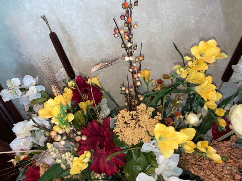 This is one of the prettiest I have seen with cattails, lily;'s and more. This set on a wood pedestal plant stand in the clients home and made the room! It has a heavy pottery vase. Please see the pictures for the flowers in the arrangement, design, and vase condition. Pedestal sold separate in a nearby auctin lot You are bidding on the large faux flower arrangement. See photos for sizing. Good luck and happy bidding!