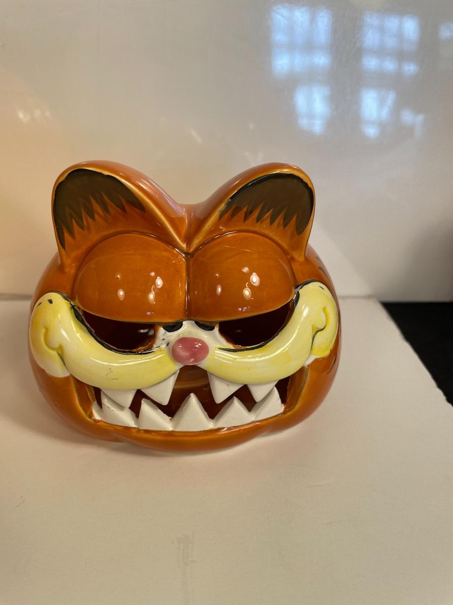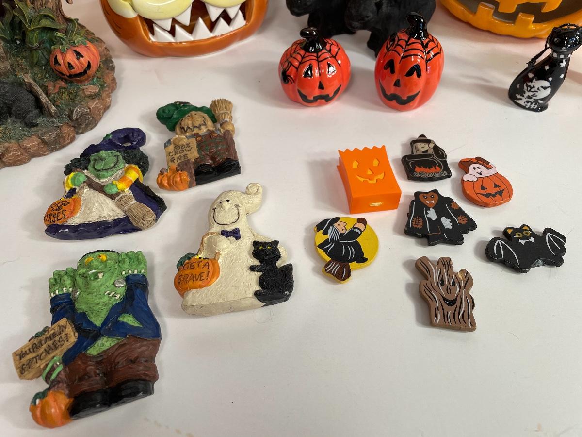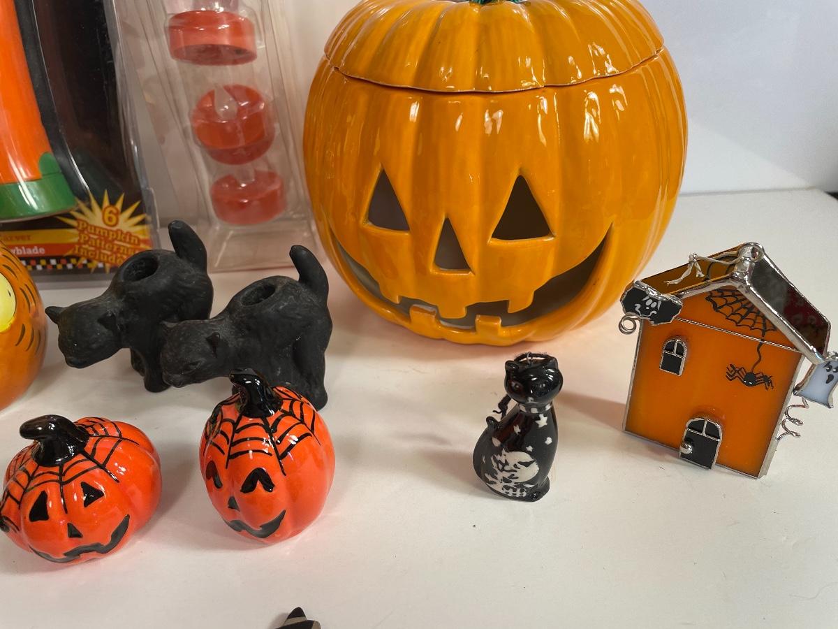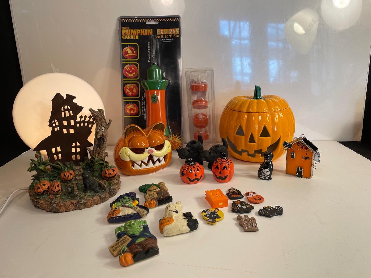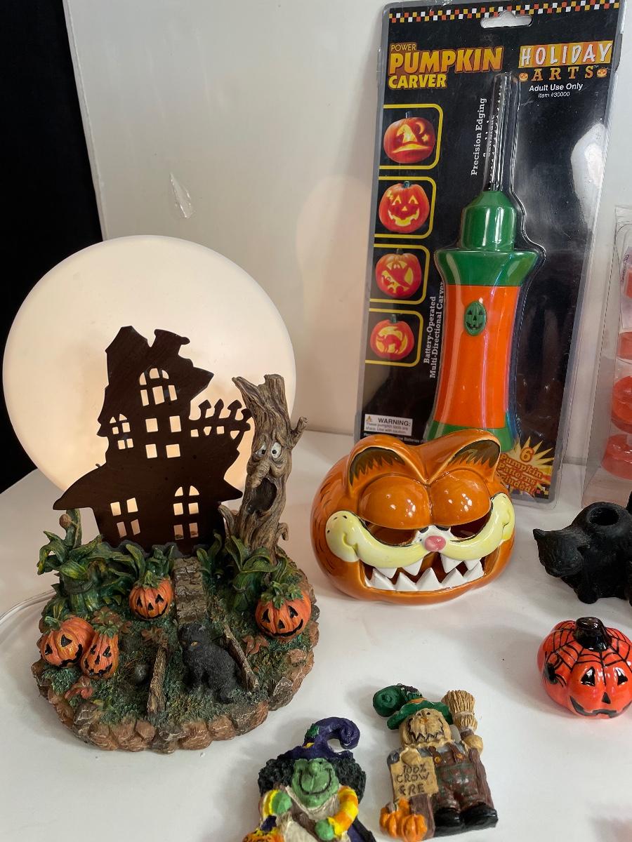 Light up haunted house, ceramic Garfield pumpkin, salt and pepper shaker set, two sets of Halloween magnets, Cat candleholder, Pumpkin Carver, set of tea lights