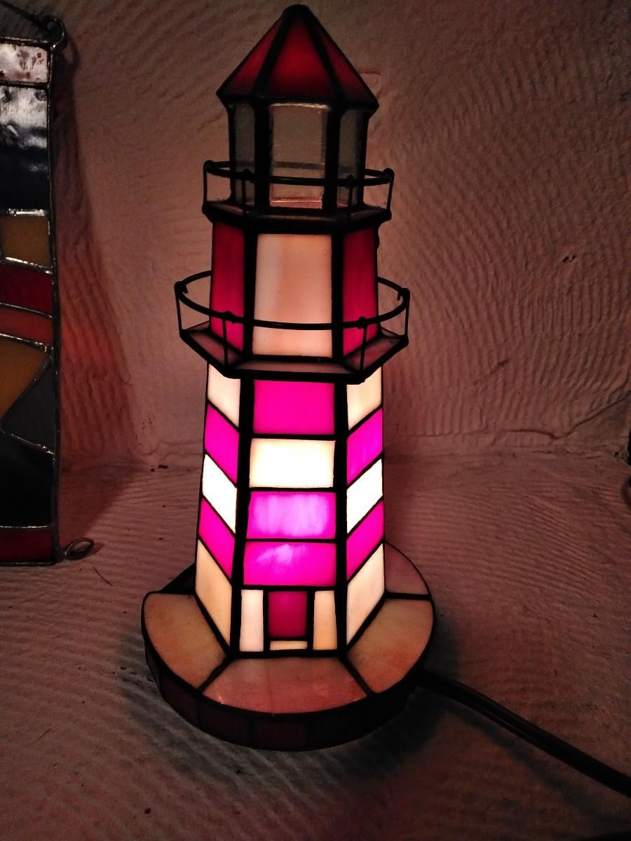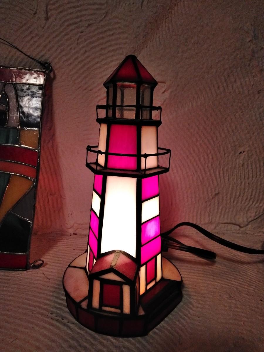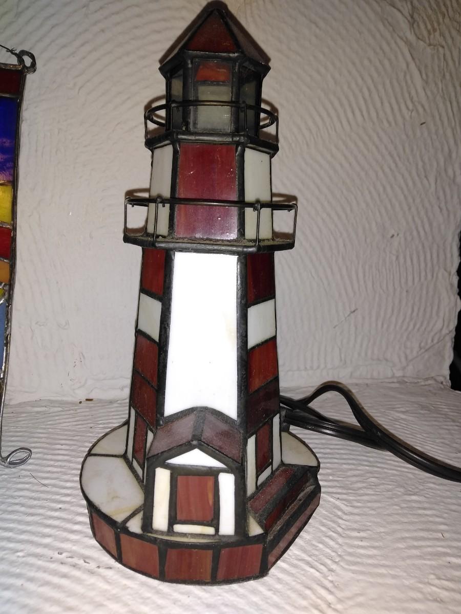 LOT 404 LIGHT HOUSE LAMP AND STAINED GLASS ART