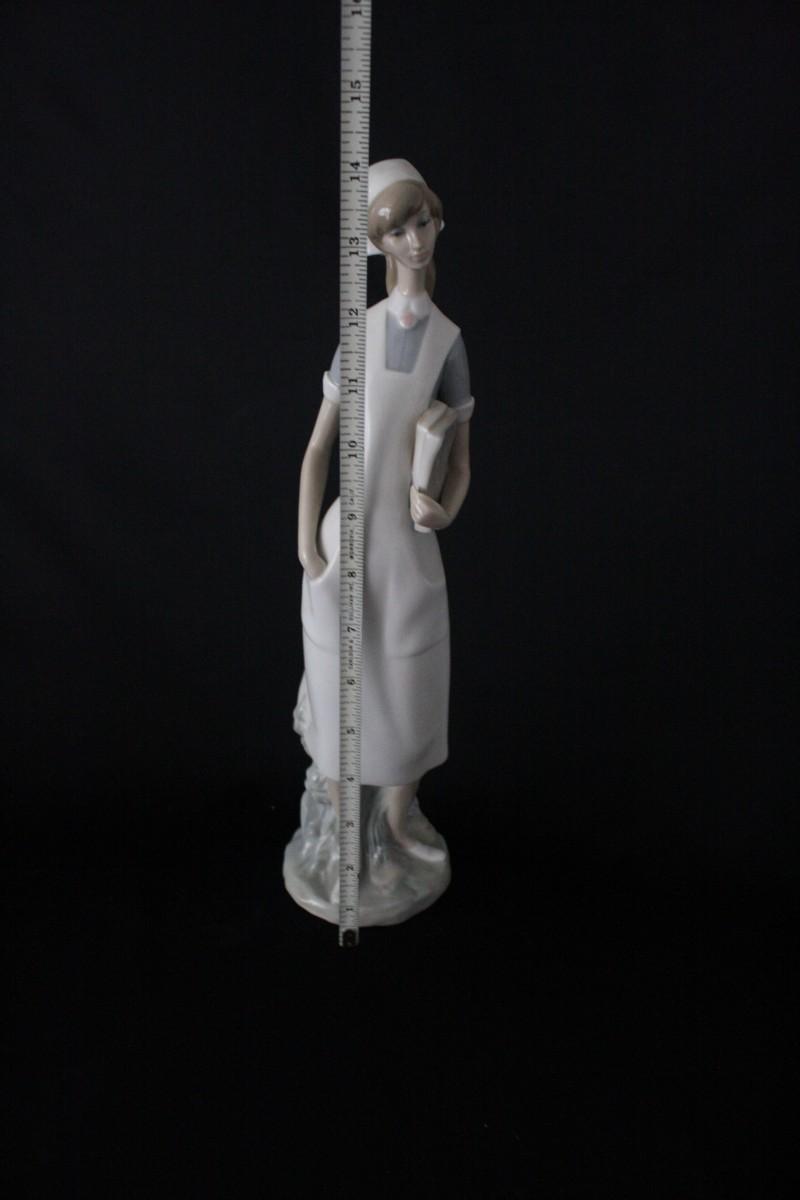 Lladro #4603 Nurse Porcelain Figurine - Painted porcelain figurine of a nurse with books made by Lladro. Double stamped on the bottom with signature Lladro tulip. In excellent condition no chips, cracks, or crazing. Measures 14.5 inches tall.