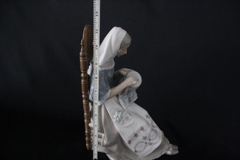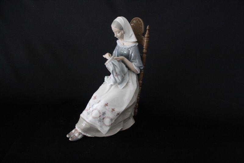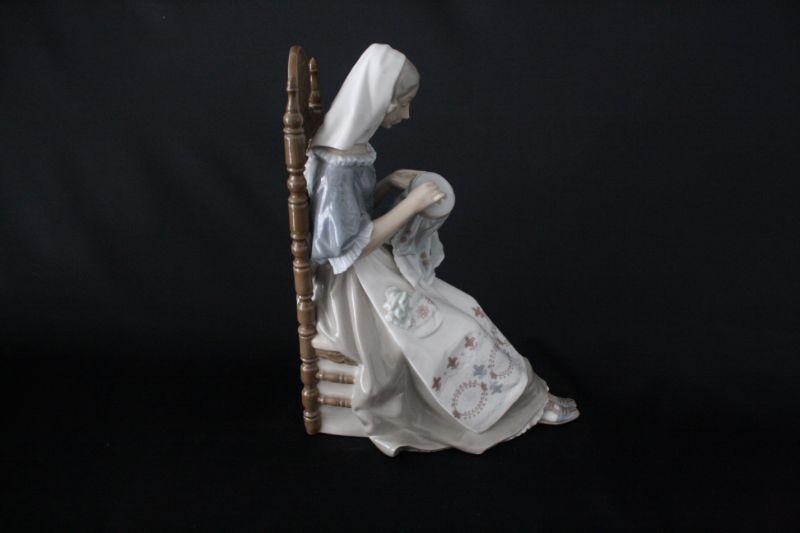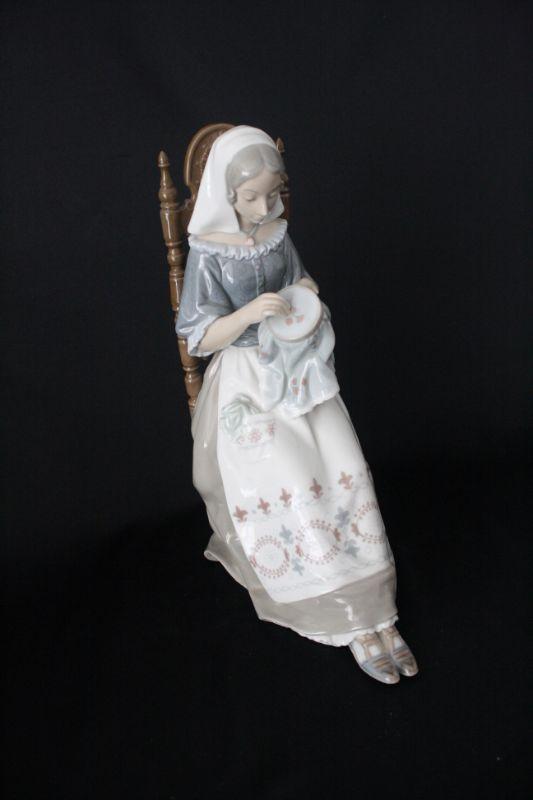 Lladro "The Embroiderer" Porcelain Figurine - Retired 1974-1994 authentic Lladro figurine mint condition, no chips or cracking. Bears the official Lladro blue tulip logo stamp on the bottom. The title of the piece is "The Embroiderer" and depicts a woman sitting in a chair embroidering. Glazed finish. Measures 11.25" high x 8.5" long x 5" wide.