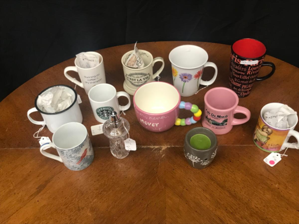 kitchen:lot lot of 10 assorted mugs and cups, 1 silver capped muffineer and 1 scentsy night light warmer;