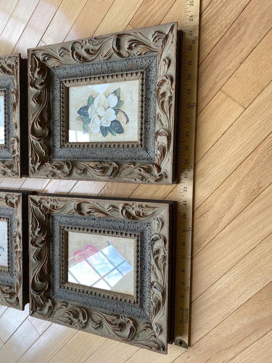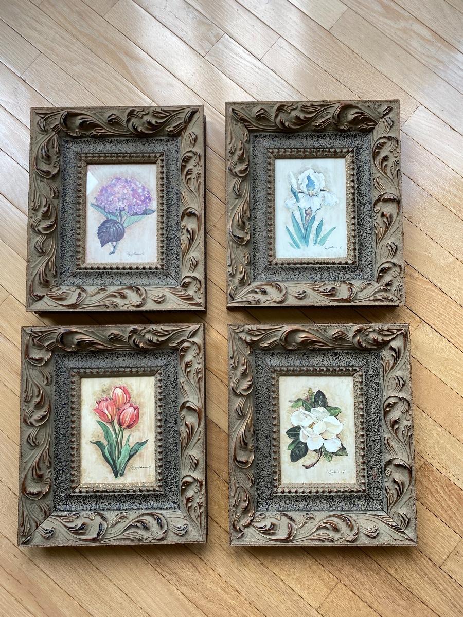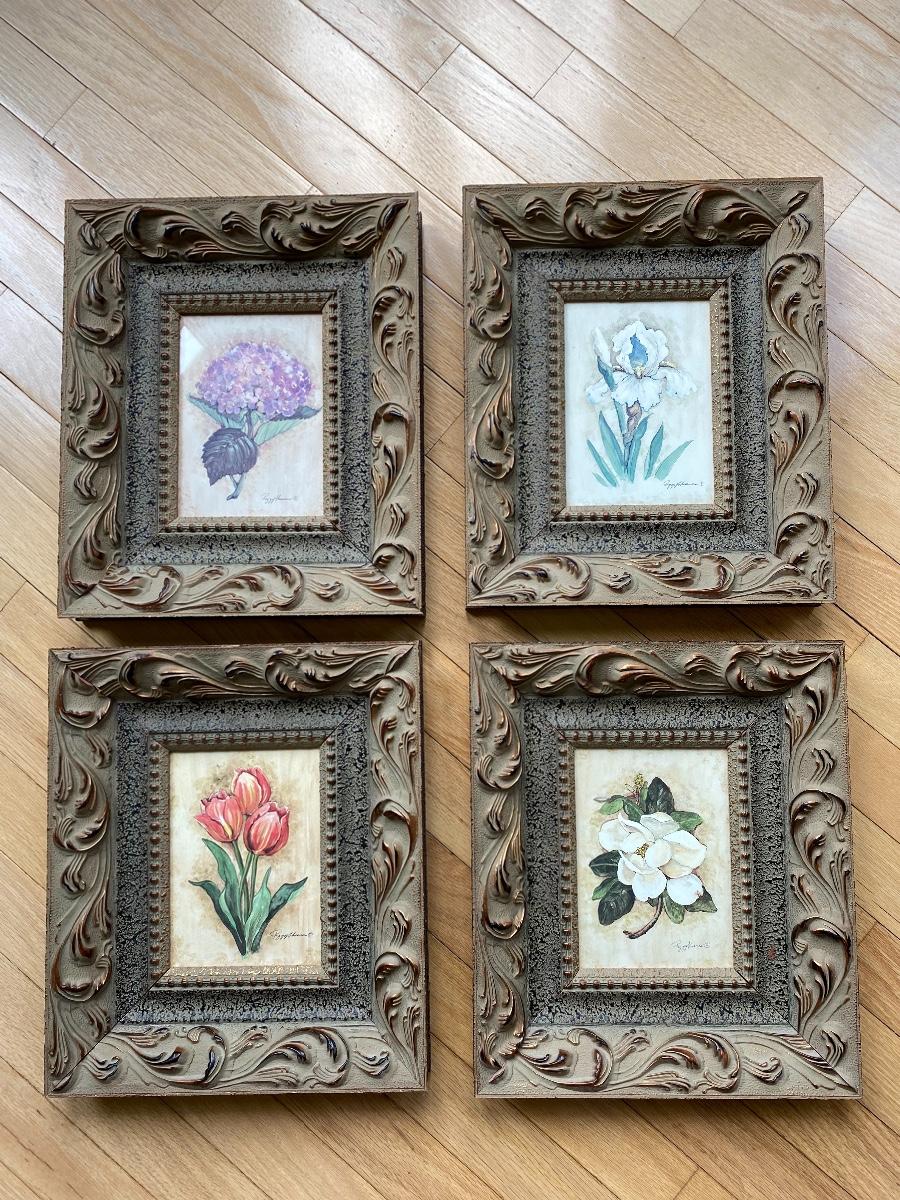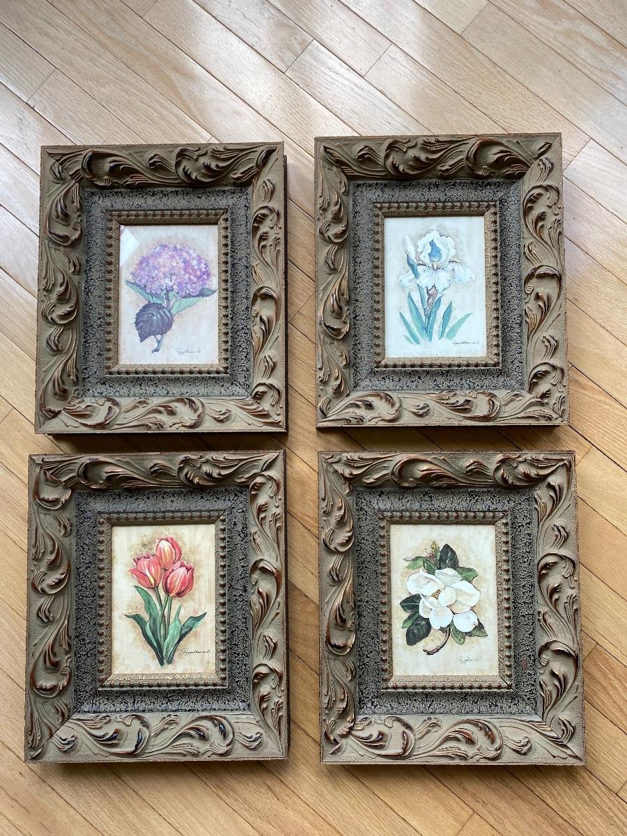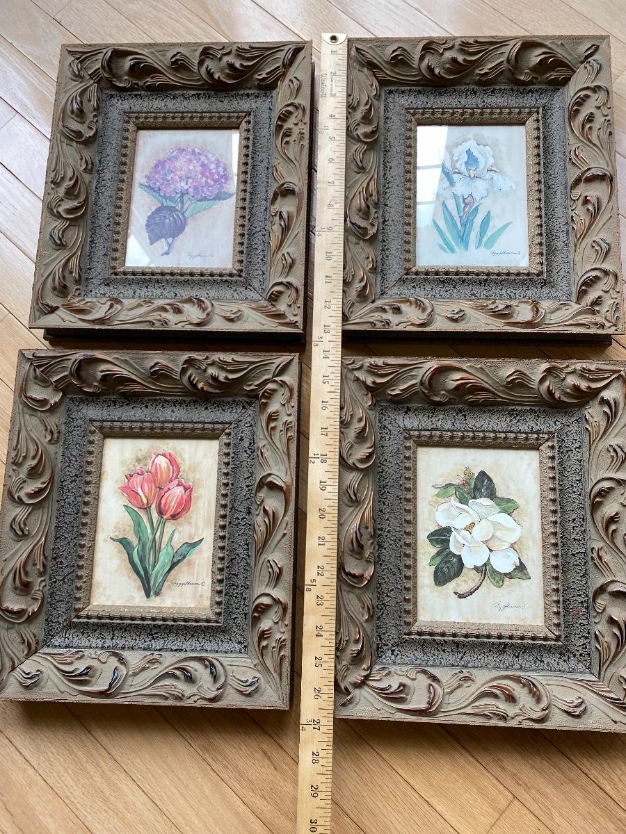 Art by Carolina Mirror. Set of four framed floral prints. Please see all pictures for content of the lot, condition of the lot, and measurements if taken. Pictures are the best representation of the items listed and items are untested unless indicated in description. Thank you for looking and have fun bidding!