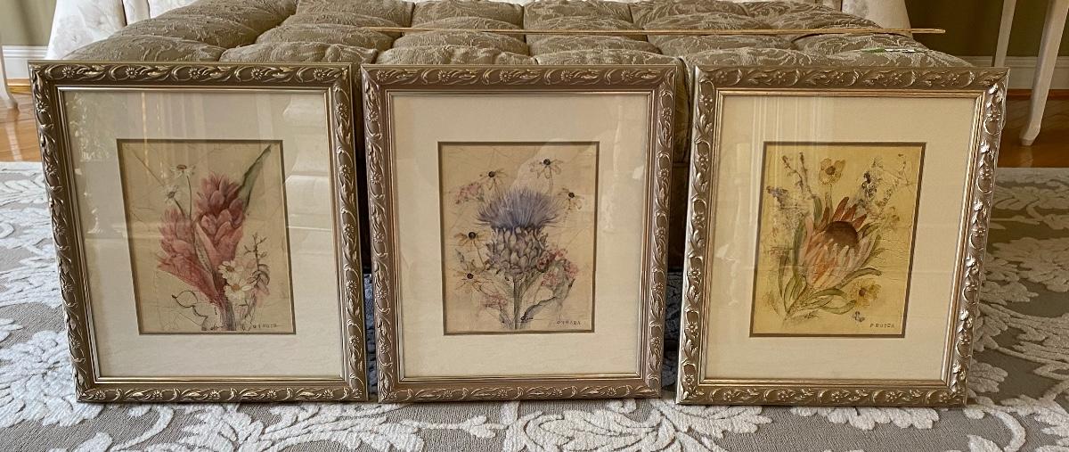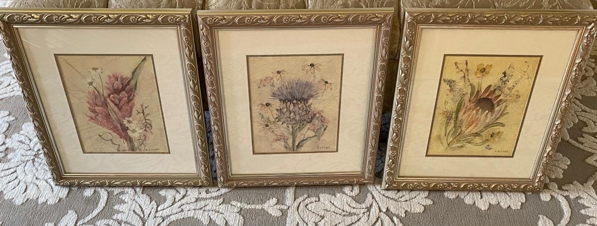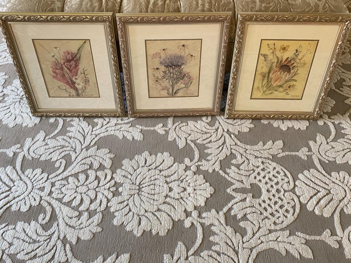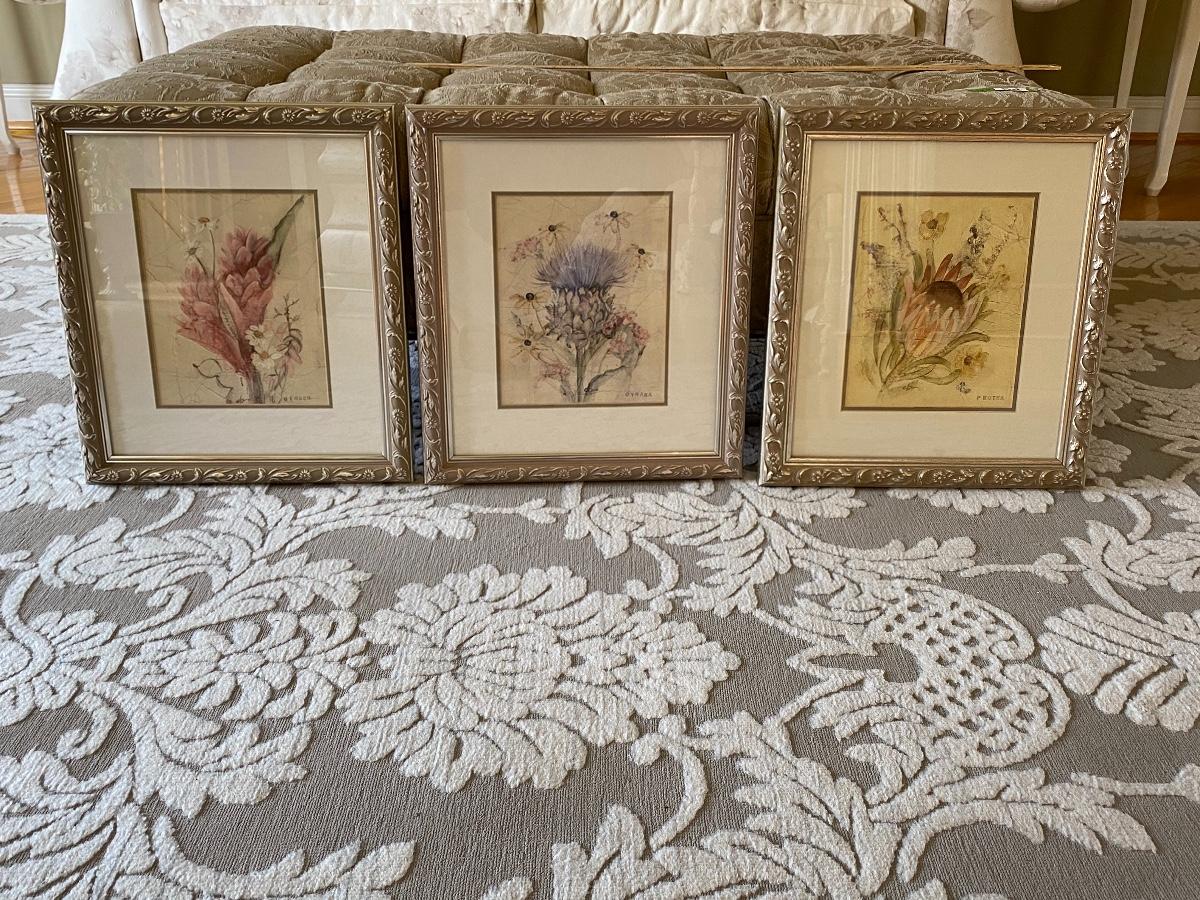Set of three framed prints. 15x18. Beautiful Floral designs. Please see all pictures for content of the lot, condition of the lot, and measurements if taken. Pictures are the best representation of the items listed and items are untested unless indicated in description. Thank you for looking and have fun bidding!